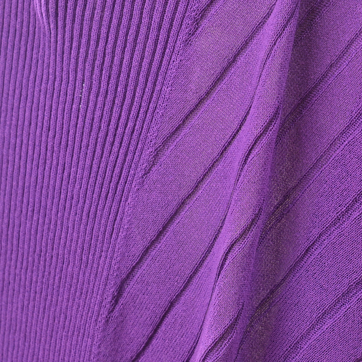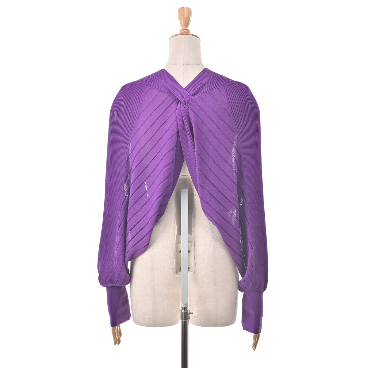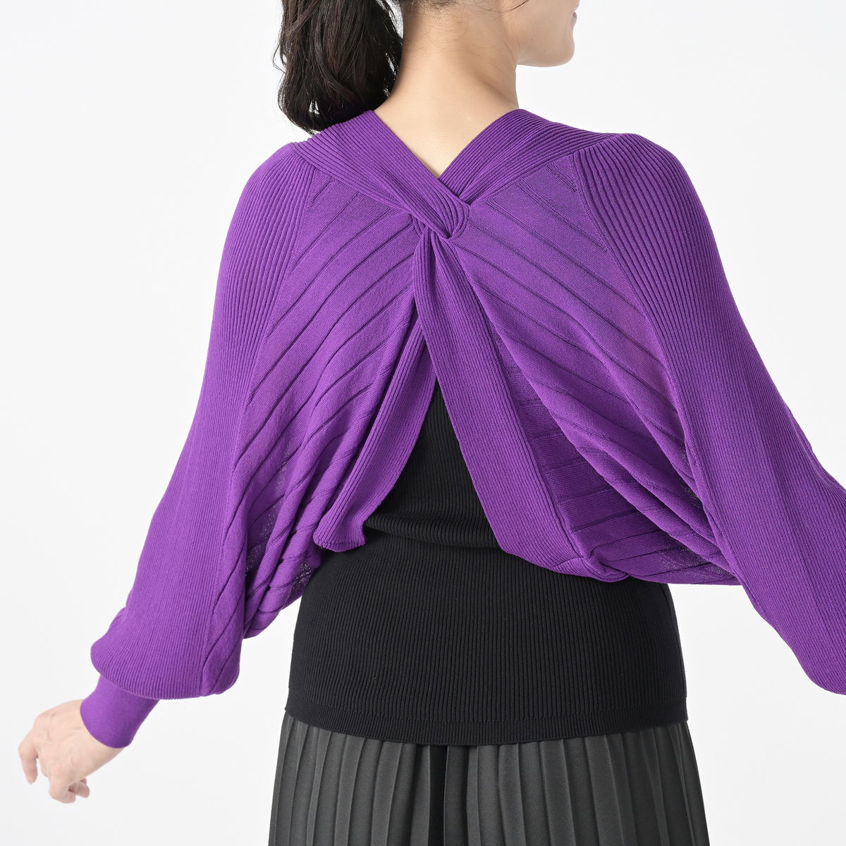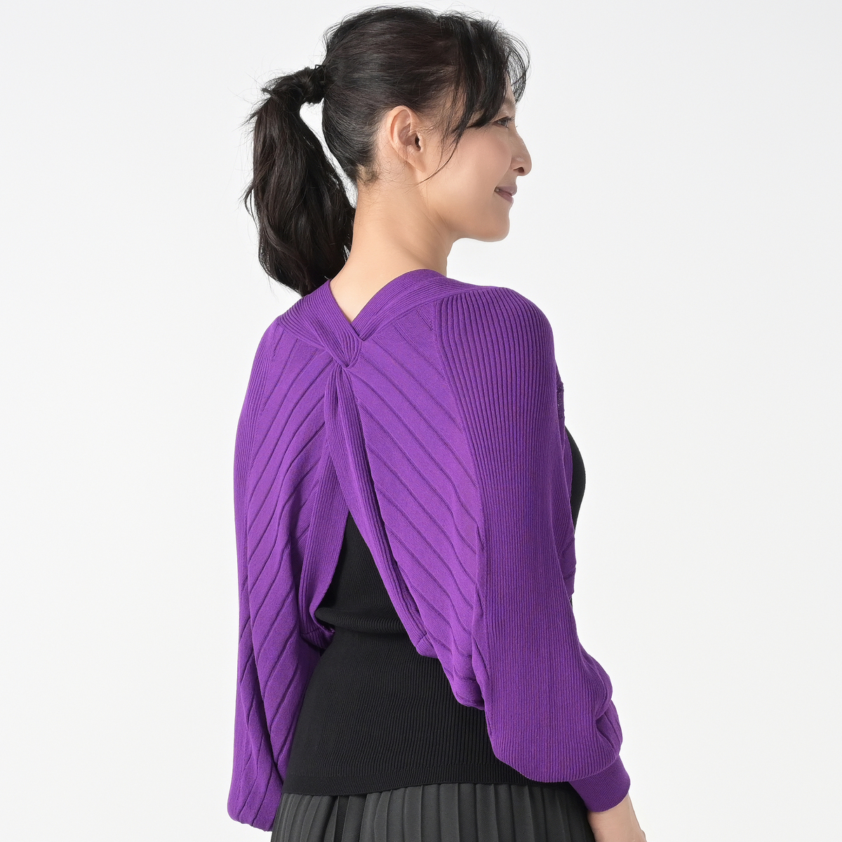 リブ編みテープを後ろでツイストし、後ろ姿にXラインを作りスタイルアップを狙ったデザイン。袖口はすっきりとしたパフスリーブ仕立てで、細部までこだわりが感じられます