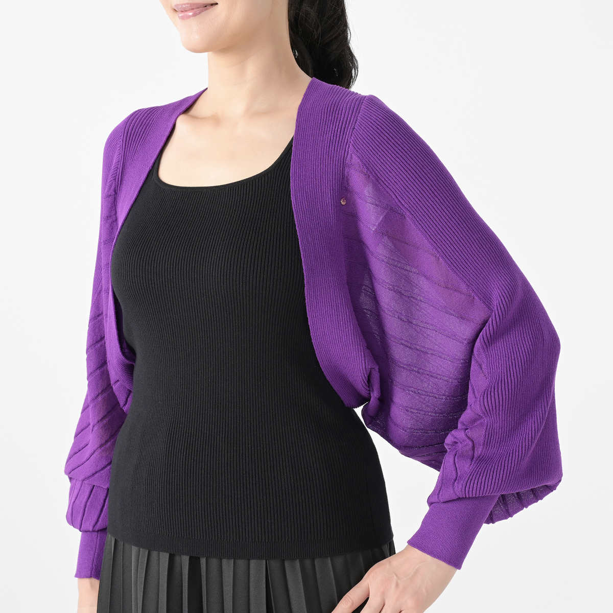 麻ライクの糸を使い、シャリ感とドライなタッチが心地よいニットボレロです。ウエスト上の短め丈と開襟式のシルエットが、軽やかさと抜け感をプラス。ジャケットよりも柔らかく、気軽に取り入れられます