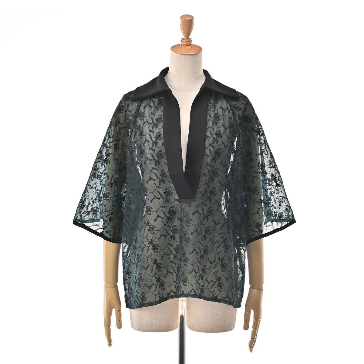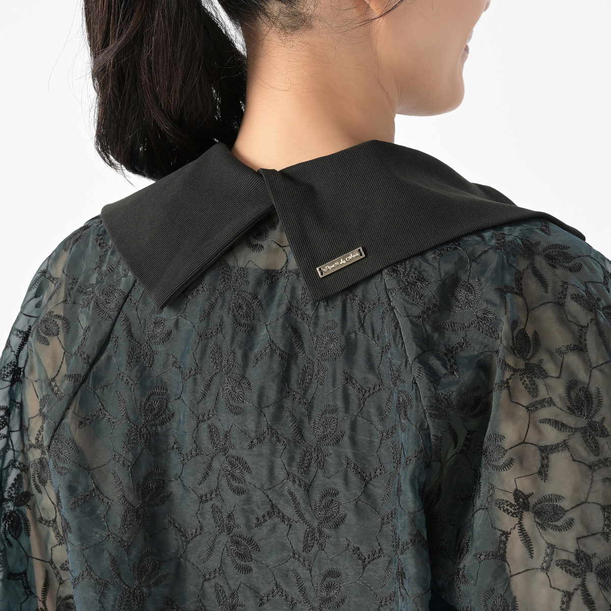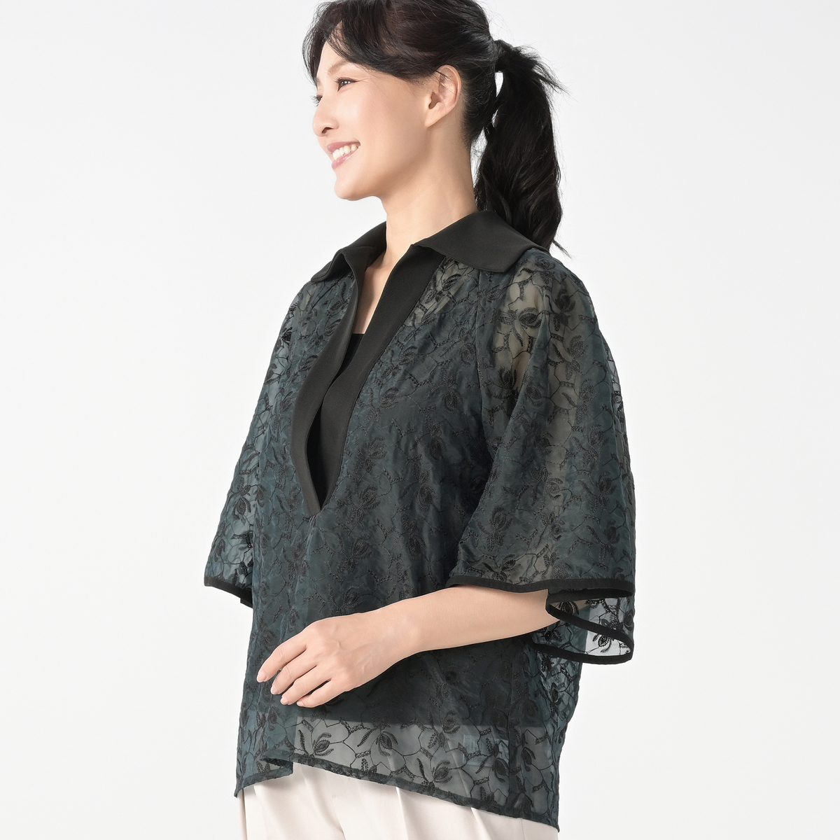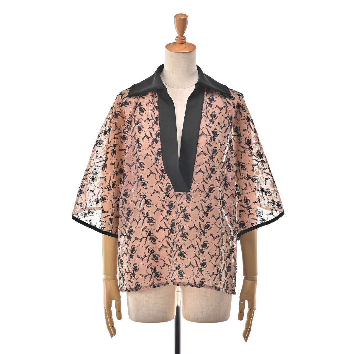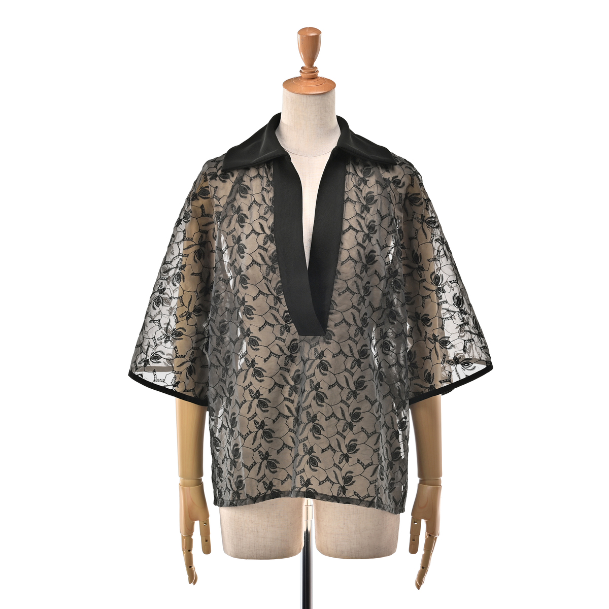 透け感とハリコシが特徴のオーガンジー生地を使用。スパン糸使いの総柄刺繍を施したエンブロイダリーレースのブラウスで、爽やかな透け感と豪華な刺繍を楽しめる生地使いです。黒糸使いの刺繍に合わせて黒のテレコを衿などに部分使いし、引き締め効果を狙いました