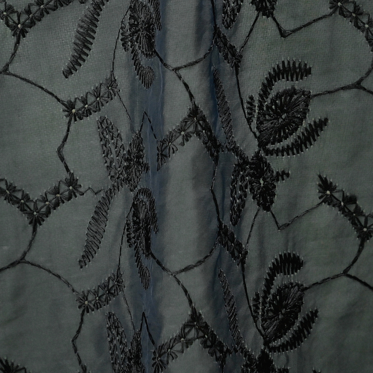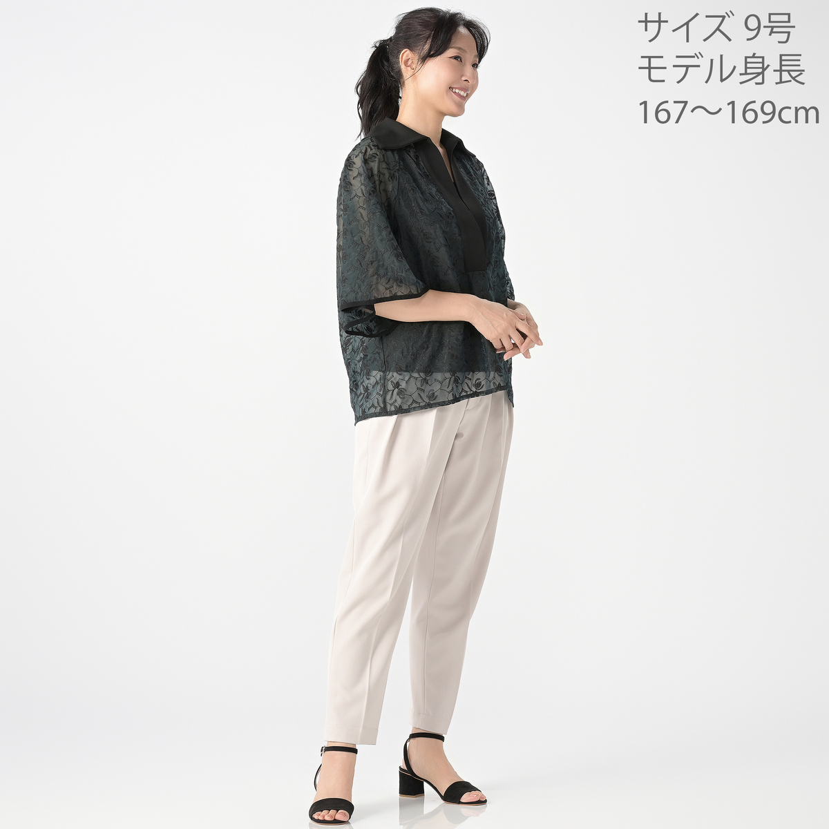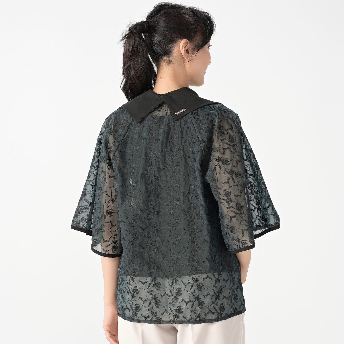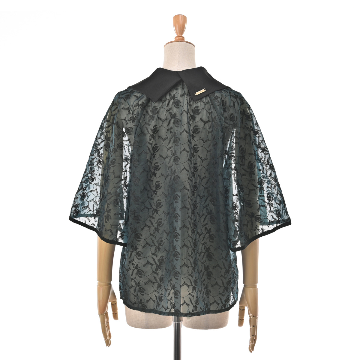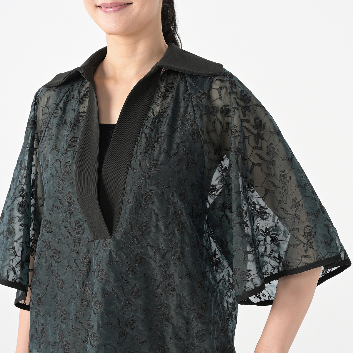 透け感とハリコシが特徴のオーガンジー生地を使用。スパン糸使いの総柄刺繍を施したエンブロイダリーレースのブラウスで、爽やかな透け感と豪華な刺繍を楽しめる生地使いです。黒糸使いの刺繍に合わせて黒のテレコを衿などに部分使いし、引き締め効果を狙いました