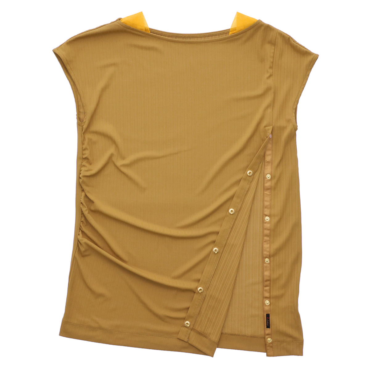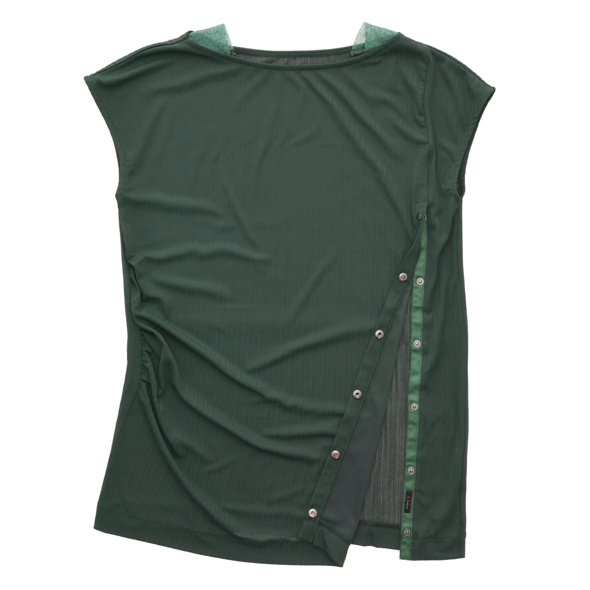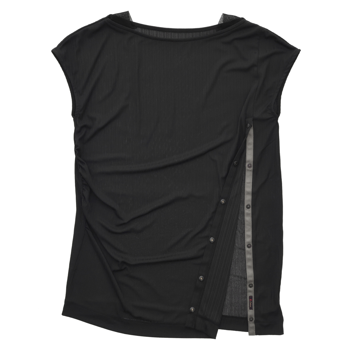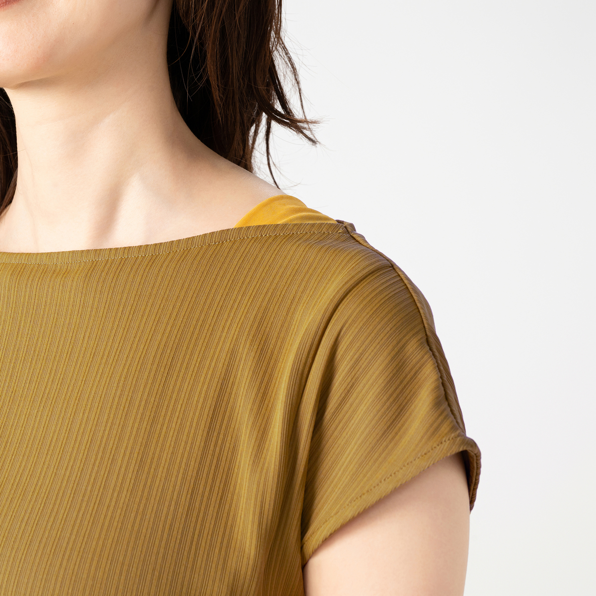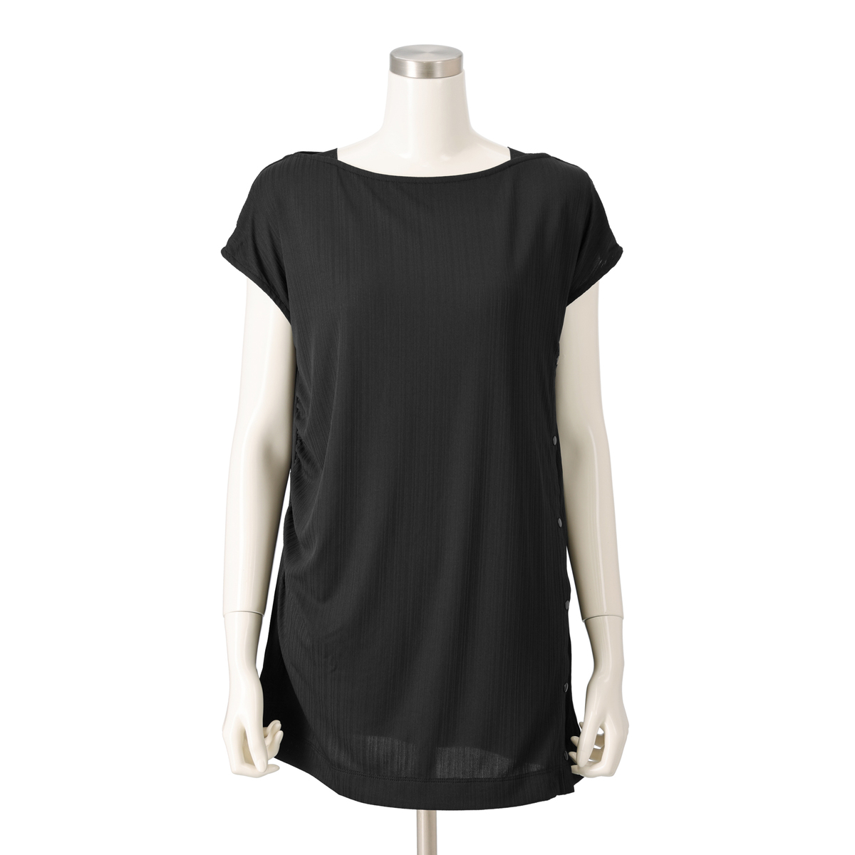 ボートネックにチュールを重ね、デコルテをきれいに見せながら下着のラインが見えないようにさりげなくカバー。右脇のギャザーや左切り替えのドットボタン、斜めのヘムラインが大人のモード感を演出し、ウエストまわりも自然にカバーします