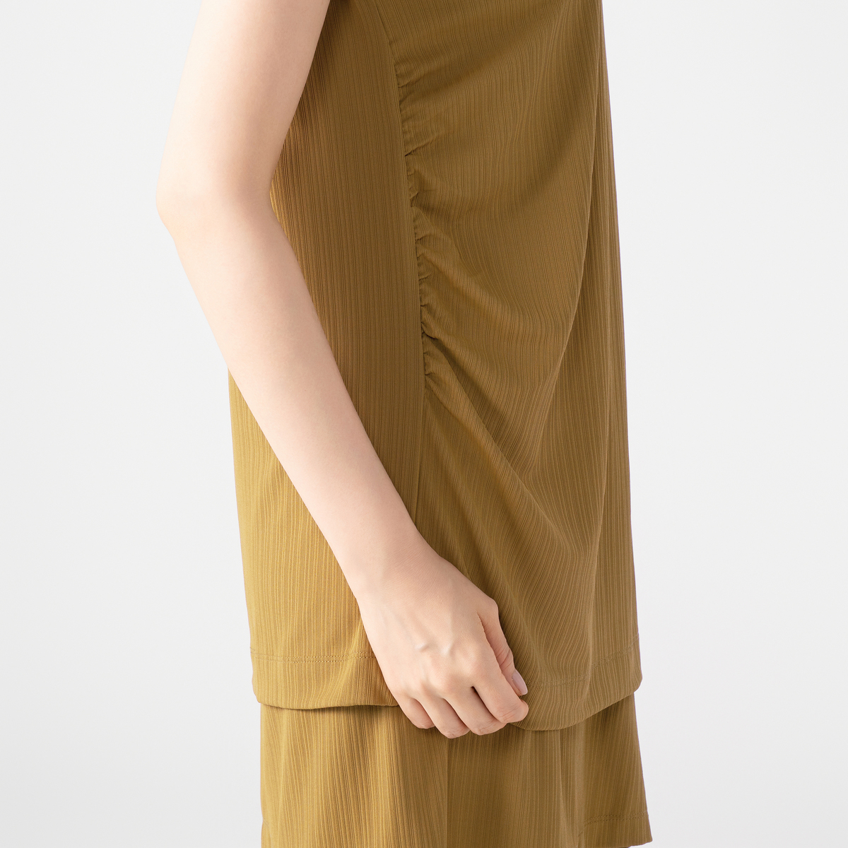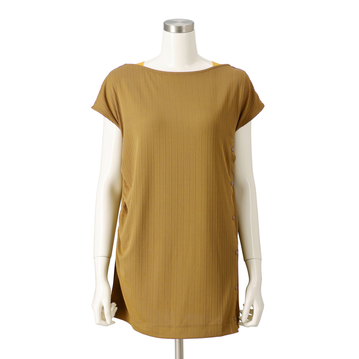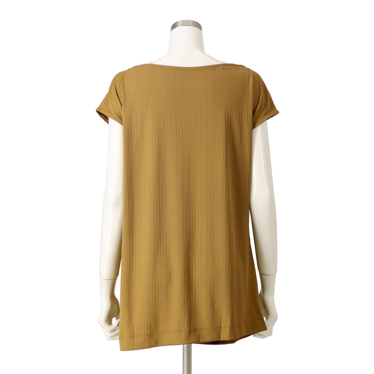 針抜きフライスのカットソー生地を使い、ほどよいツヤ感とたて畝のある表面で表情のあるロングチュニック。肌に触れた時に心地よさを感じる接触冷感効果のある糸を採用しています