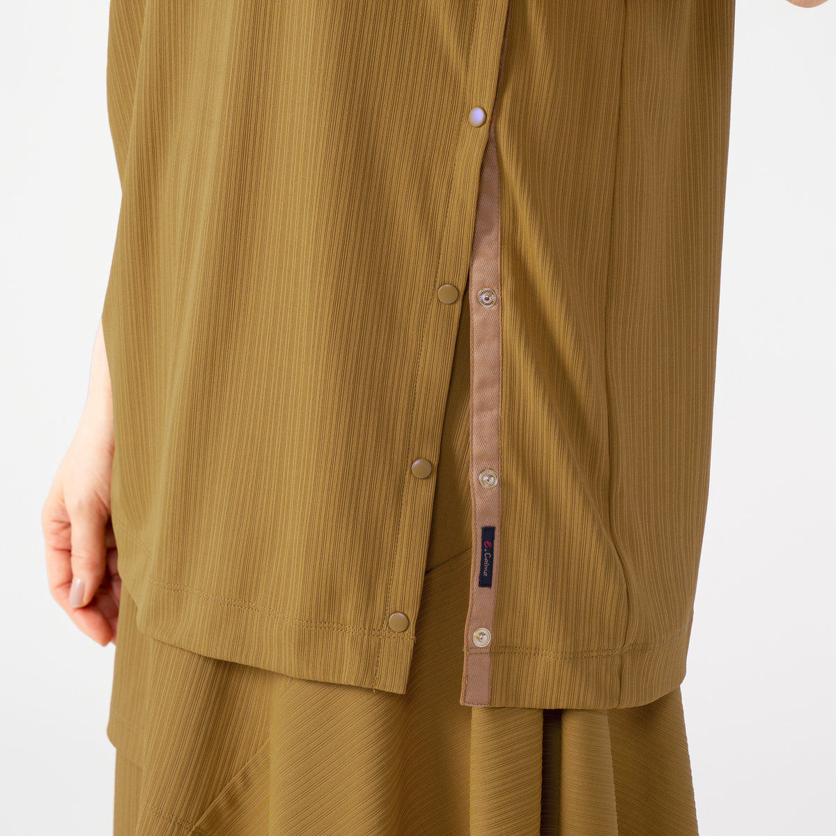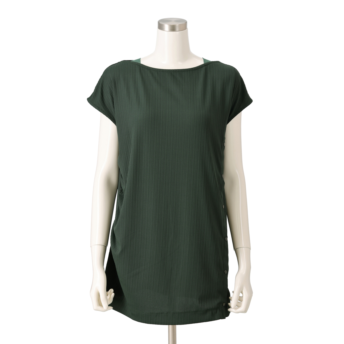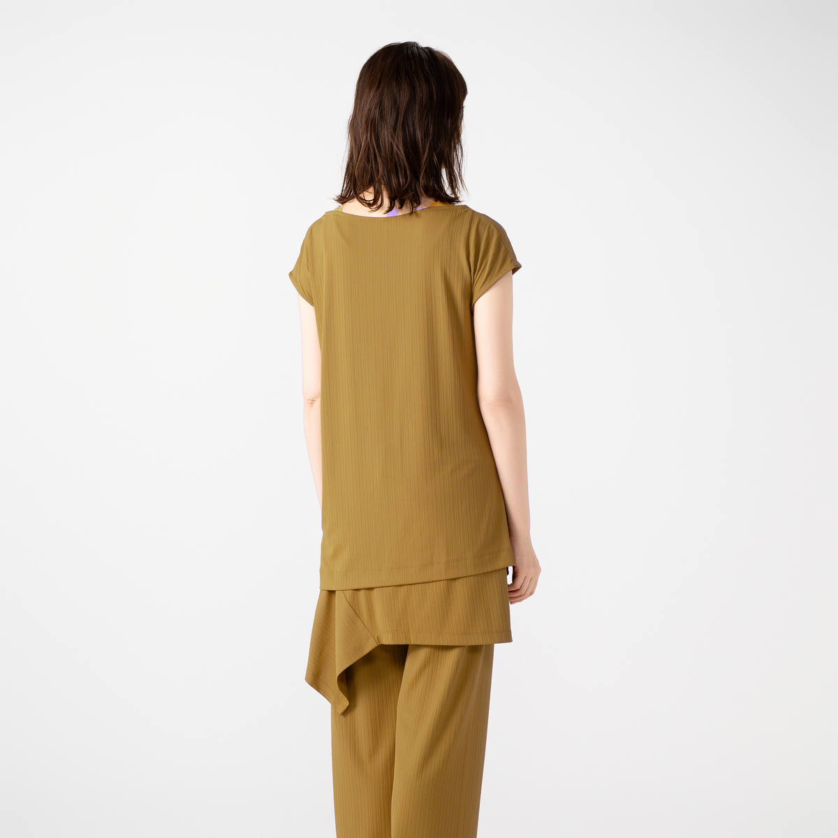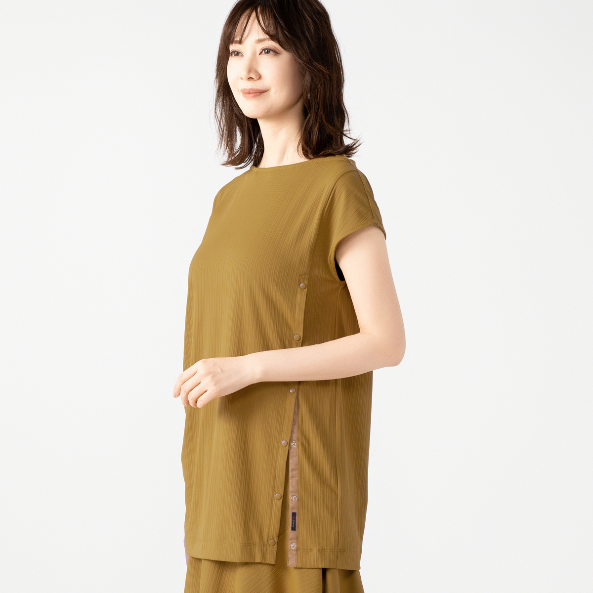 針抜きフライスのカットソー生地を使い、ほどよいツヤ感とたて畝のある表面で表情のあるロングチュニック。肌に触れた時に心地よさを感じる接触冷感効果のある糸を採用しています