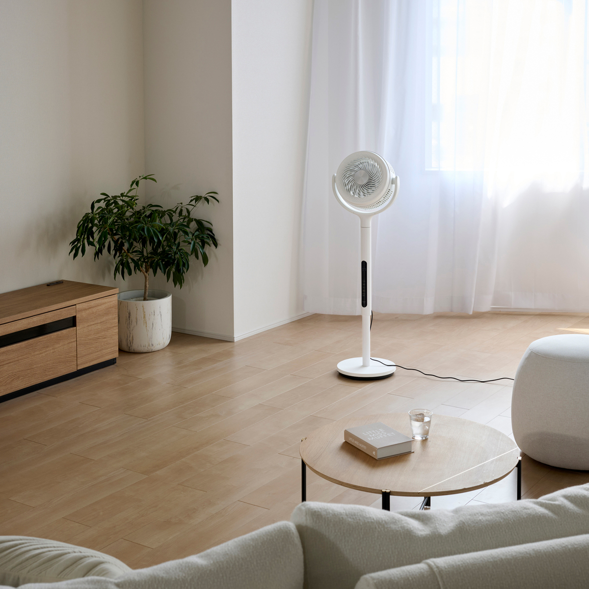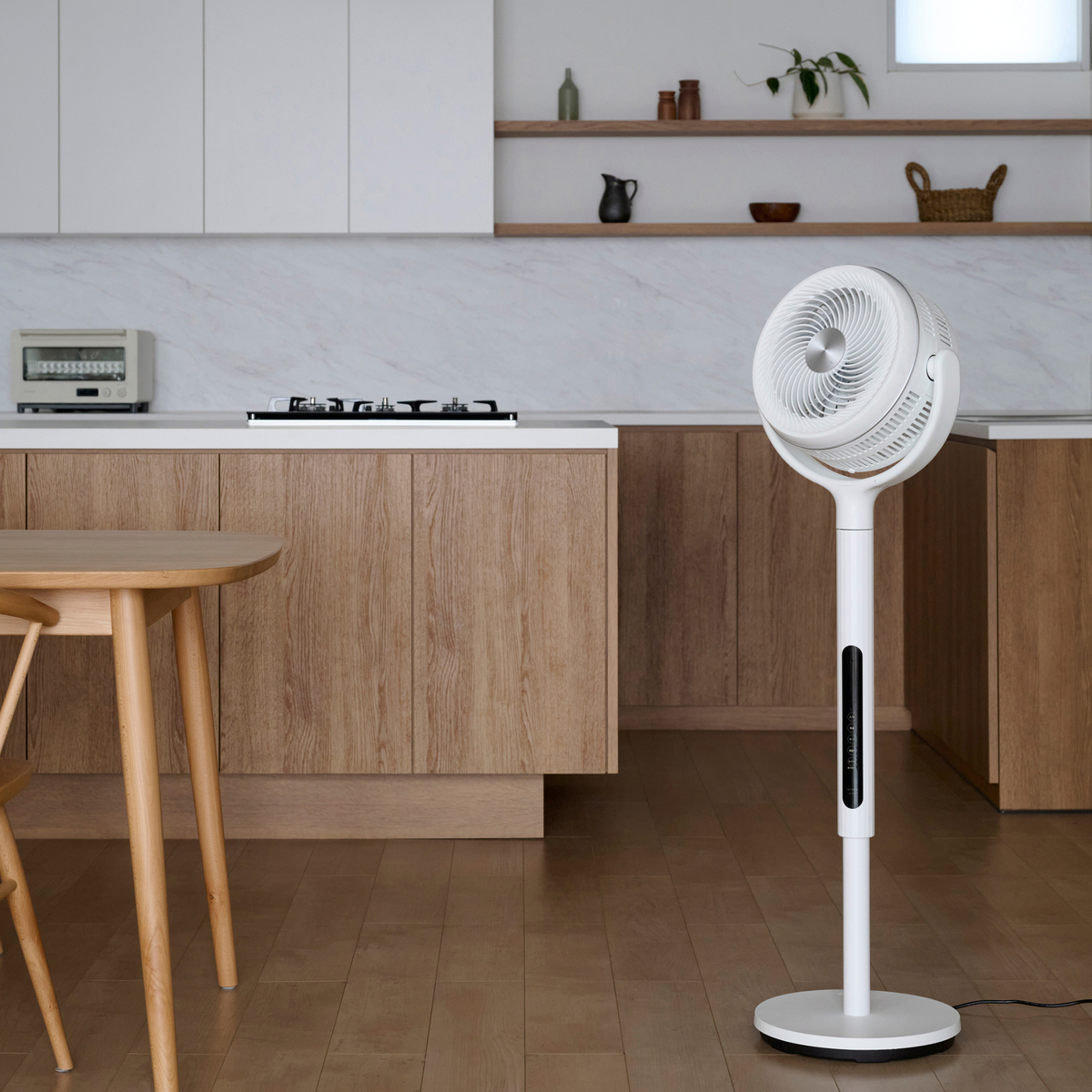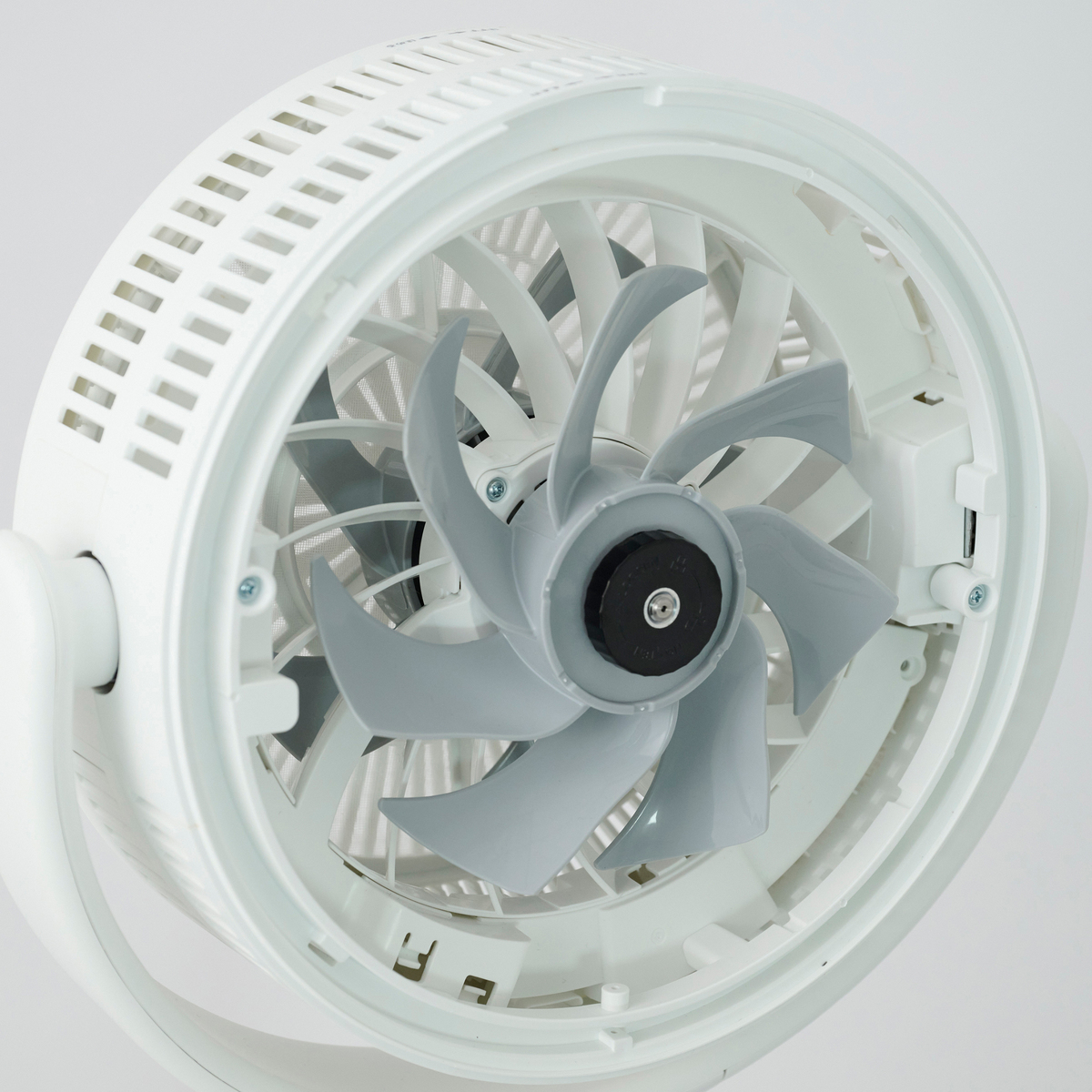 背面にモーターがないことで、上下の首振り角度も広範囲。3D首振りで部屋中の空気をかくはんし、サーキュレーターとしても活躍します(首振り角度:上下60°/135°、左右60°/120°)