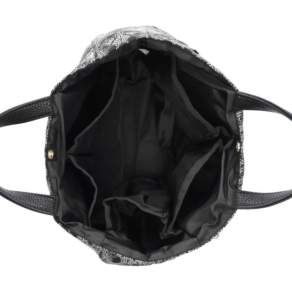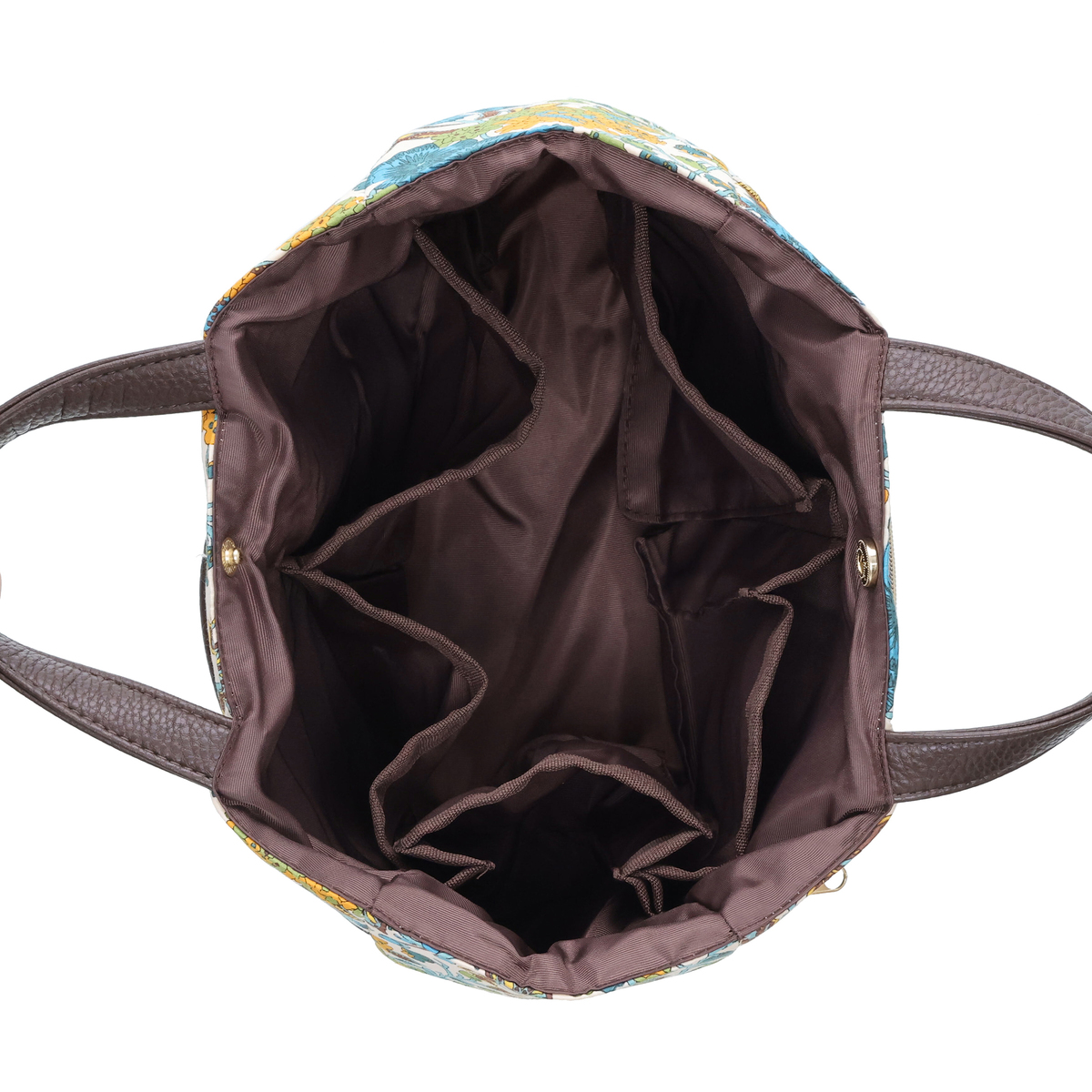 [サイズ(約)] 縦16×横31(上部)21(下部)×マチ10cm ハンドル立ち上がり:7cm [重量(約)] 105g [素材] 表地:綿100% 皮革部分:合成皮革 裏地:ポリエステル100% [仕様] 開閉:スナップボタン式 底ビョウ:無 [ポケット] 内側:オープンポケット×5 外側:オープンポケット×2 ファスナーポケット×1 [注意事項] ※洗濯はお避けください ※濡れた物を直接入れますと色落ちする事がありますのでご注意ください ※この製品は一部に合成皮革を使用しています ※色落ちや硬化の原因になりますので、濡れたまま放置しないでください ※水に濡れた場合は、柔らかい布等で素早く水気を取り、陰干ししてください ※汚れた場合には、湿らせた布で軽くふき取り、乾いた布で拭き上げてください ※ベンジン類のご使用はお避けください ※素材の特性上、時間経過による劣化(経時変化)が起こる恐れがあります ※収納の際は汚れを落としてから、高温多湿の場所を避け、直射日光の当たらない場所で保管し、他のものと重ね置きはしないでください 【中国製】