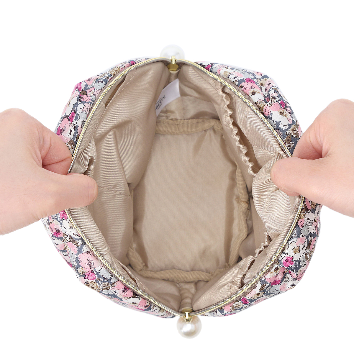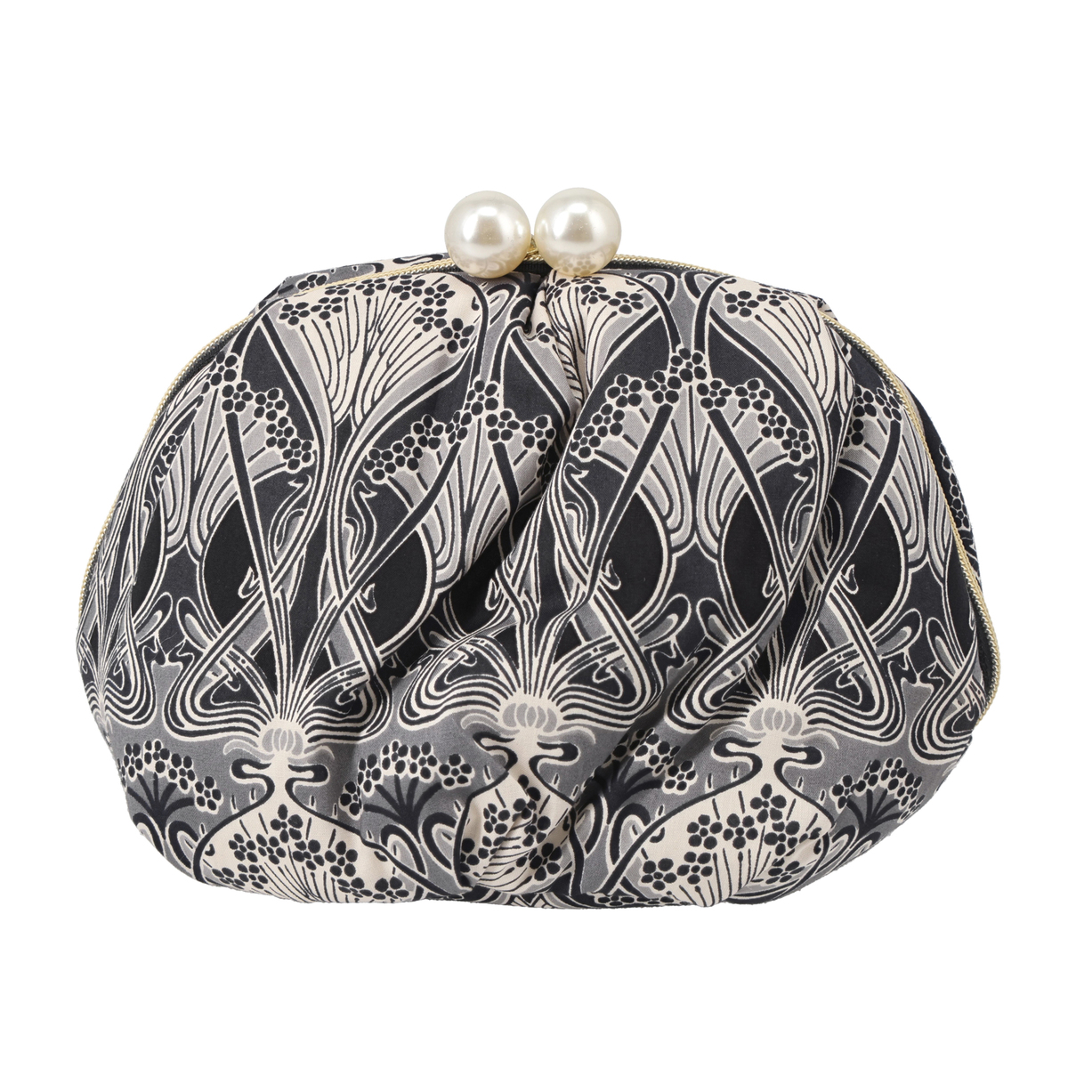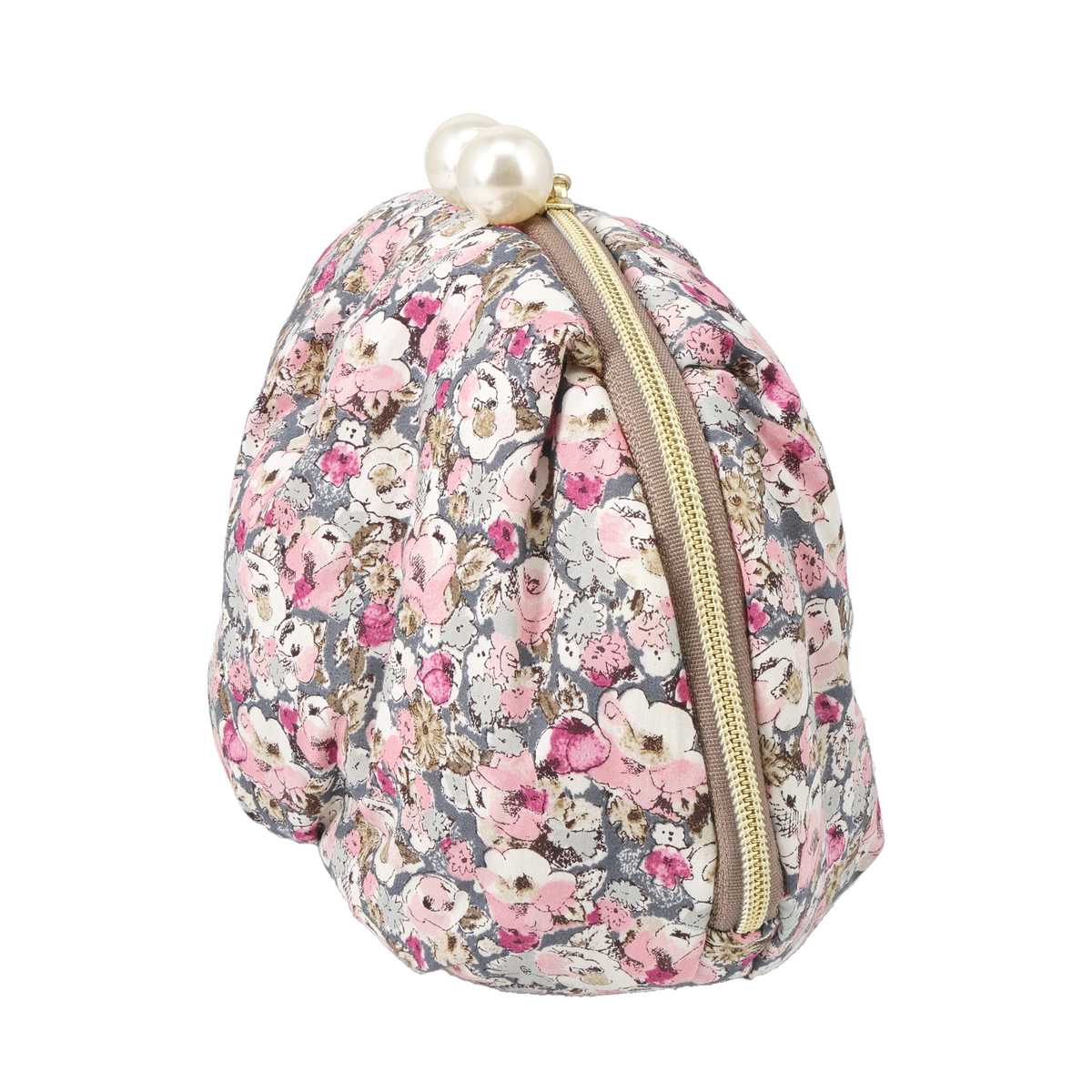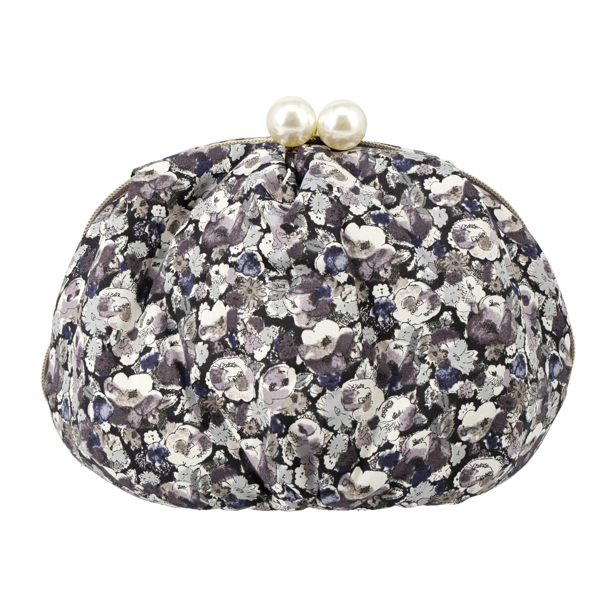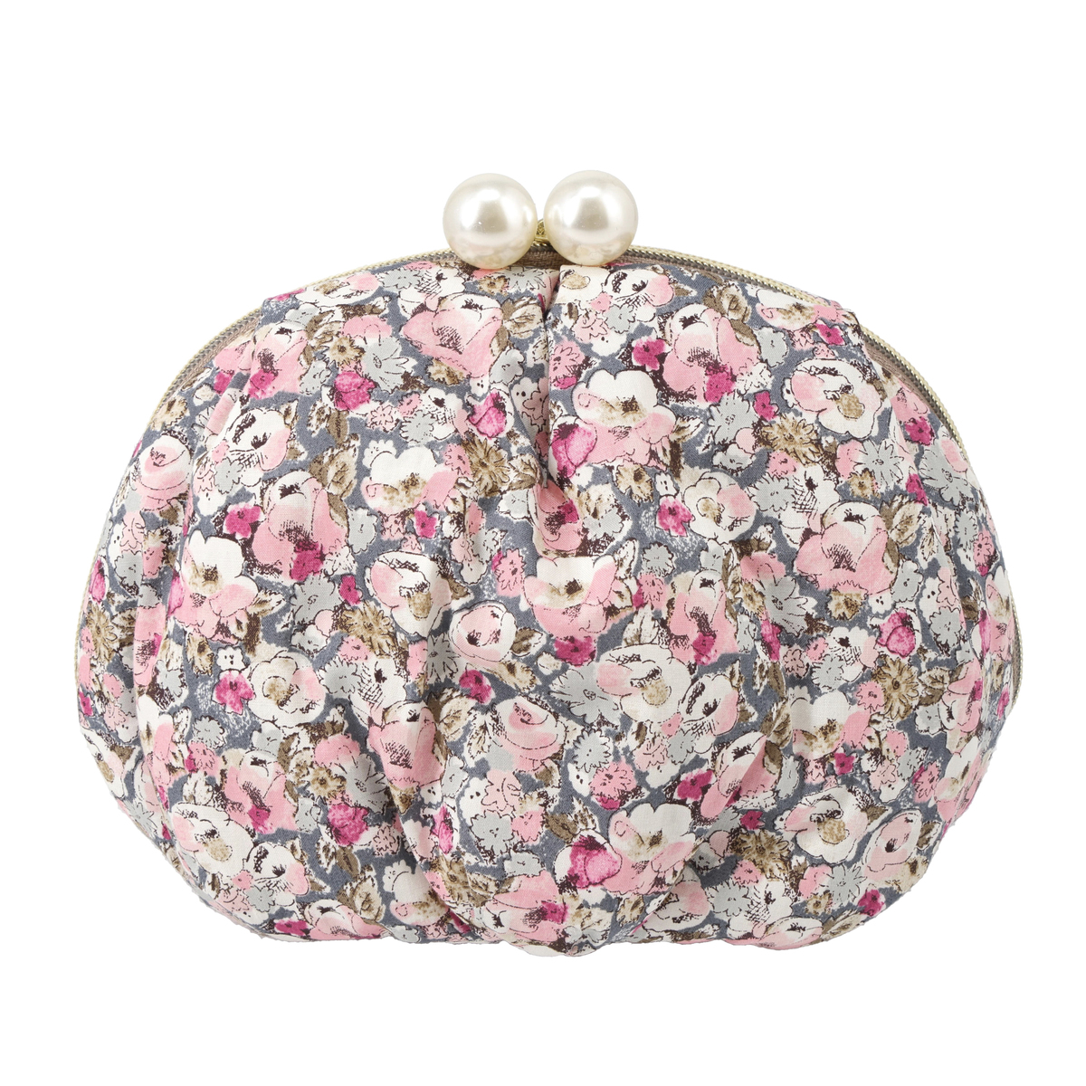 ギャザーをたっぷり寄せた丸みのある形を手に取ると、今まで購入したリバティの中で1番タナローンを贅沢に味わえるポーチです。ファスナーについたパールも可愛らしく、また、ポーチ内の収納力はしっかりあり使いやすいです。