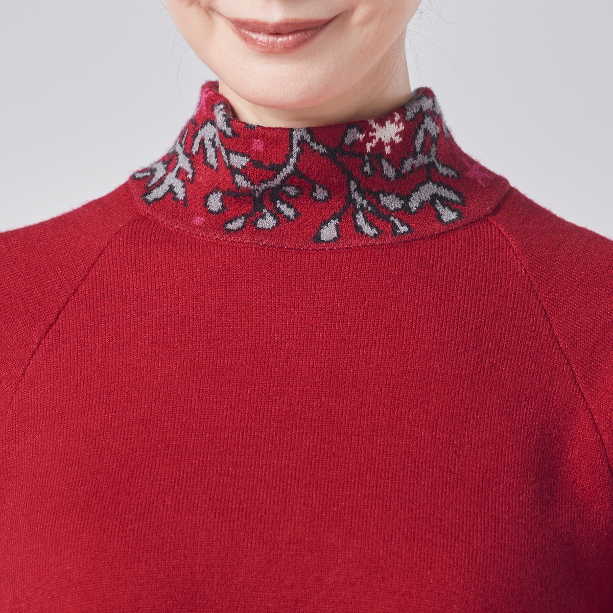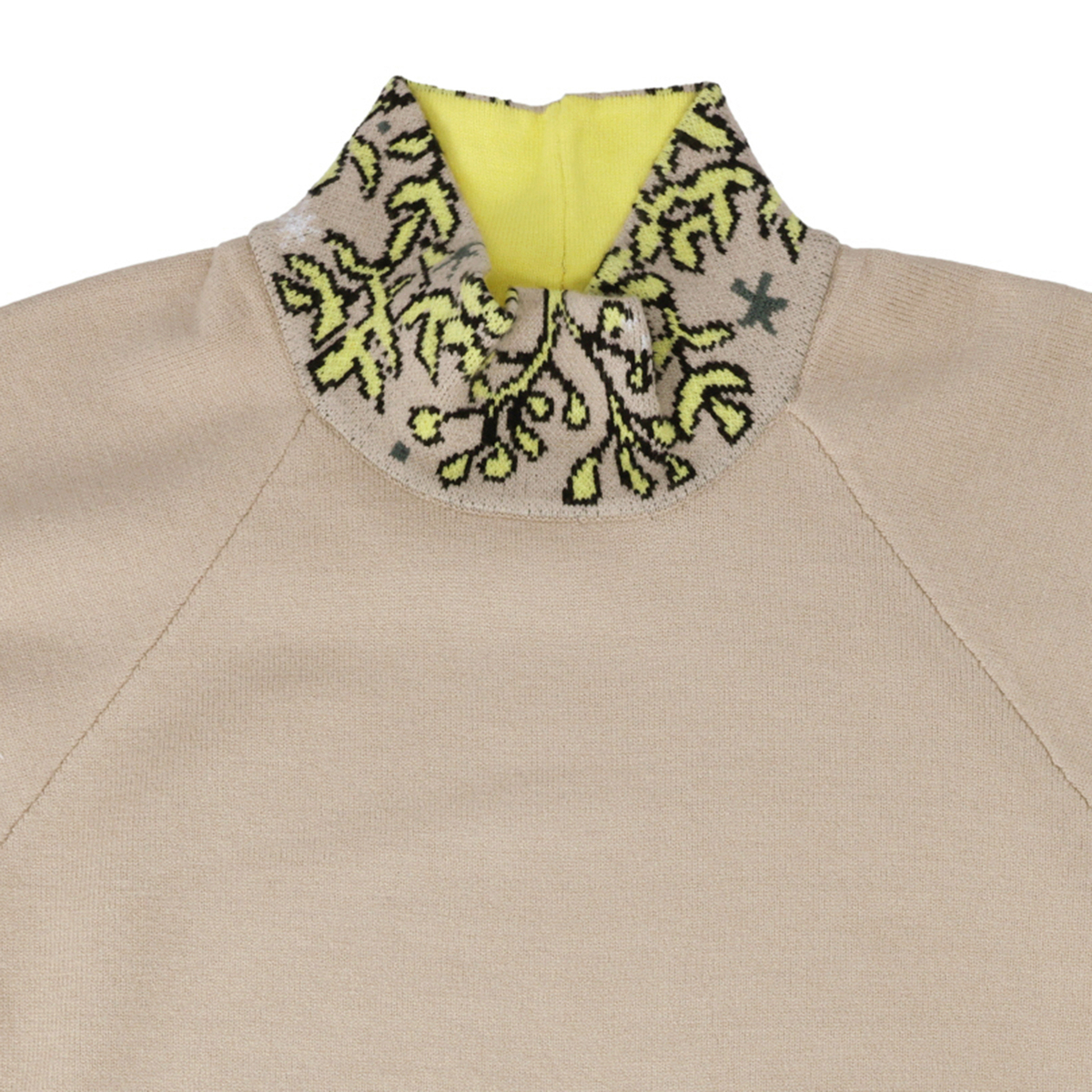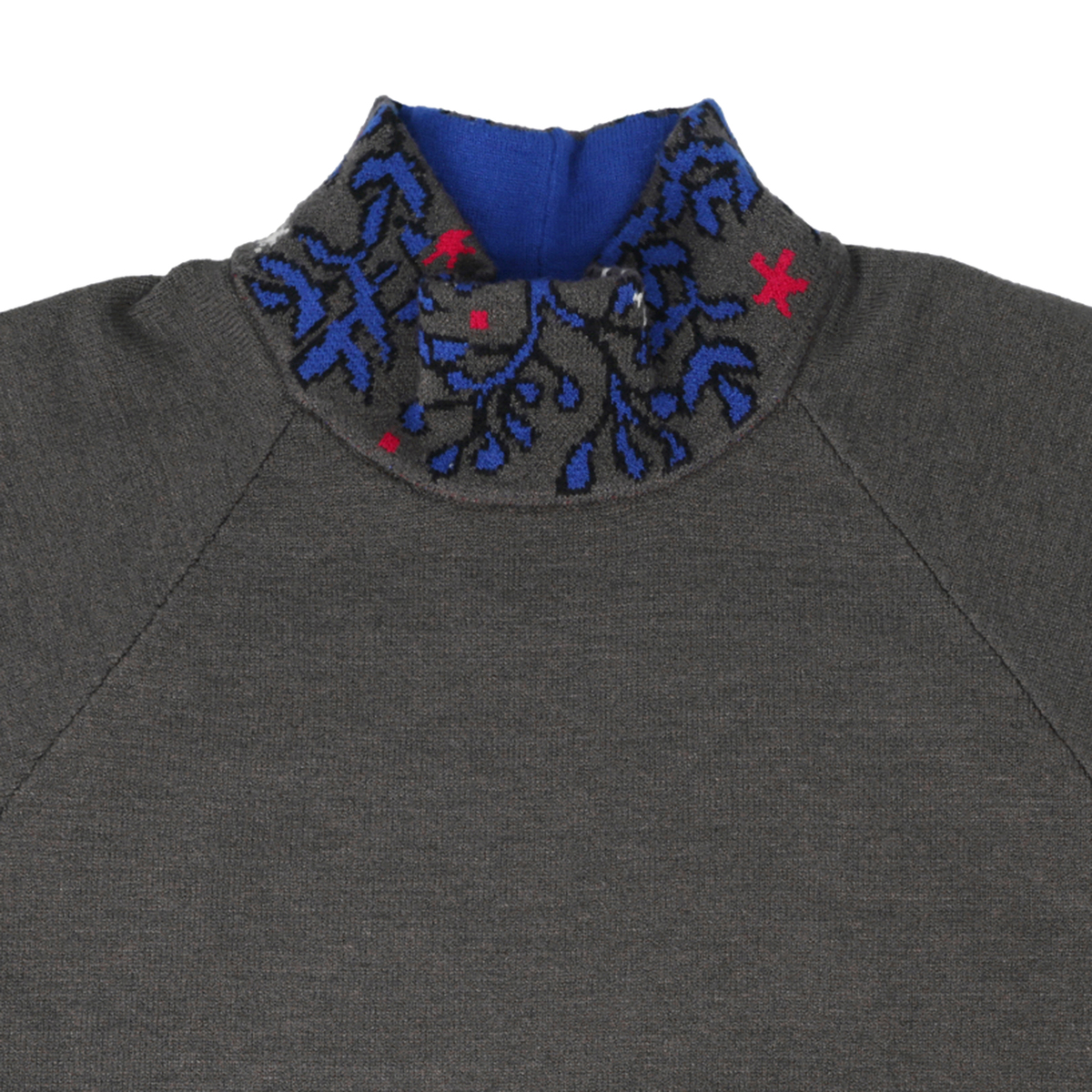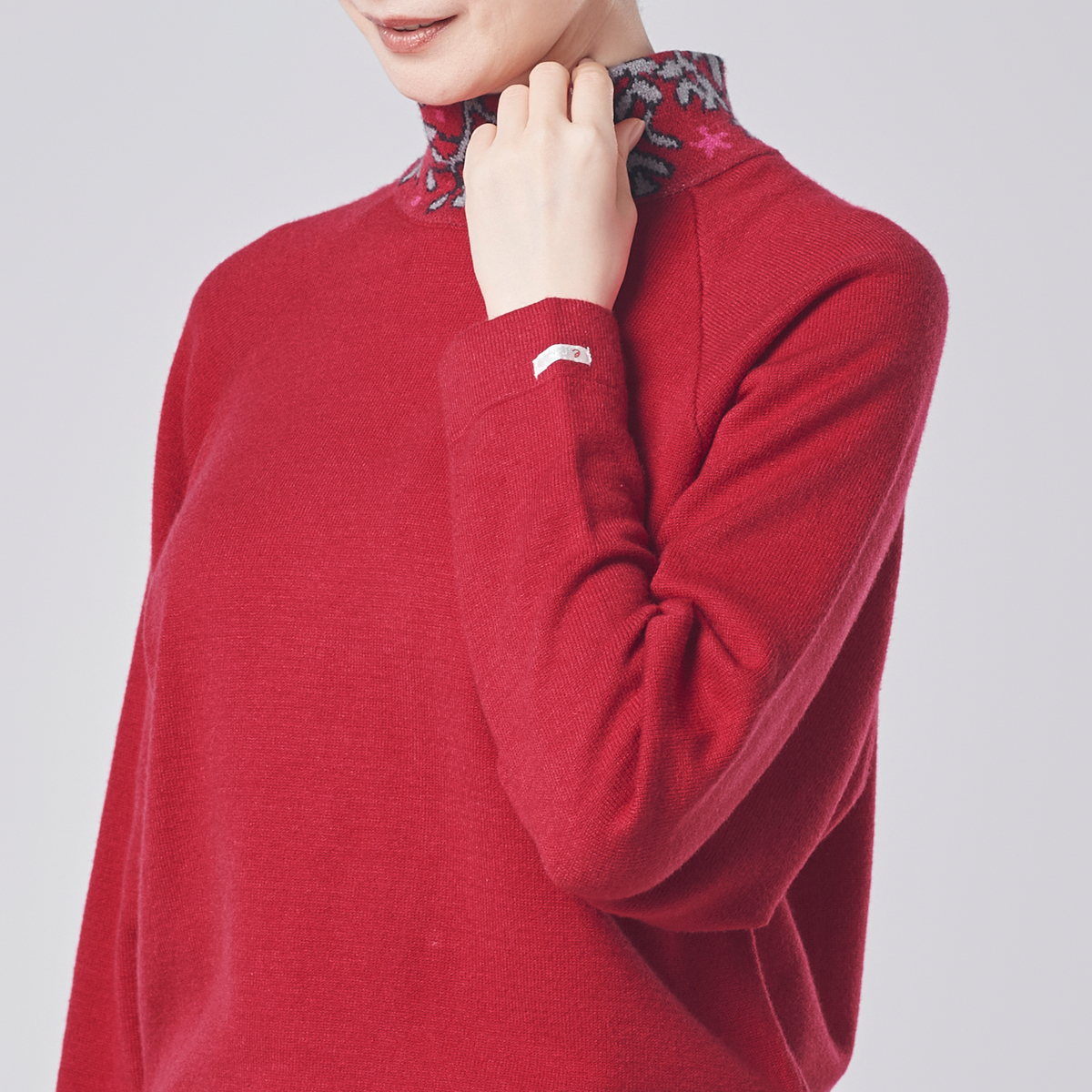 コアヤーンを使用したニットプルオーバー。柔らかな肌触りとしっかりとした肉感のある仕上がりです。ハイネックの表面には、5色使いのスカイフォレスト柄をジャガードで編みました。内側面には配色糸でインナーカラーをデザインし、首元にさりげない彩りを添えます