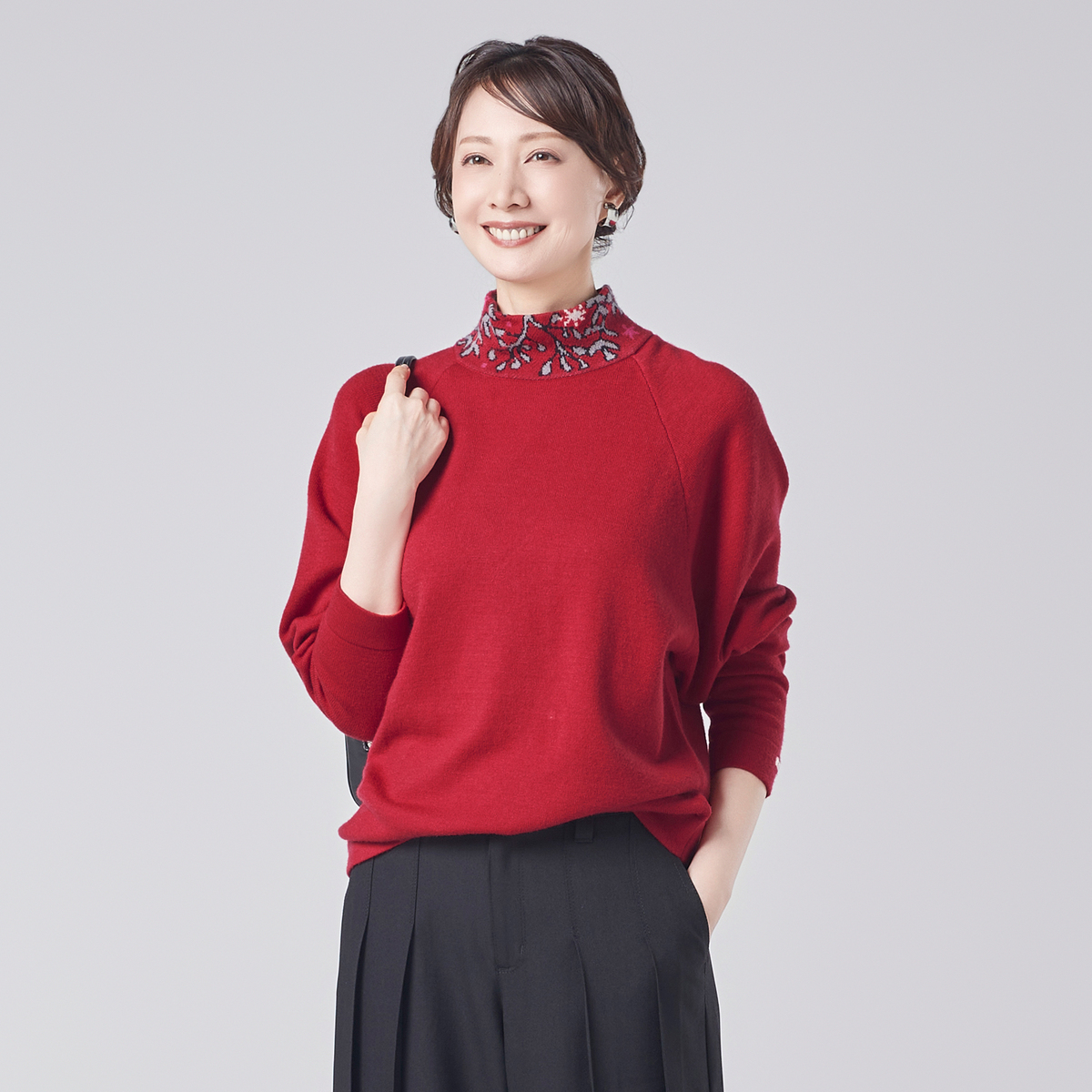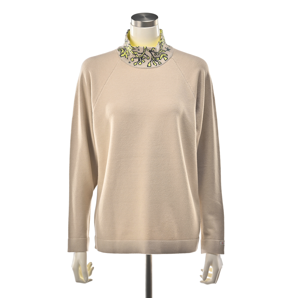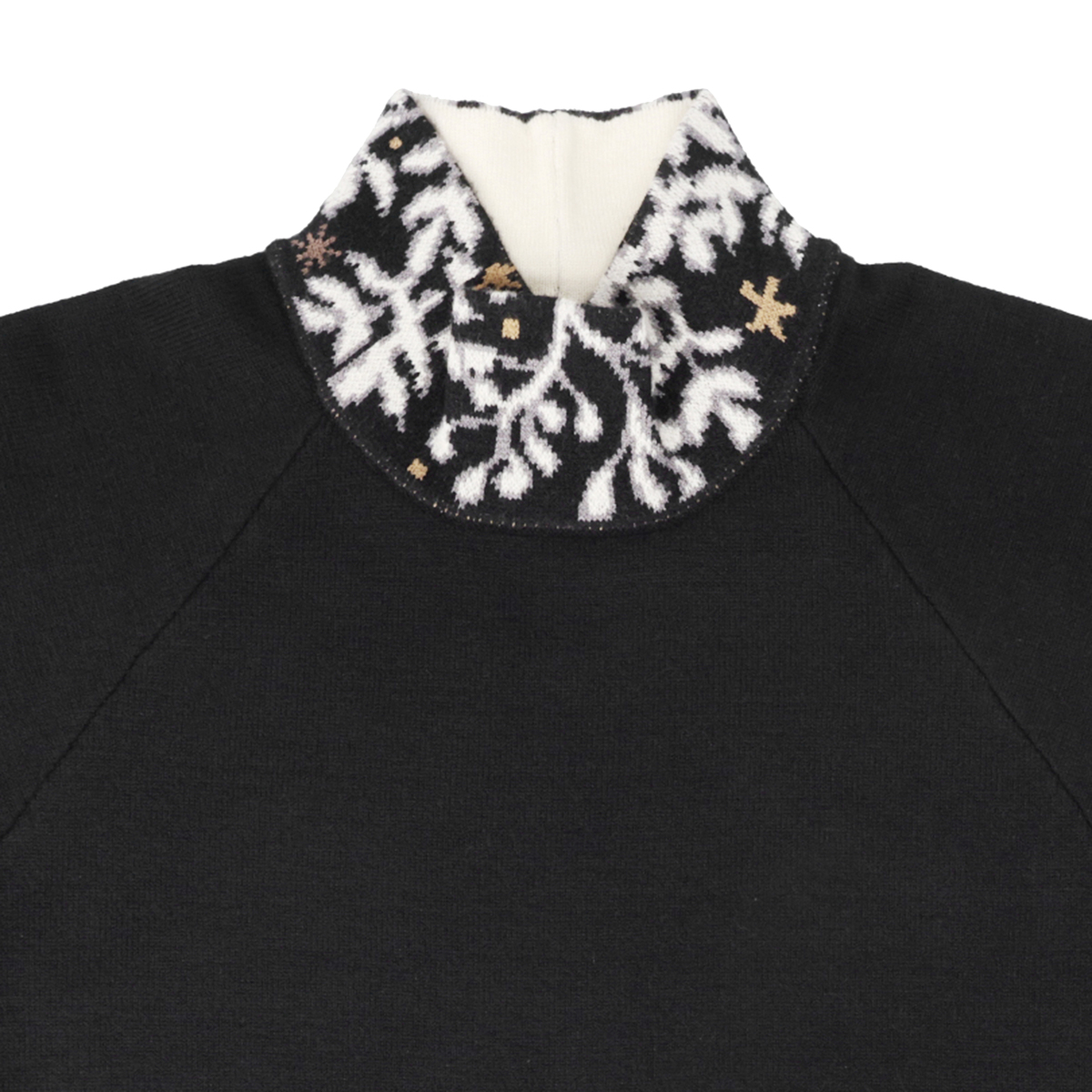 コアヤーンを使用したニットプルオーバー。柔らかな肌触りとしっかりとした肉感のある仕上がりです。ハイネックの表面には、5色使いのスカイフォレスト柄をジャガードで編みました。内側面には配色糸でインナーカラーをデザインし、首元にさりげない彩りを添えます