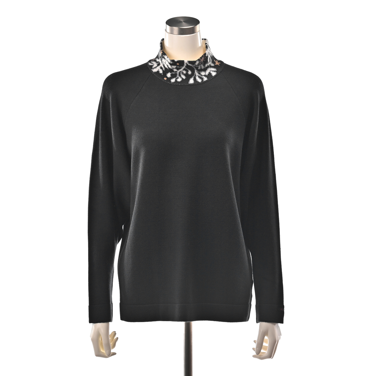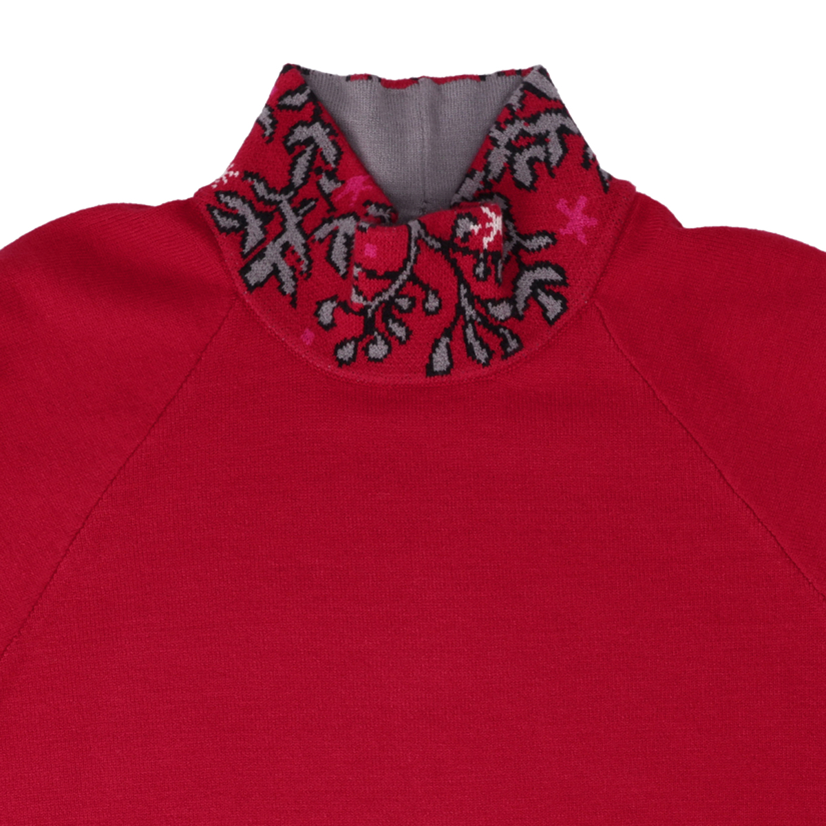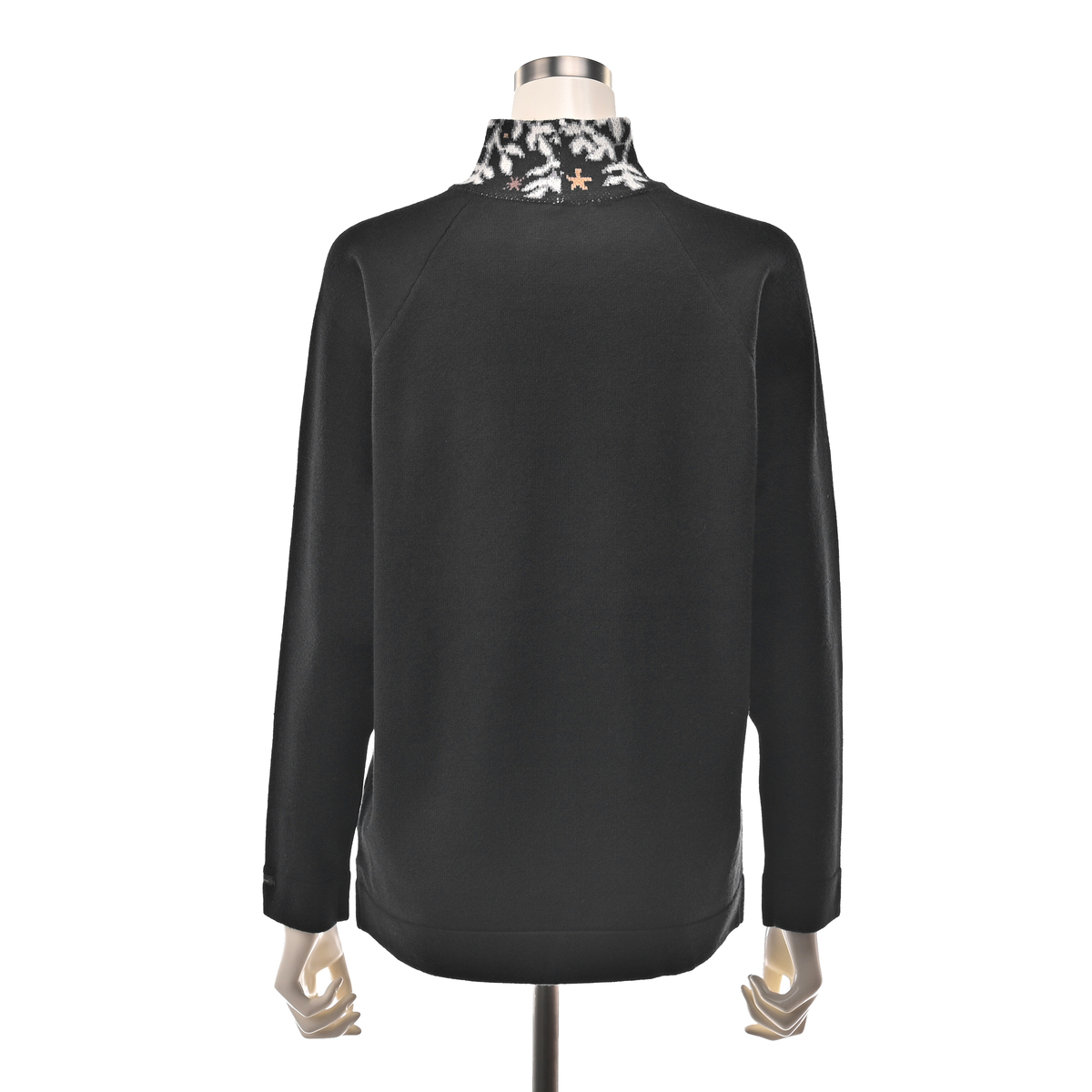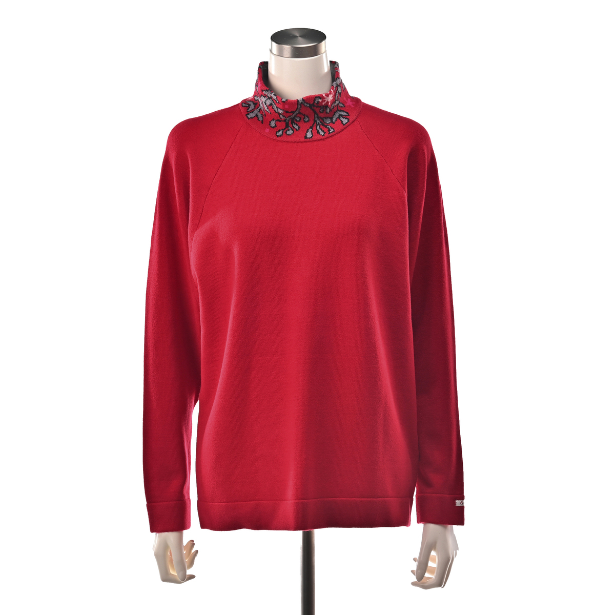 コアヤーンを使用したニットプルオーバー。柔らかな肌触りとしっかりとした肉感のある仕上がりです。ハイネックの表面には、5色使いのスカイフォレスト柄をジャガードで編みました。内側面には配色糸でインナーカラーをデザインし、首元にさりげない彩りを添えます