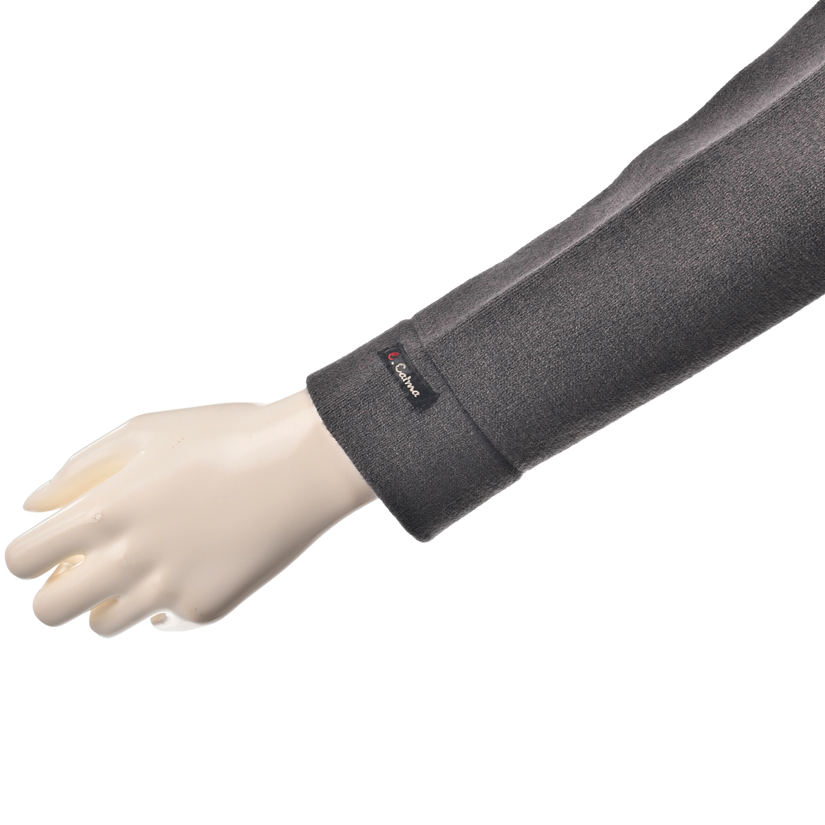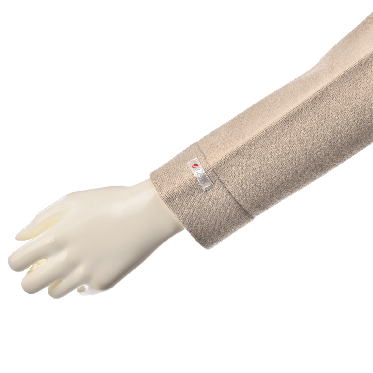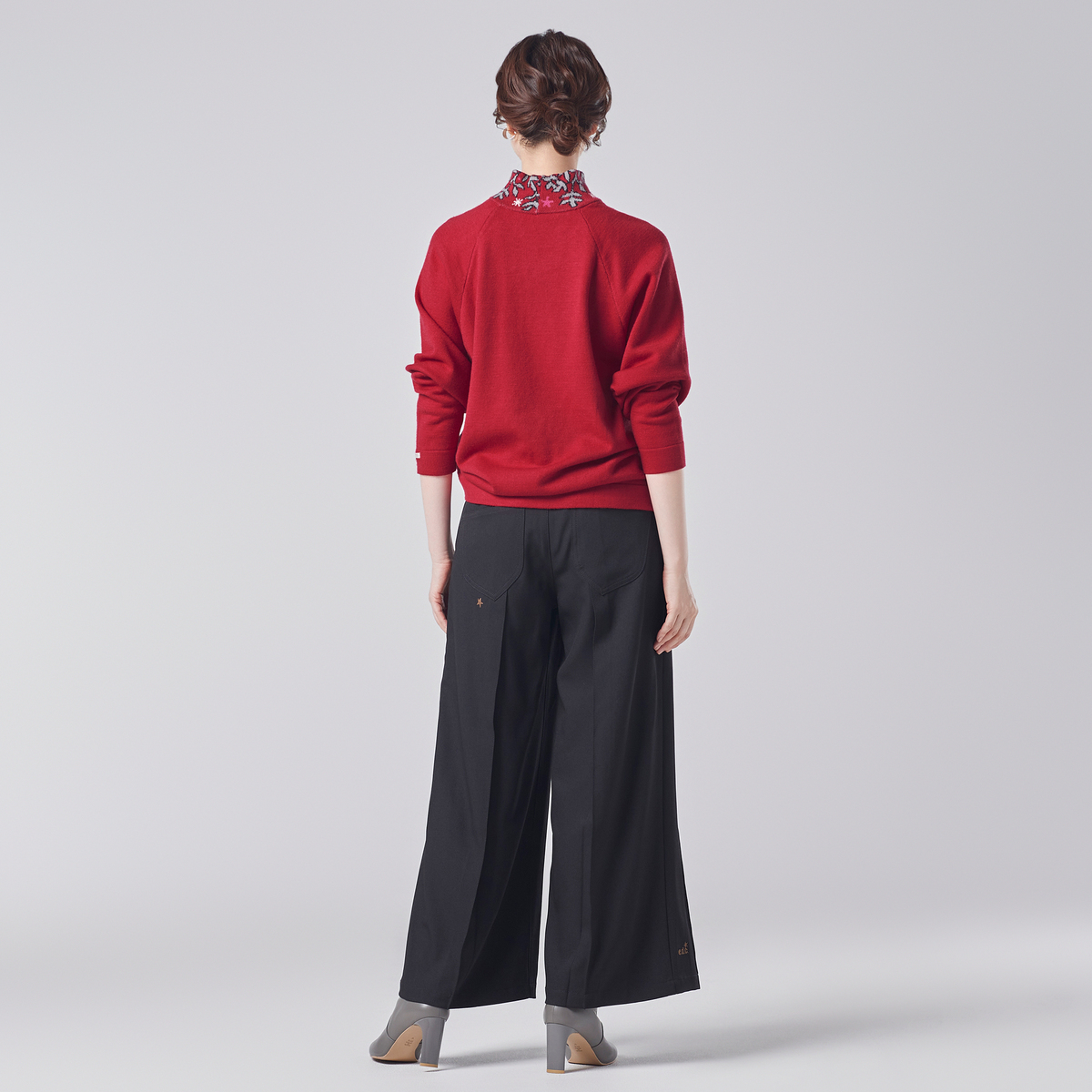 袖口と裾は幅広の袋編みで仕立て、左袖口にはブランドロゴ入りのミニピスネームをプラス。糸表面に後加工で静電気を起こりにくくする帯電防止加工*を施した糸を使用しています