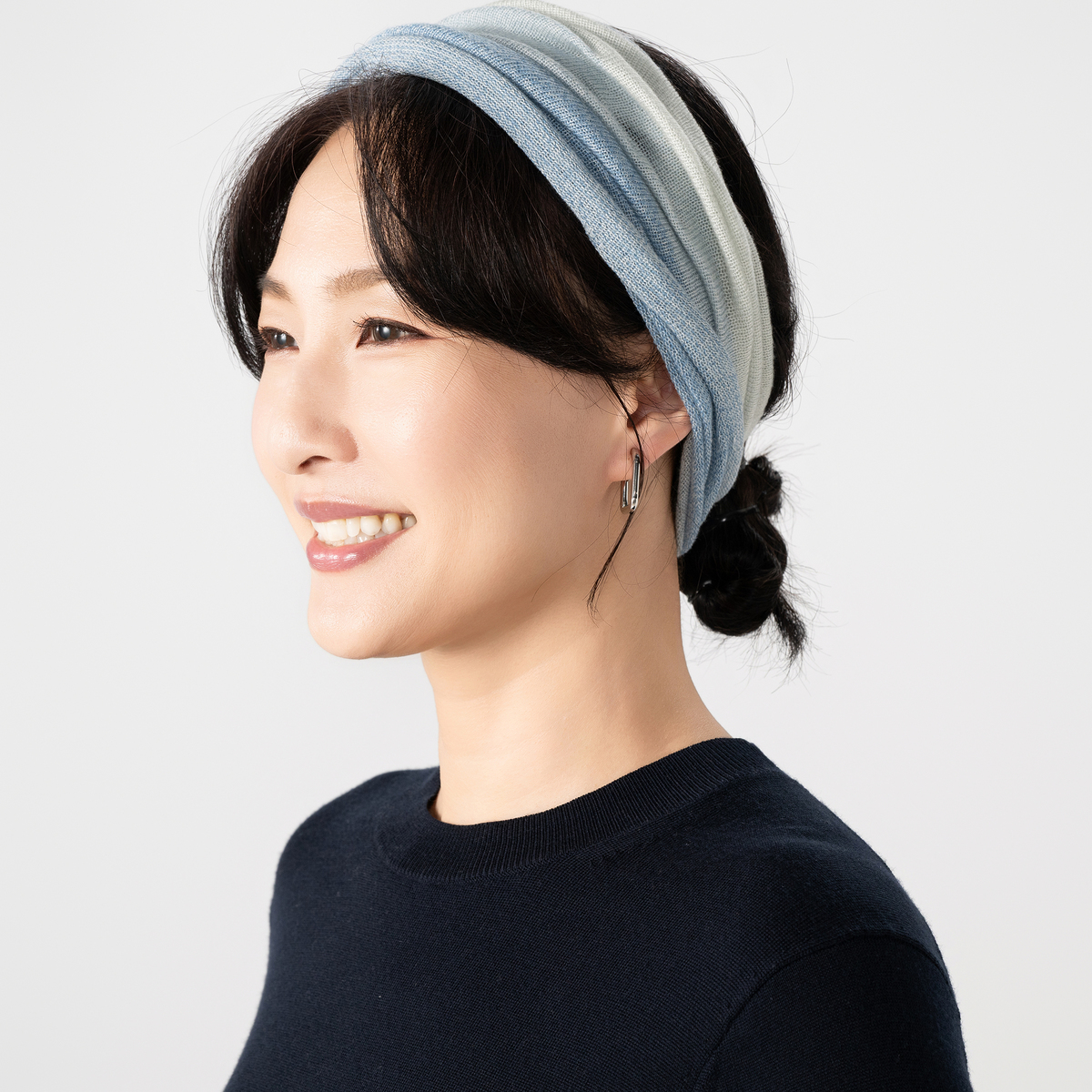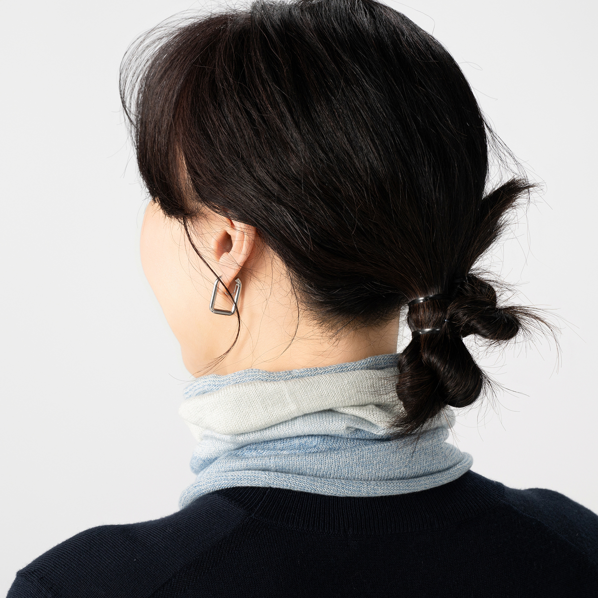 光沢のあるシルク糸を、日本の工場で1本ずつ機械に掛けて丁寧に起毛し、やわらかな風合いに仕上げました。ネックウォーマーとしてはもちろん、ヘアバンドやフェイスマスクとしてもデイリーでお使いいただけます