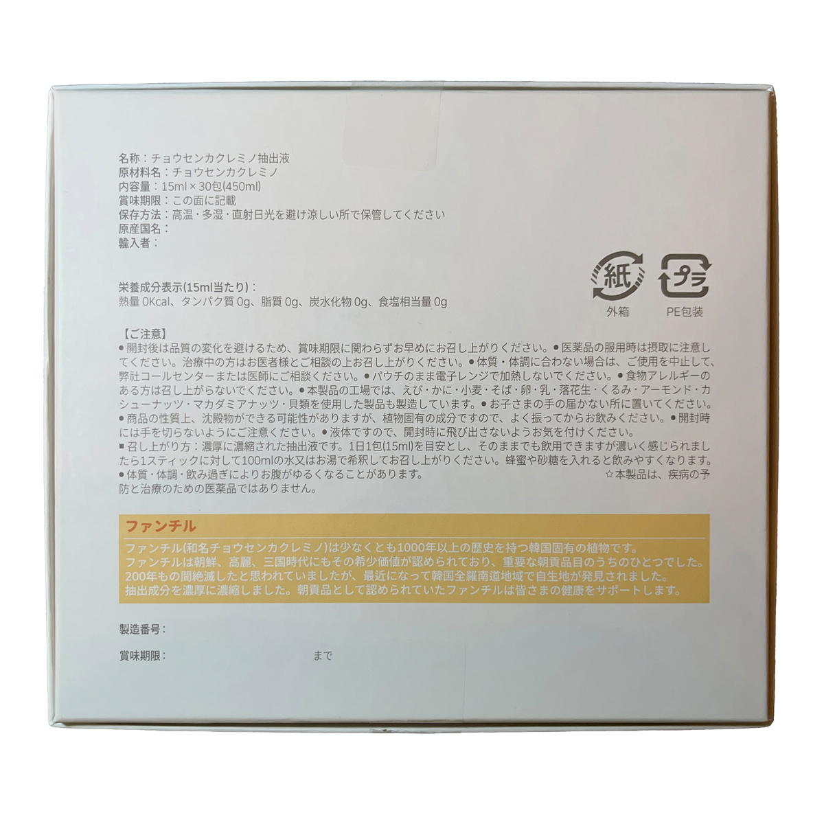 [アレルギー物質特定原材料8品目] なし [内容量] 15ml×30包 [目安量] 1日1包(15ml) [保存方法] 高温多湿、直射日光を避け涼しい所で保管してください [お召し上がり方] 濃厚に濃縮された抽出液です。1日1包(15ml)を目安とし、そのままでも飲用できますが濃く感じられましたら1スティックに対して100mlの水又はお湯で希釈してお召し上がりください。蜂蜜や砂糖を入れると飲みやすくなります [注意事項] ※開封後は品質の変化を避けるため、賞味期限に関わらずお早めにお召し上がりください ※医薬品の服用時は摂取に注意してください ※治療中の方はお医者様とご相談のうえおめしあがりください ※体質、体調に合わない場合はご使用を中止し医師にご相談ください ※パウチのまま電子レンジで加熱しないで下さい ※食物アレルギーのある方は召し上がらないでください ※お子様の手に届かない所において下さい ※商品の性質上、沈殿物が出来る可能性がありますが、植物固有の成分ですのでよく振って御飲み下さい ※開封時には手を切らないように御注意ください ※液体ですので開封時に飛び出さないようお気を付けください ※体質、体調、飲みすぎによりお腹がゆるくなることがあります ※本製品は疾病の予防と治療のための医薬品ではありません [原産国] 韓国 [原材料] チョウセンカクレミノ