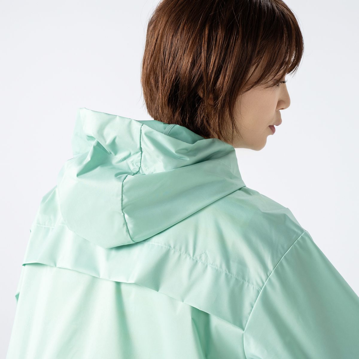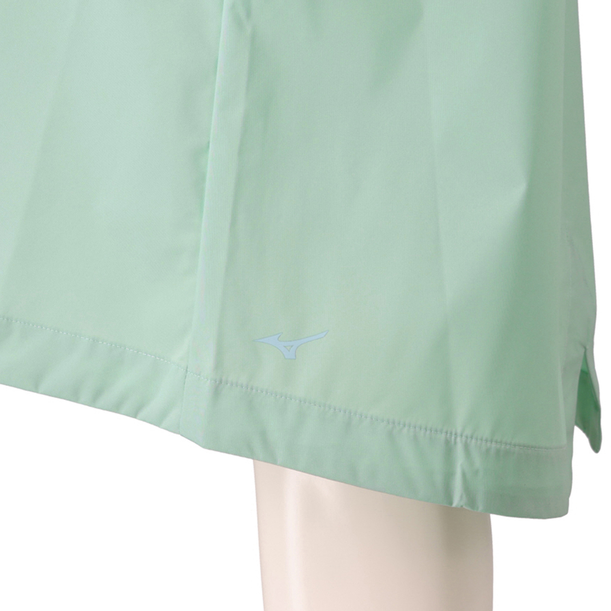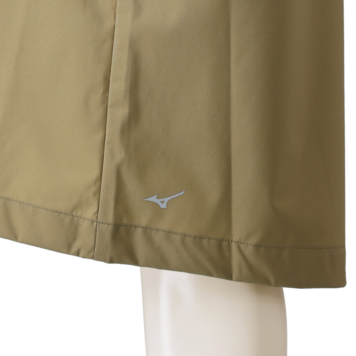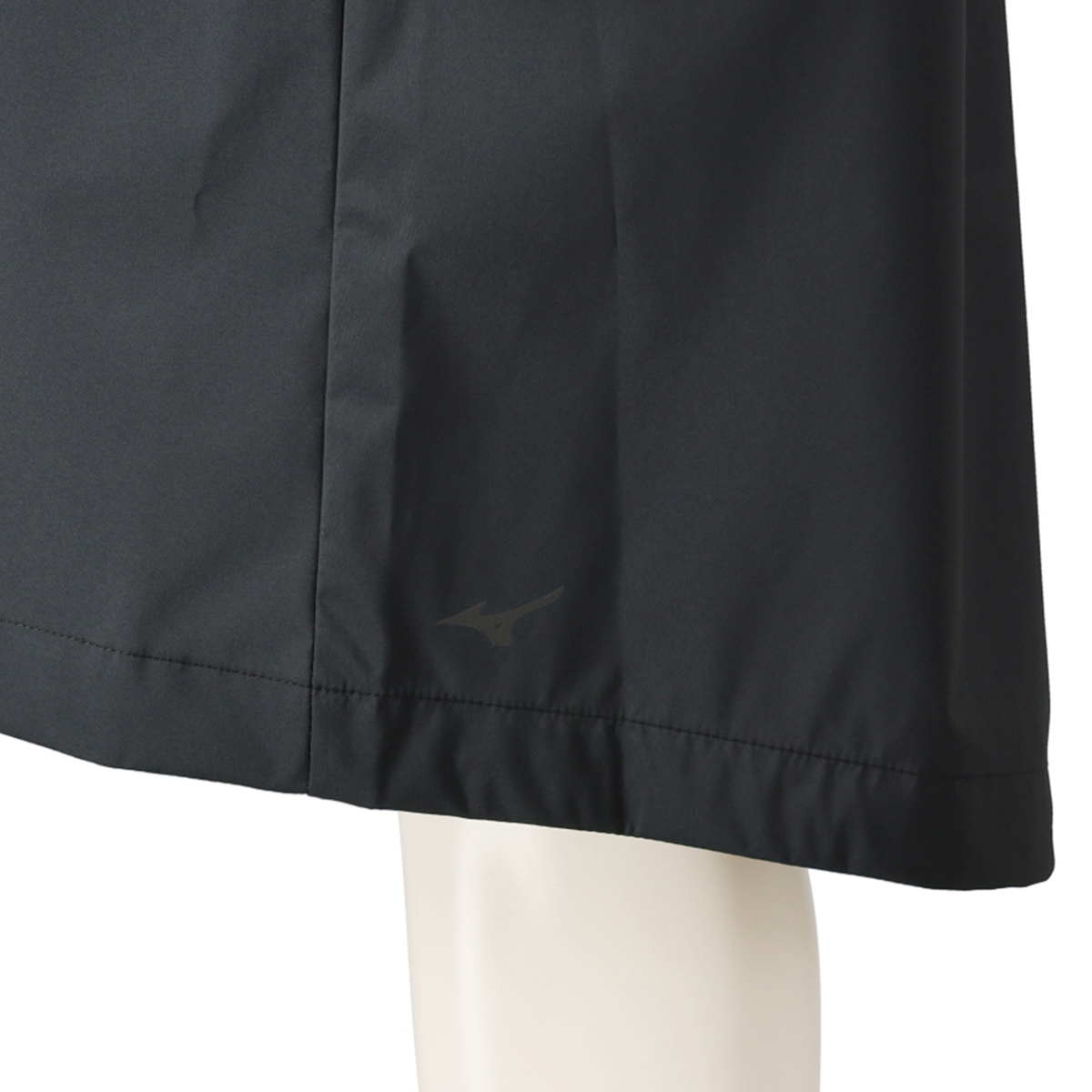 中に着るものを選ばない、ゆとりのあるシルエットとミドル丈で、ウエストのスピンドル紐を絞れば、シルエットを変えることも可能。背面左下の裾部分には再帰反射転写のミズノのロゴ付きです