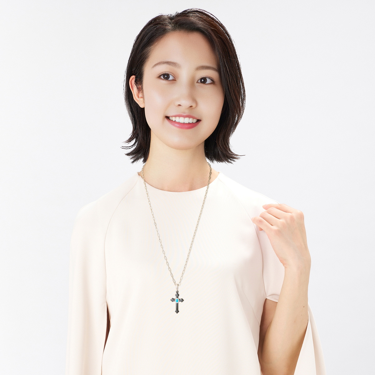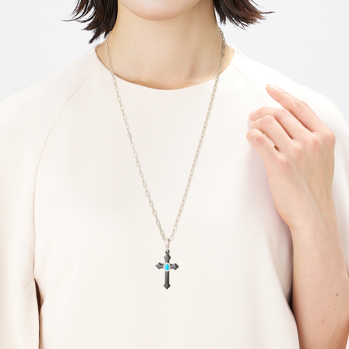 セラミックのクロスモチーフに、キュービックジルコニアで取り巻いたスリーピングビューティートルコ石をあしたった大変豪華なペンダント。何気ない装いに合わせるだけでおしゃれ感がアップします