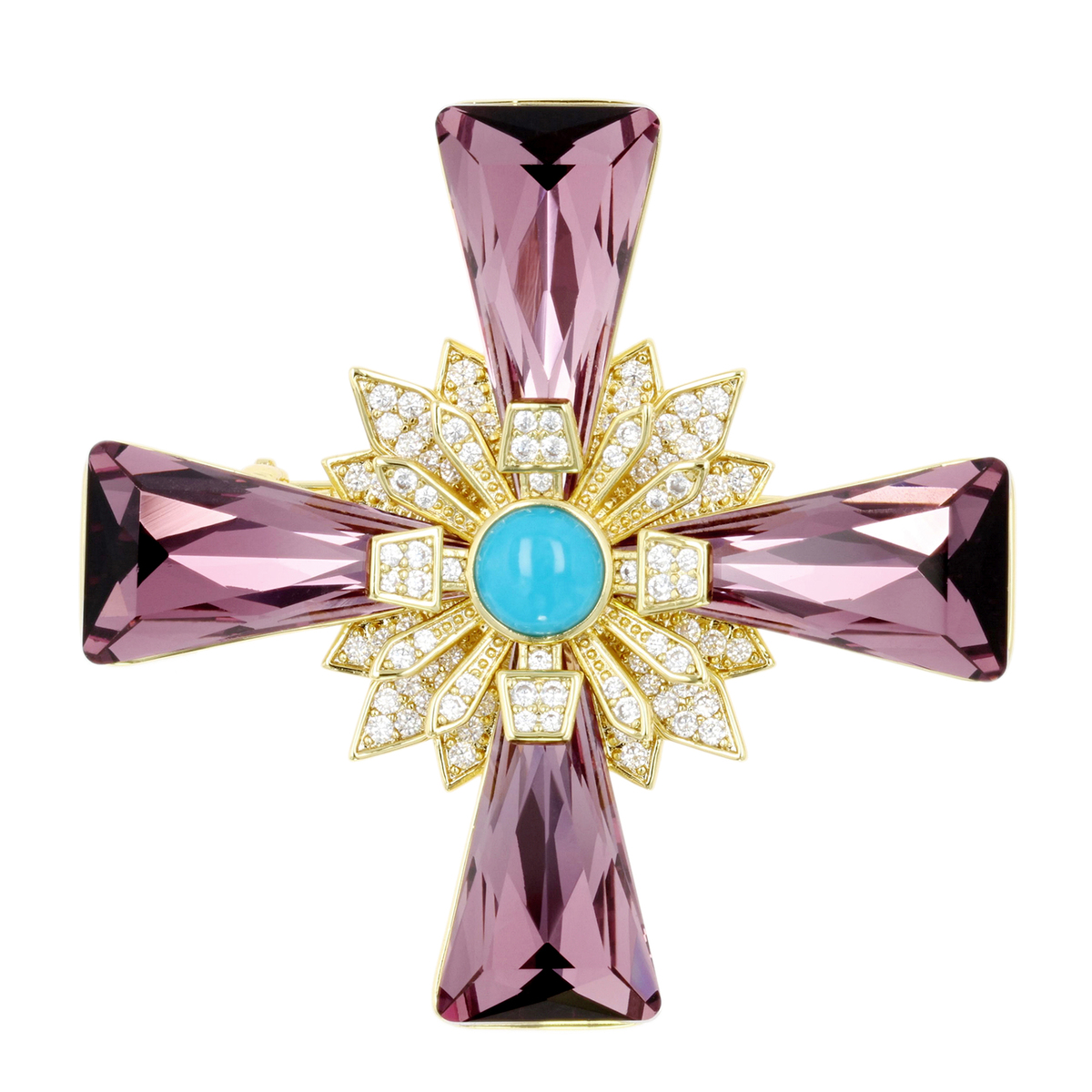 パープル系のクリスタルガラスとスリーピングビューティートルコ石の鮮やかなブルーが目を引くブローチ/ペンダントヘッド。お手持ちのチェーンを使ってペンダントとしてもお使いいただけます