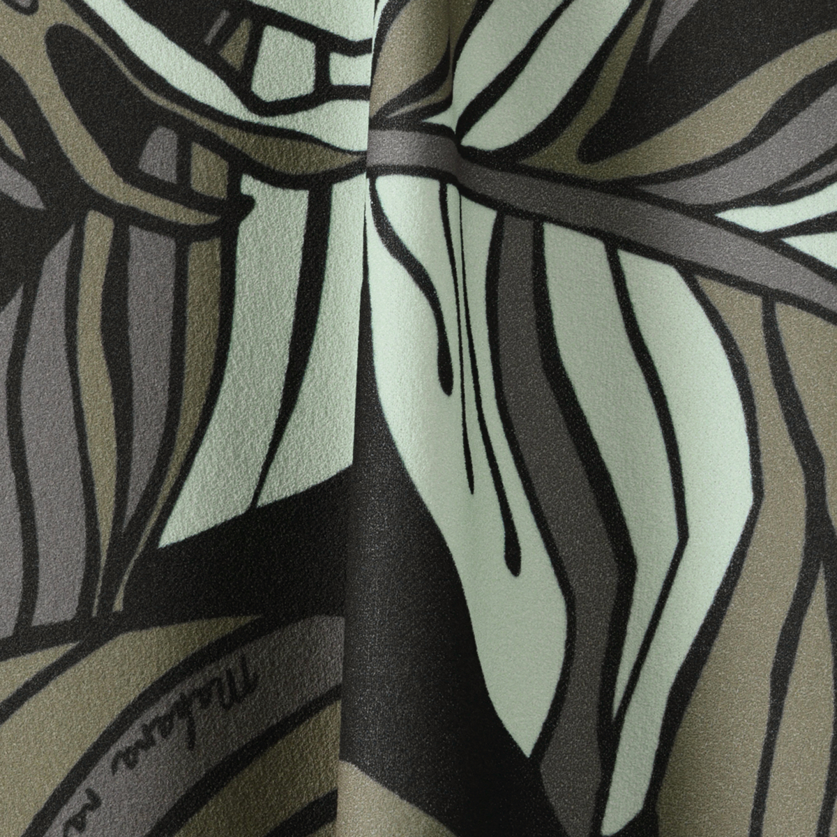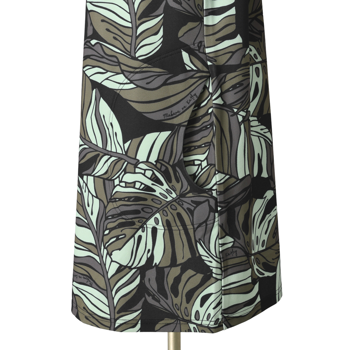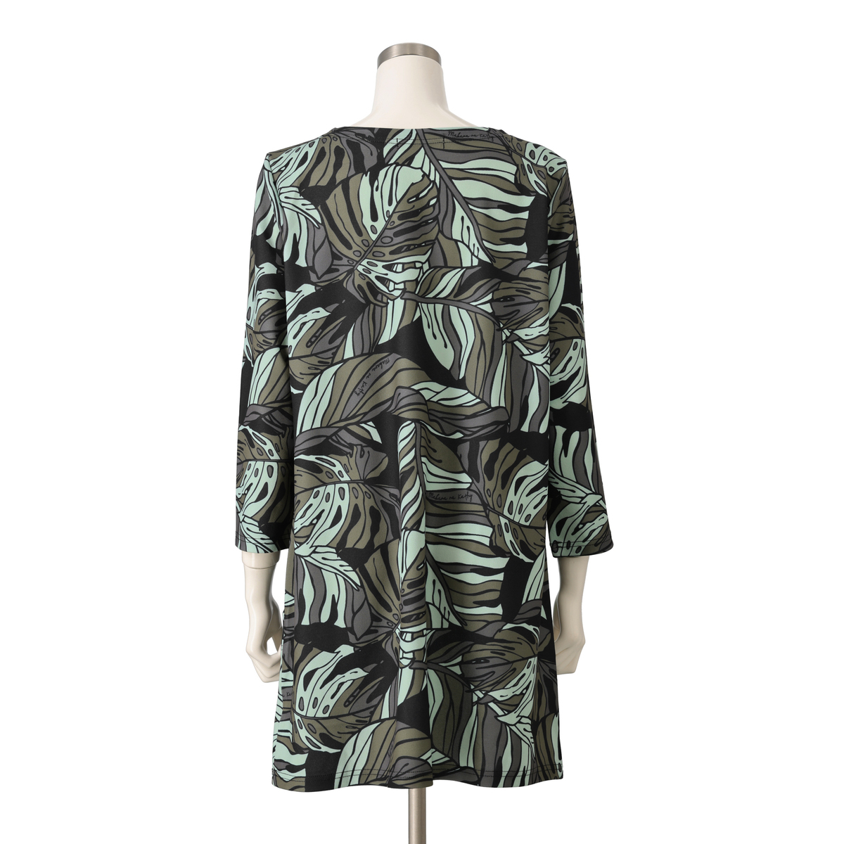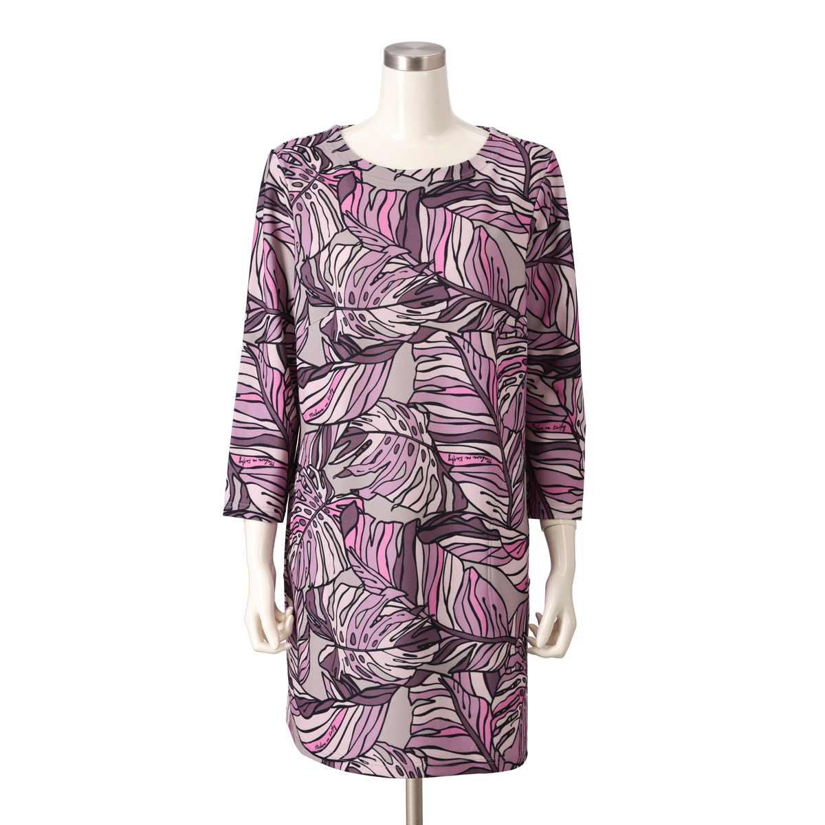 気分を上げるポップなリーフ柄が魅力のチュニック。少し地厚感のあるジョーゼットジャージーに、北欧タッチのモンステラ柄を組合せ、動きのある印象に仕上げました。同系色でまとめているのでコーデしやすく、ヒップまで隠れるソフトAラインがうれしい一枚です