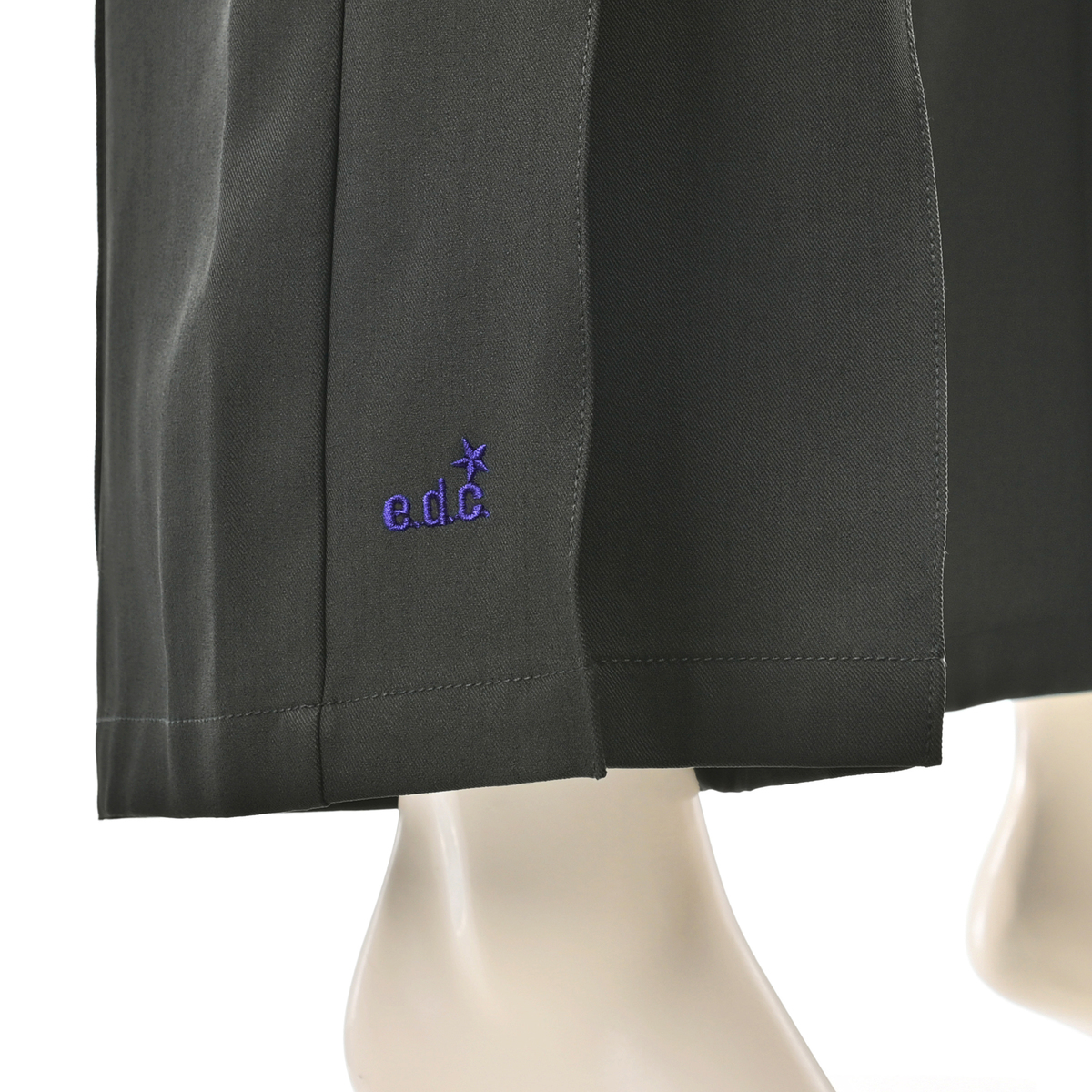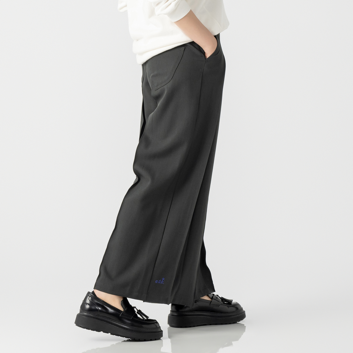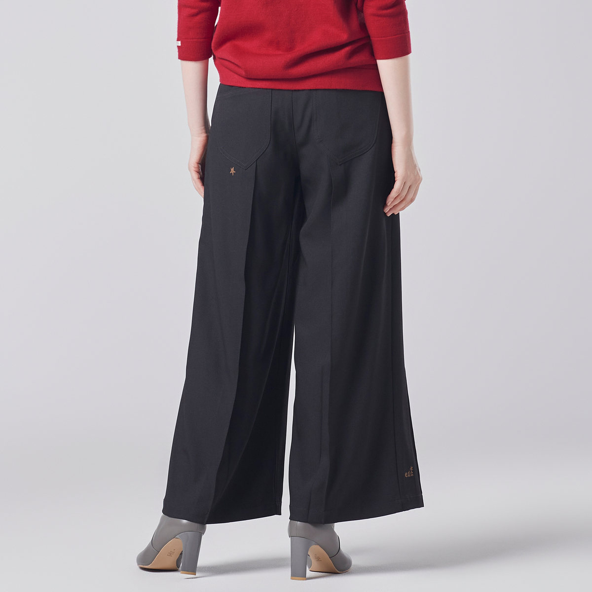 ヒップラインはすっきりと、渡りにゆとりを持たせた設計で、プリーツと組合せることで脚のラインを拾わずきれいに見せます。張りのある生地感とも相性が良く、フォルムがしっかりと際立ちます。股ぐりはヒップをしっかり包み込む深穿きのパターンです