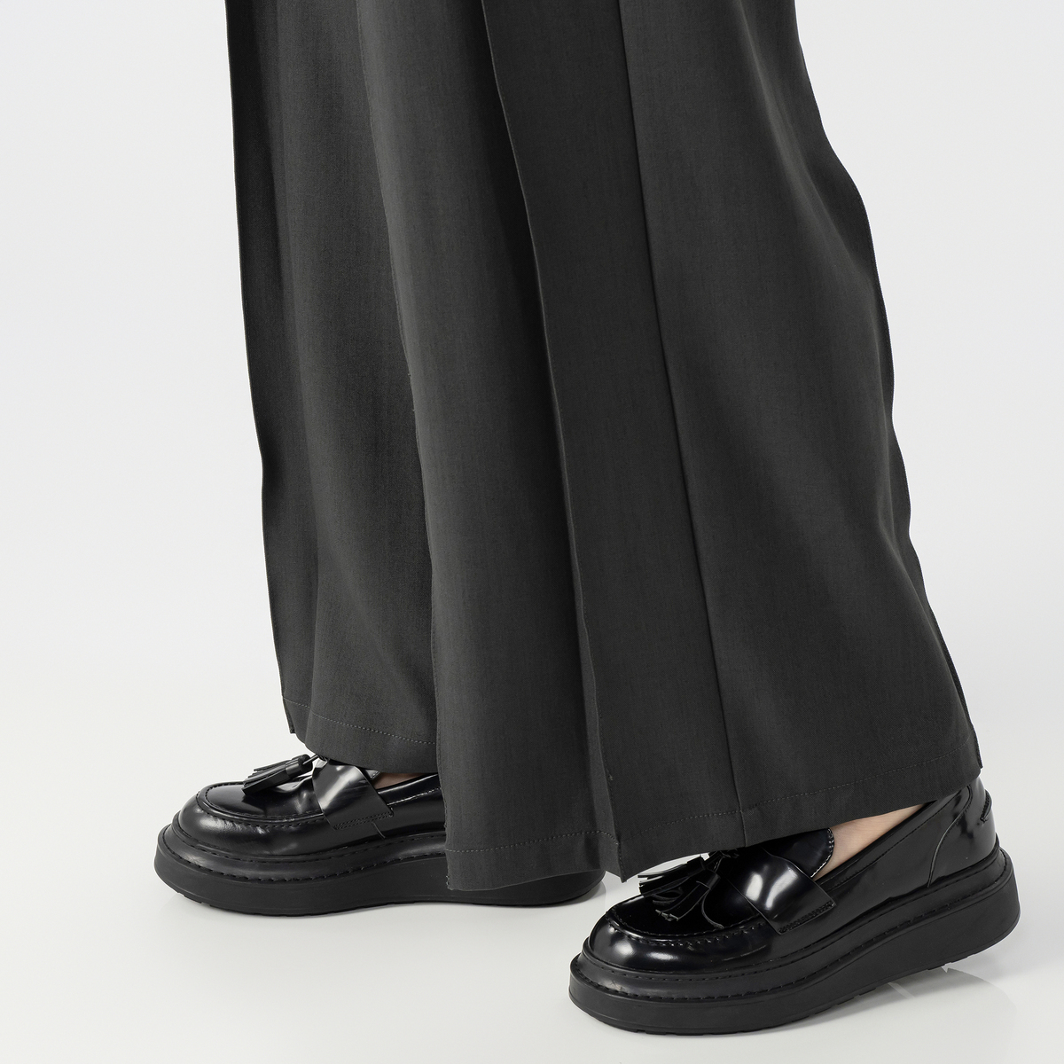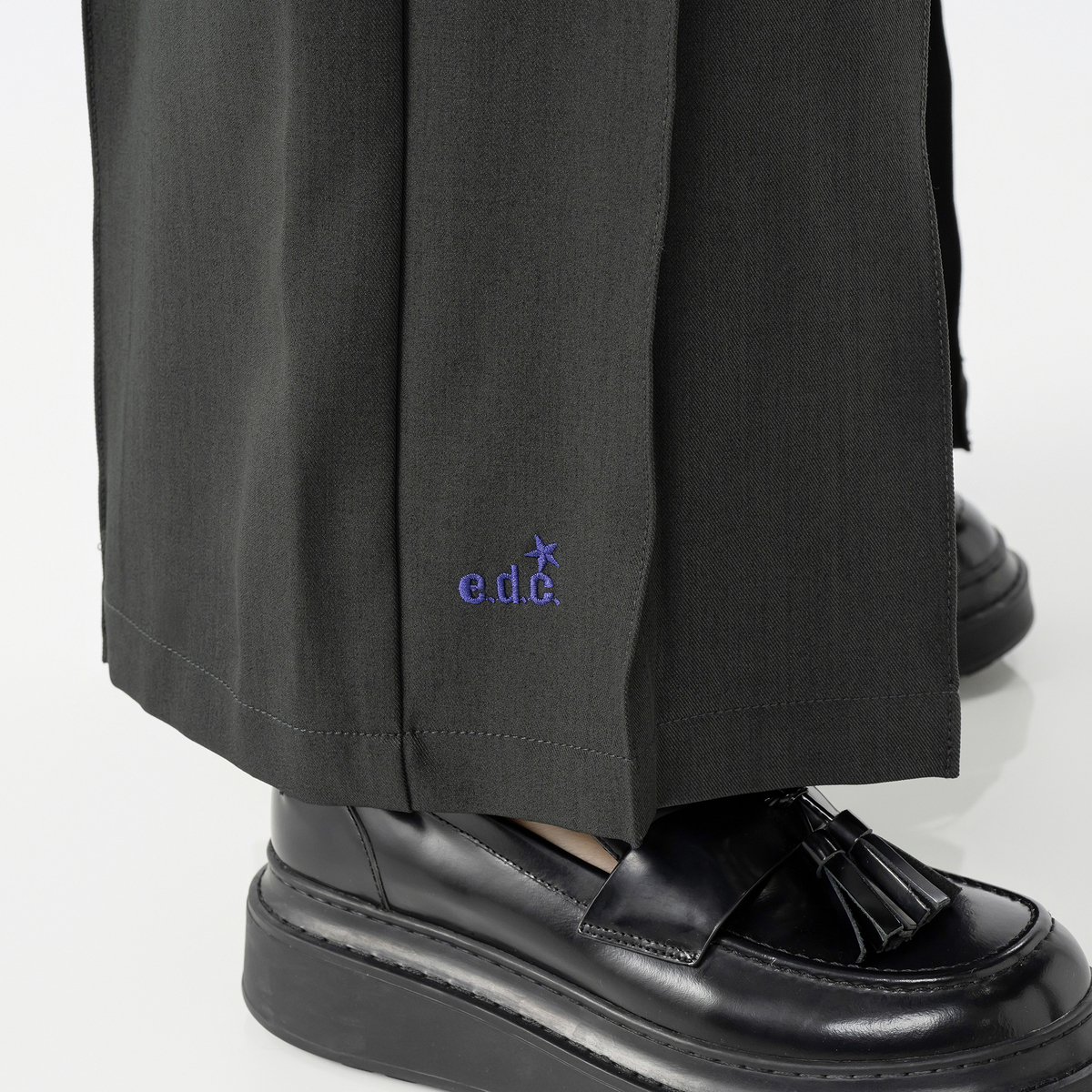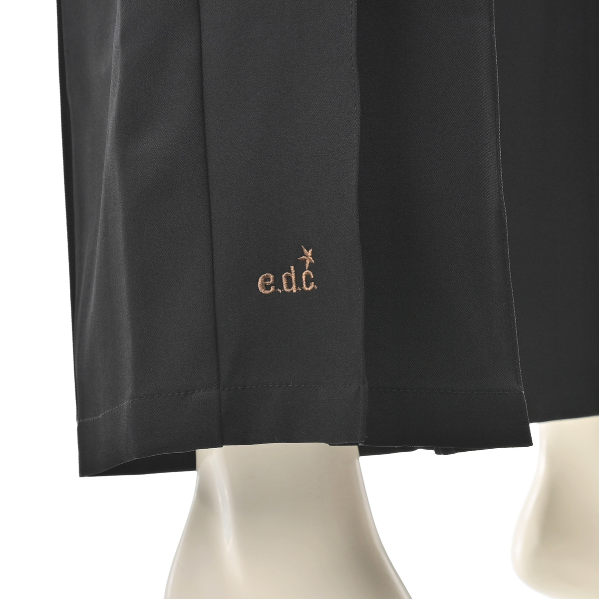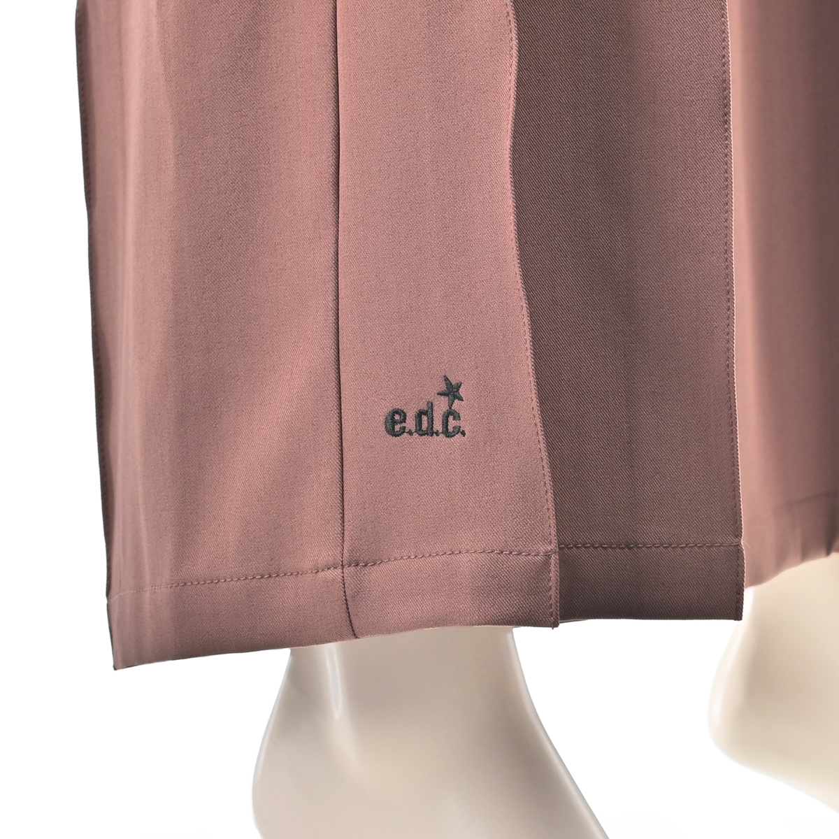 ヒップラインはすっきりと、渡りにゆとりを持たせた設計で、プリーツと組合せることで脚のラインを拾わずきれいに見せます。張りのある生地感とも相性が良く、フォルムがしっかりと際立ちます。股ぐりはヒップをしっかり包み込む深穿きのパターンです