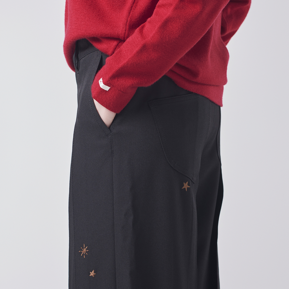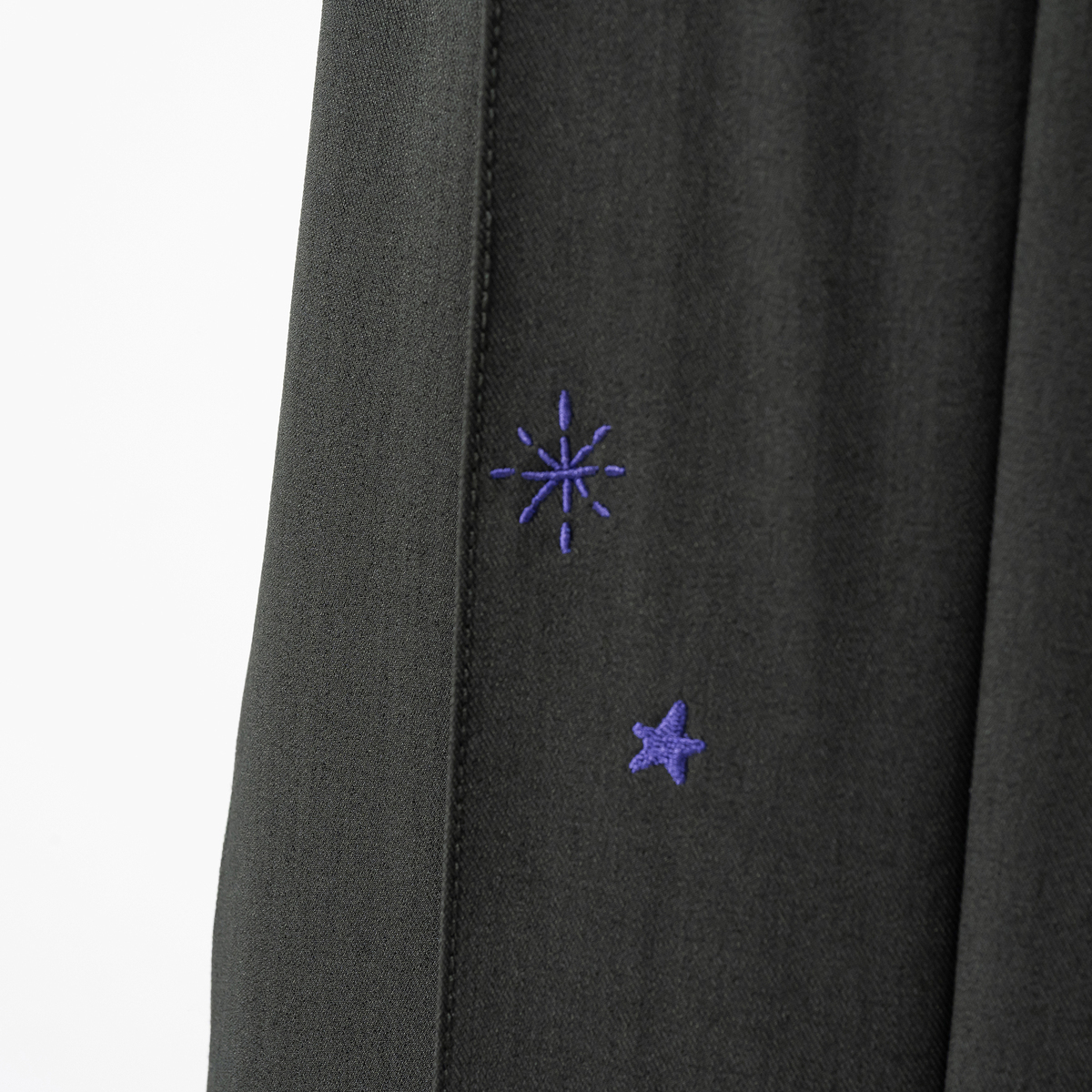 前脇に切替えポケット、後ろには大きめのアウトポケットを配置。ヒップが小さく見えるサイズ感にもこだわりました。左右の前身頃と左後ろ身頃には、ブランドロゴや星の刺繍をランダムにあしらい、配色のアクセントがキュートな個性を演出します