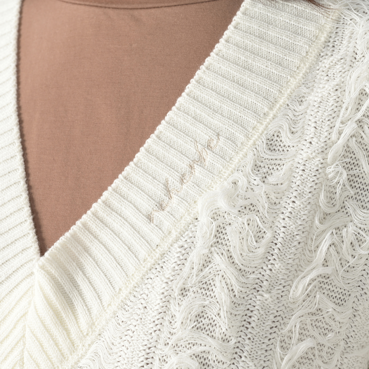 ややオーバーサイズのシルエットで、シャツやTシャツとのコーデを楽しめます。裾リブ部分にはヘリンボン風のパターンを入れ、リブ編み地にも遊び心をプラス。袖・衿ぐりにもスウェットのようなステッチデザインを加え、カジュアルな印象に仕上げました。衿部分にさりげないブランドネームの刺繍があります