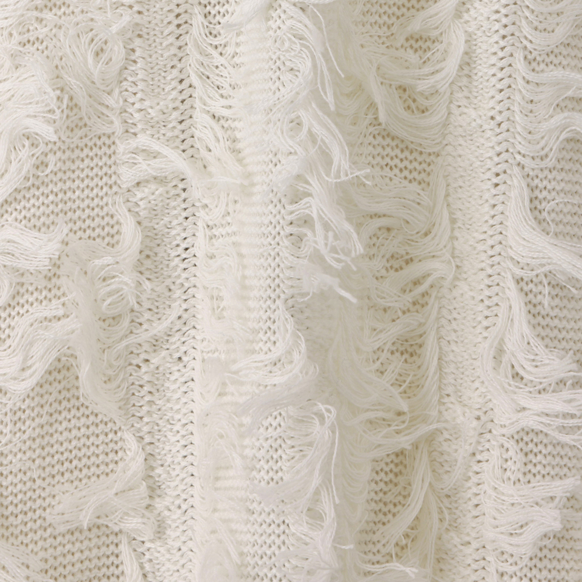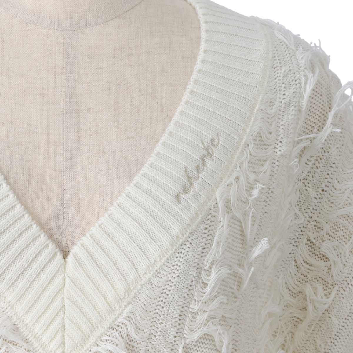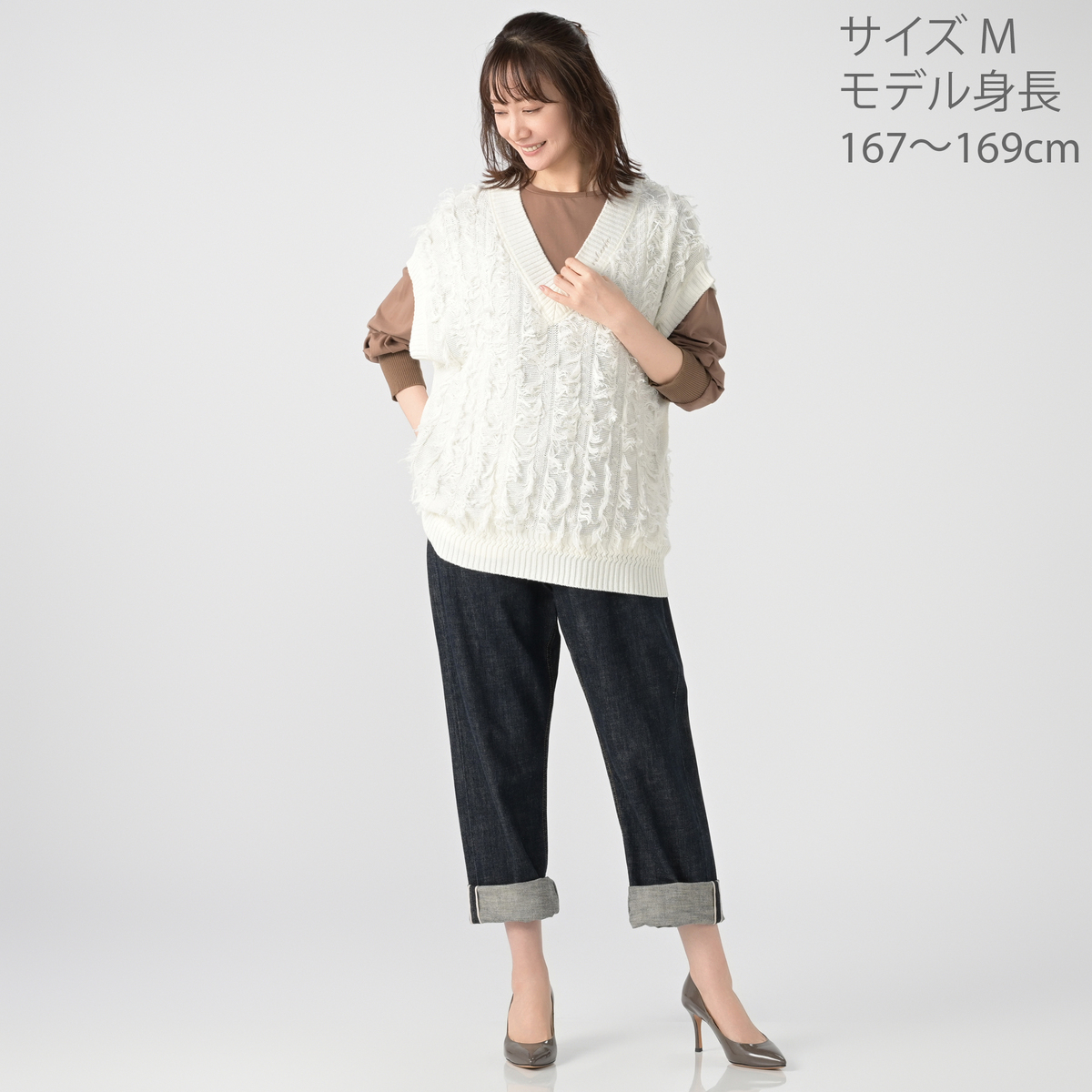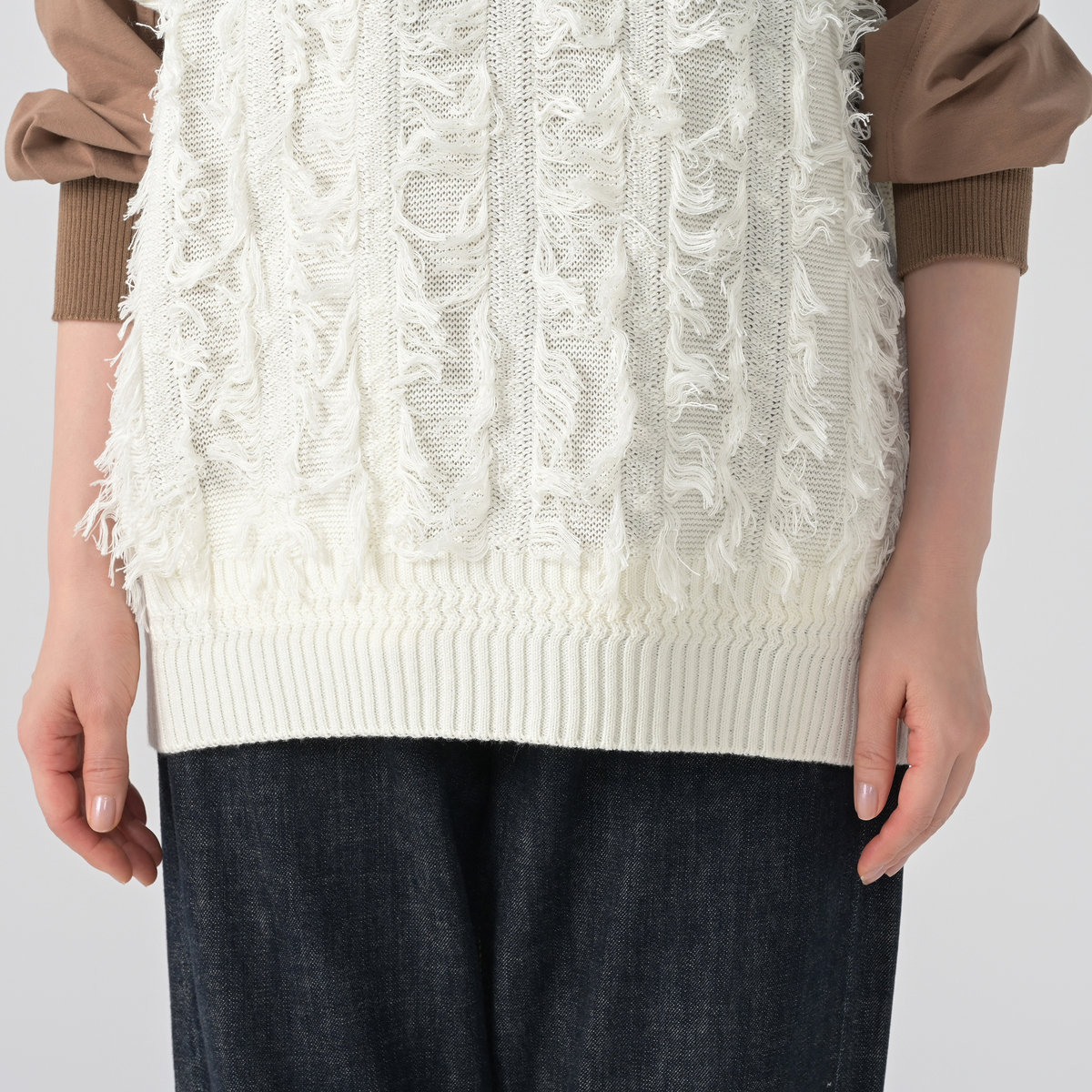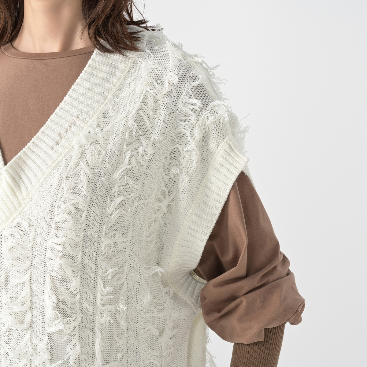 コットンアクリル定番ニット素材を使用した、季節の変わり目におすすめのVネックニットジレ。フリンジをカットすることでカジュアル感とクラフト感を出し、ミドルゲージのちょうど良い肉厚感に仕上げています