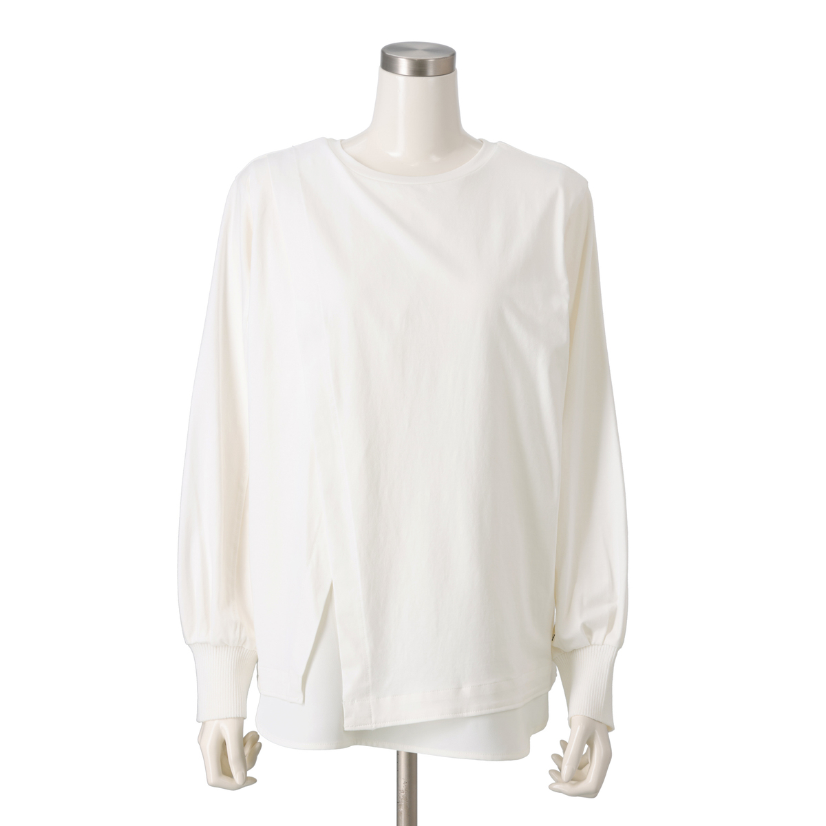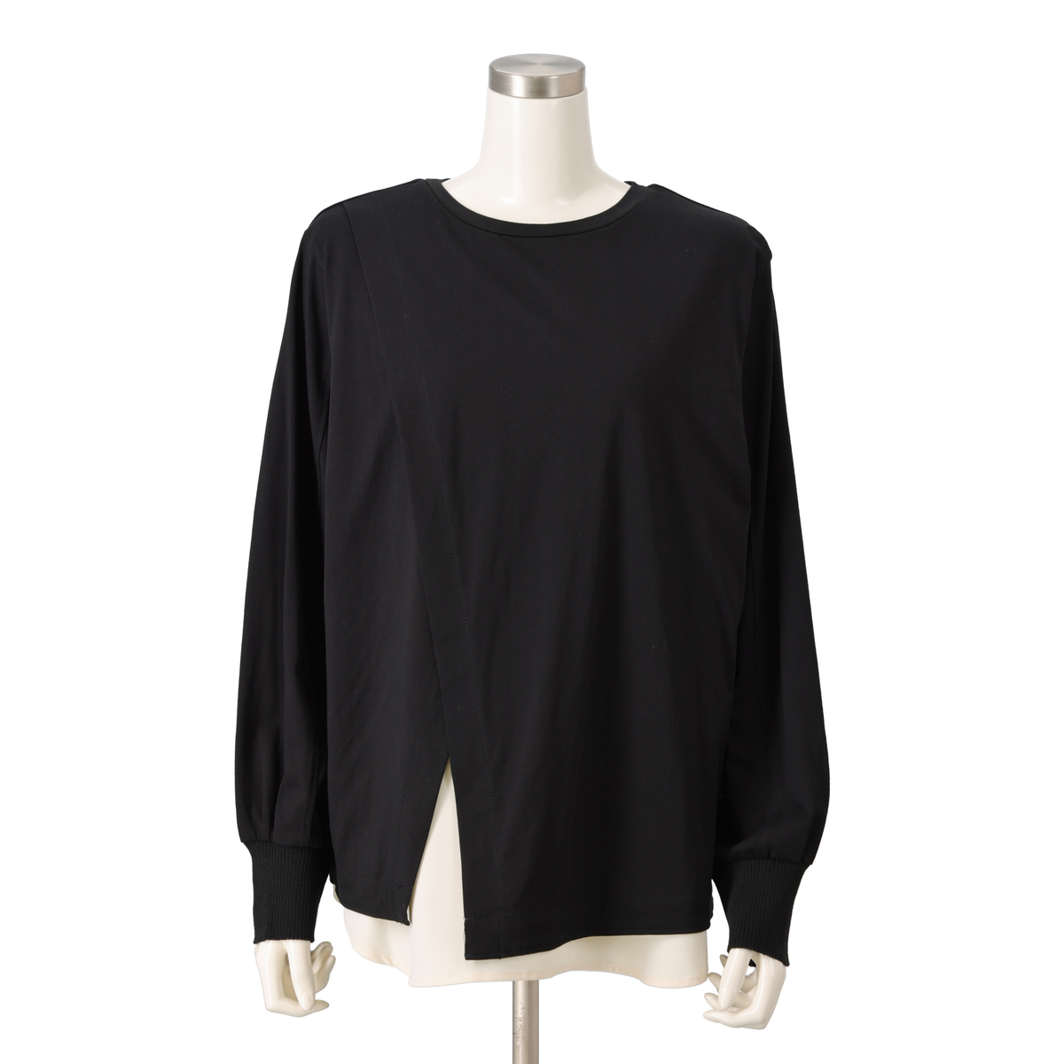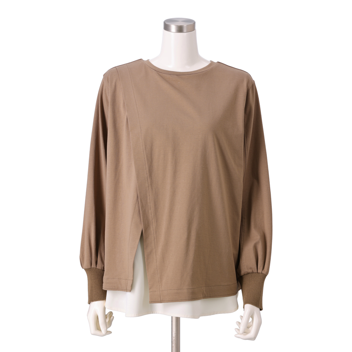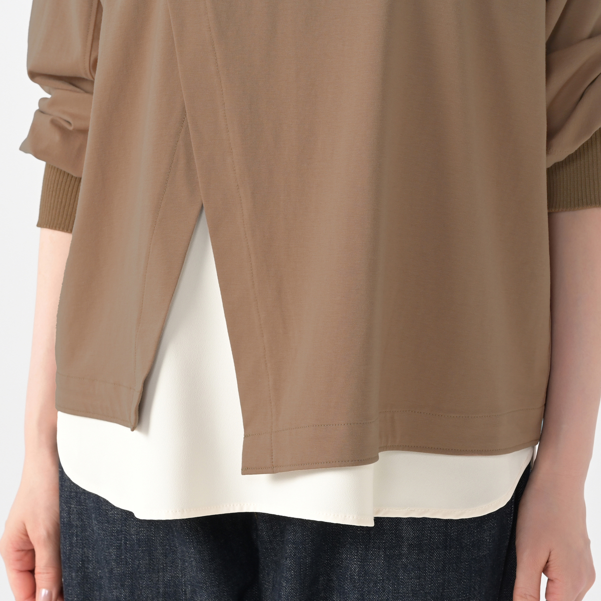 深めの重なりをつけたスリットデザインのプルオーバー。裏地プラス別布でレイヤード風になっており、一枚でもおしゃれな着こなしを演出します。上品に見えるカットソー素材で、裾からのぞく別布にはマットな光沢のジョーゼット素材を使用しました