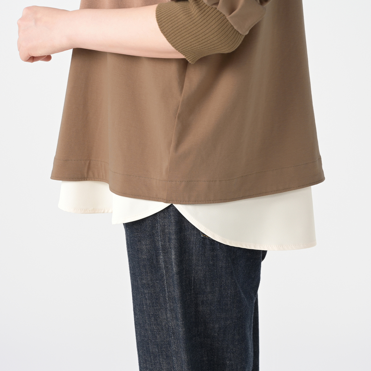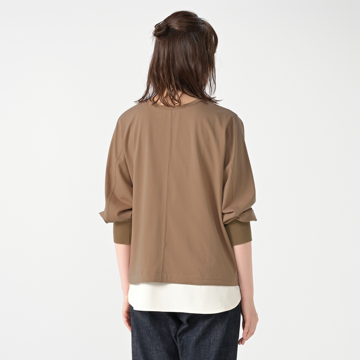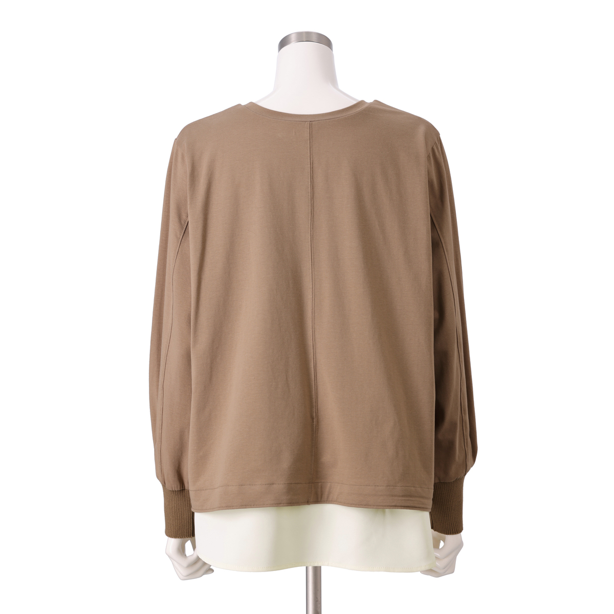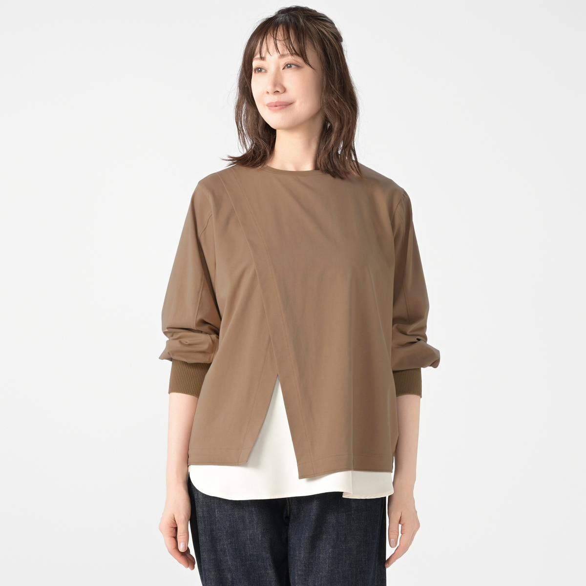 深めの重なりをつけたスリットデザインのプルオーバー。裏地プラス別布でレイヤード風になっており、一枚でもおしゃれな着こなしを演出します。上品に見えるカットソー素材で、裾からのぞく別布にはマットな光沢のジョーゼット素材を使用しました