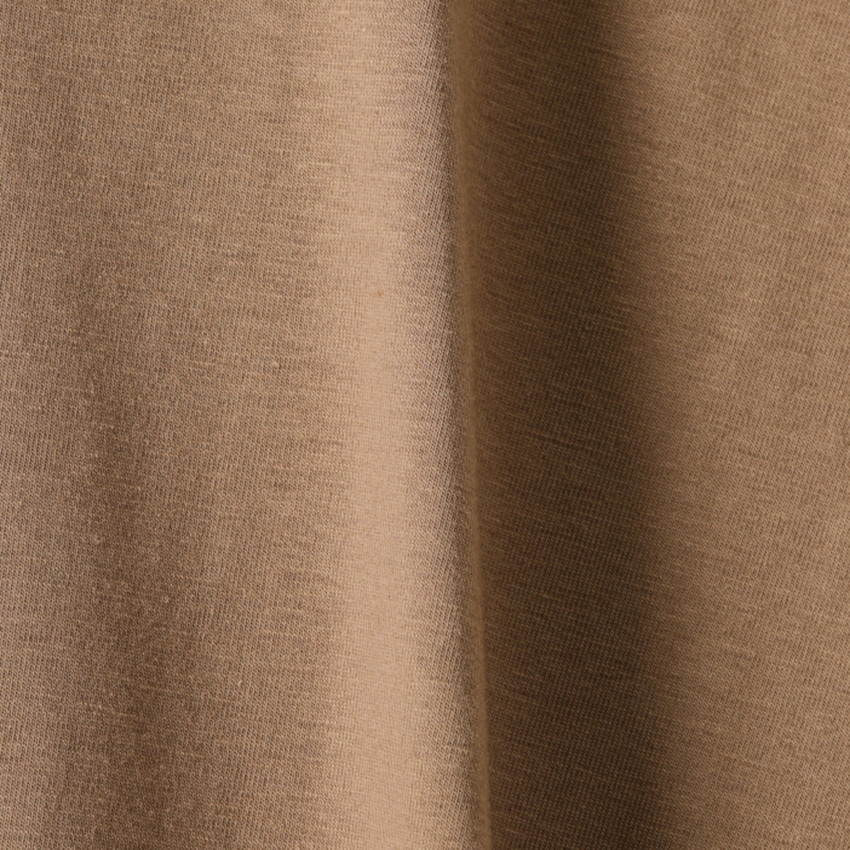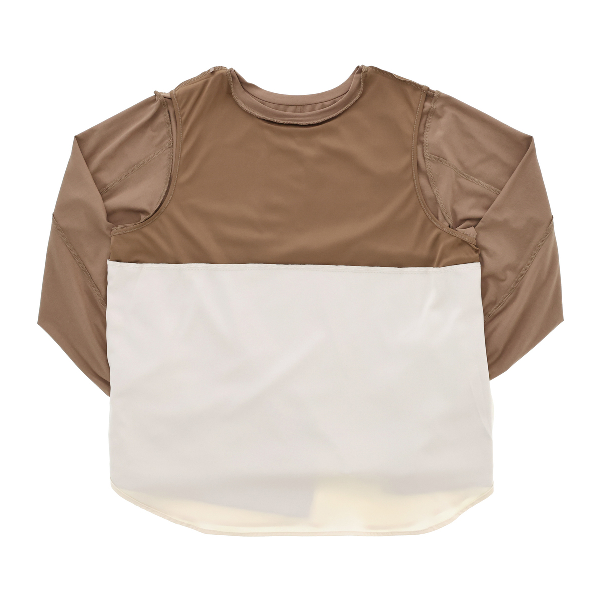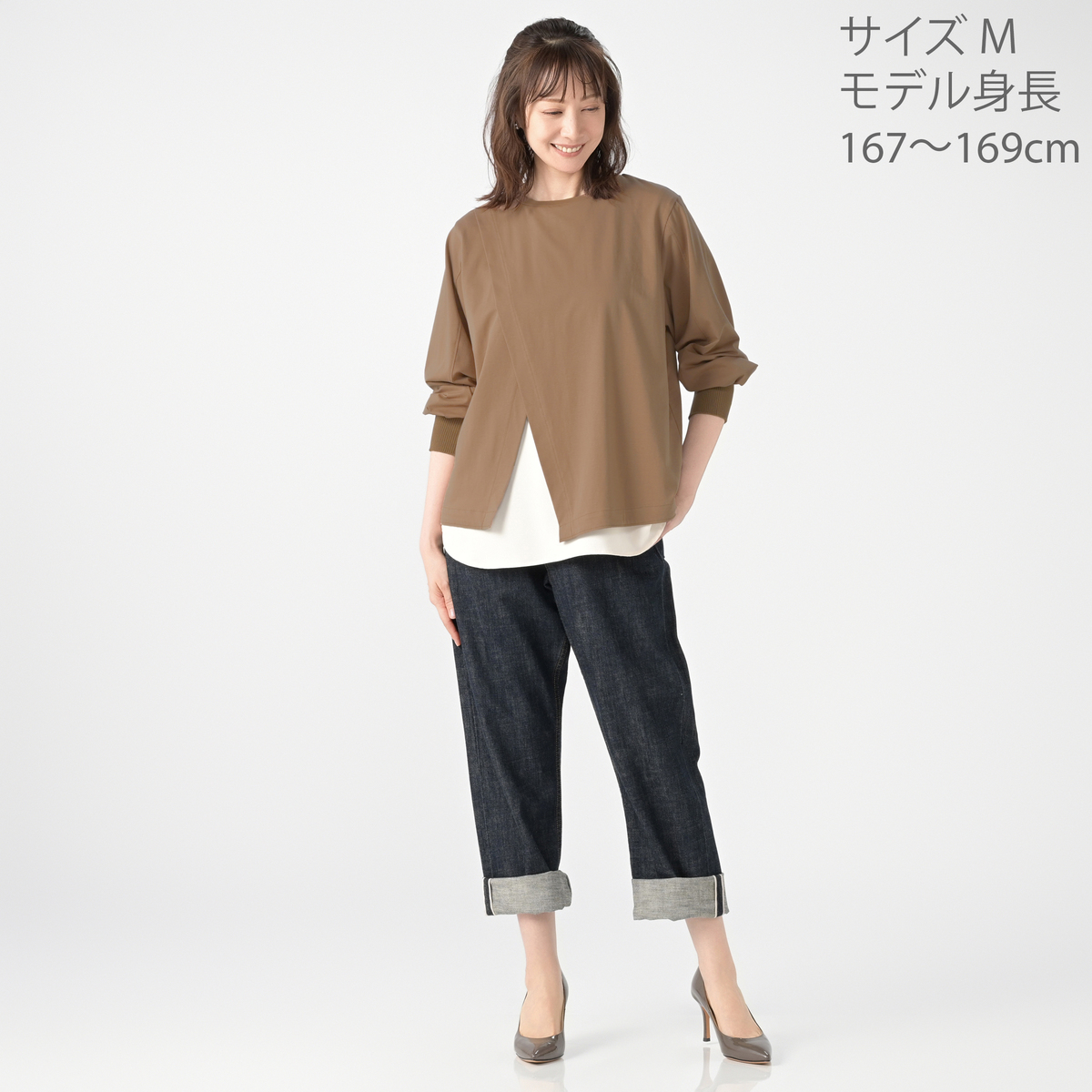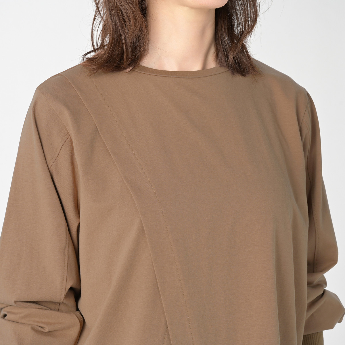 深めの重なりをつけたスリットデザインのプルオーバー。裏地プラス別布でレイヤード風になっており、一枚でもおしゃれな着こなしを演出します。上品に見えるカットソー素材で、裾からのぞく別布にはマットな光沢のジョーゼット素材を使用しました