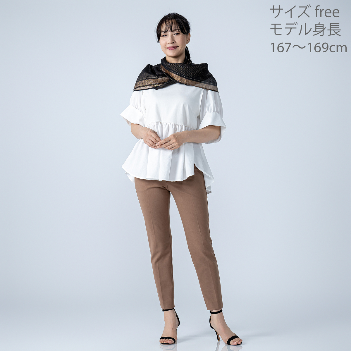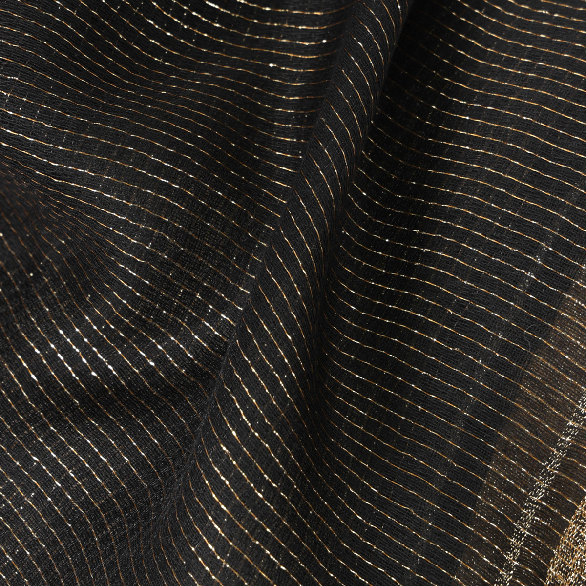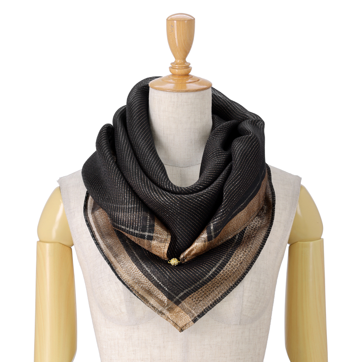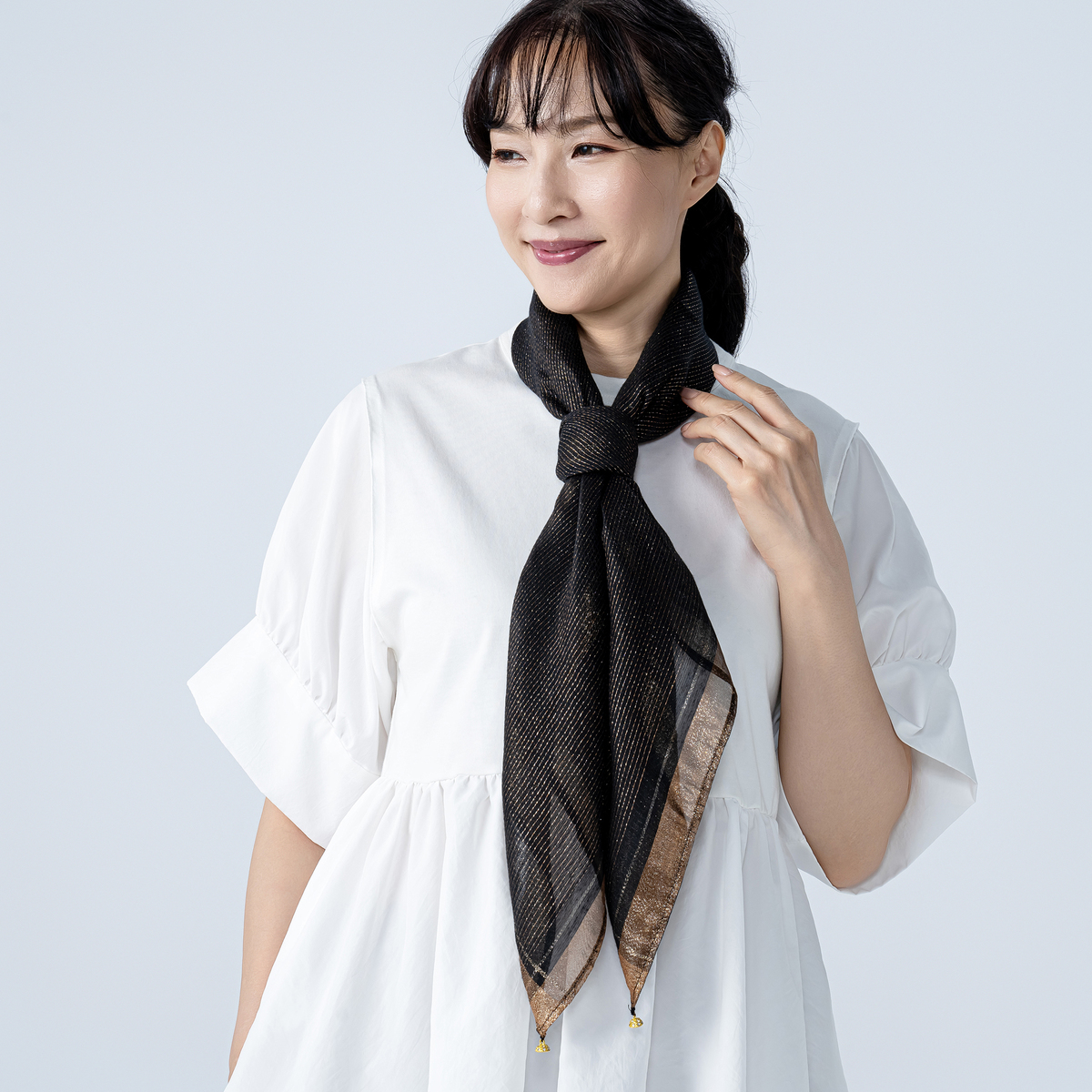 ゴールドのラメ糸を織り込んだストール。シア感のある素材が軽やかで、首元に華やぎを添えてくれます。洗濯機で洗えるため、汗や汚れが気になる時も手軽にお手入れできます(洗濯時は必ずネットを使用してください)