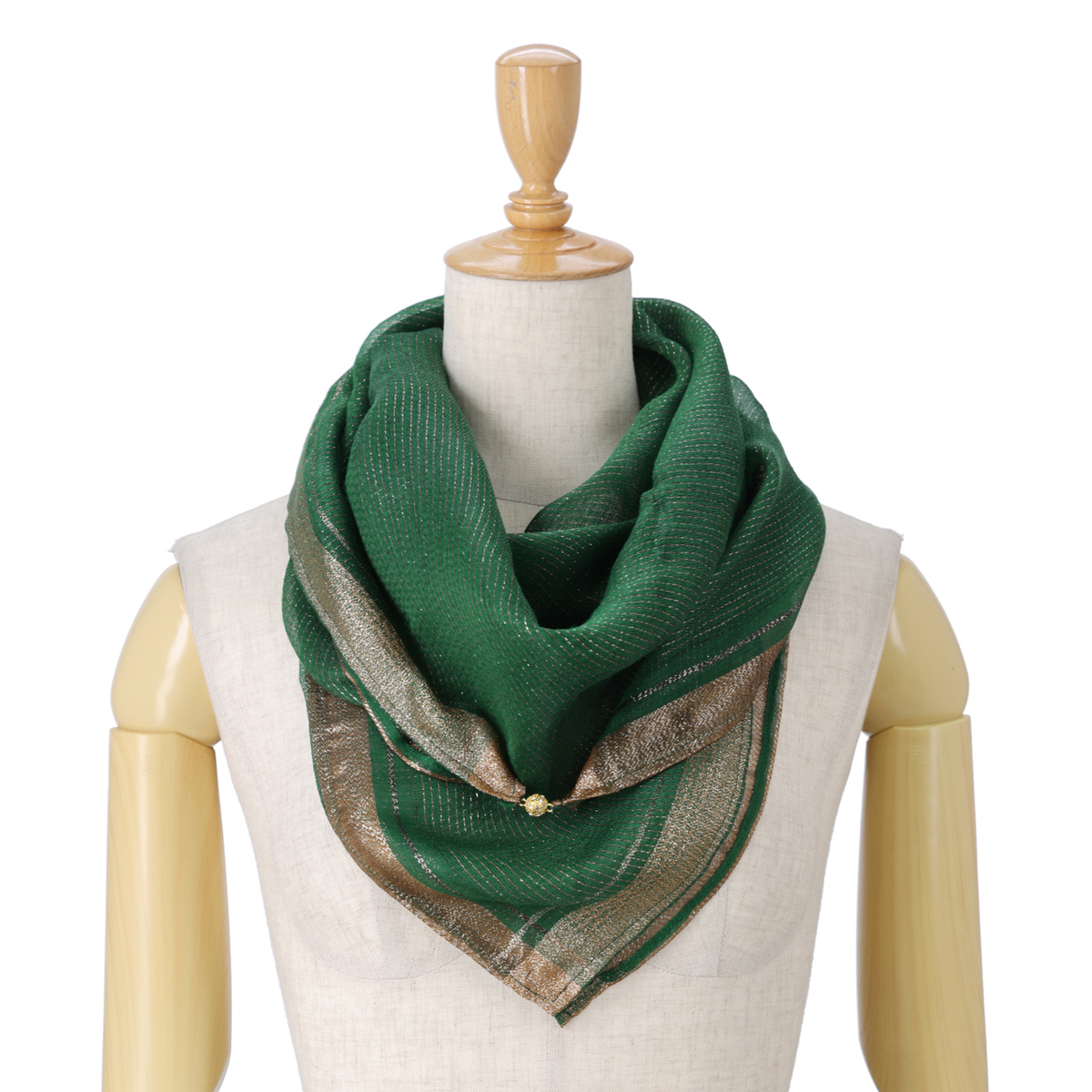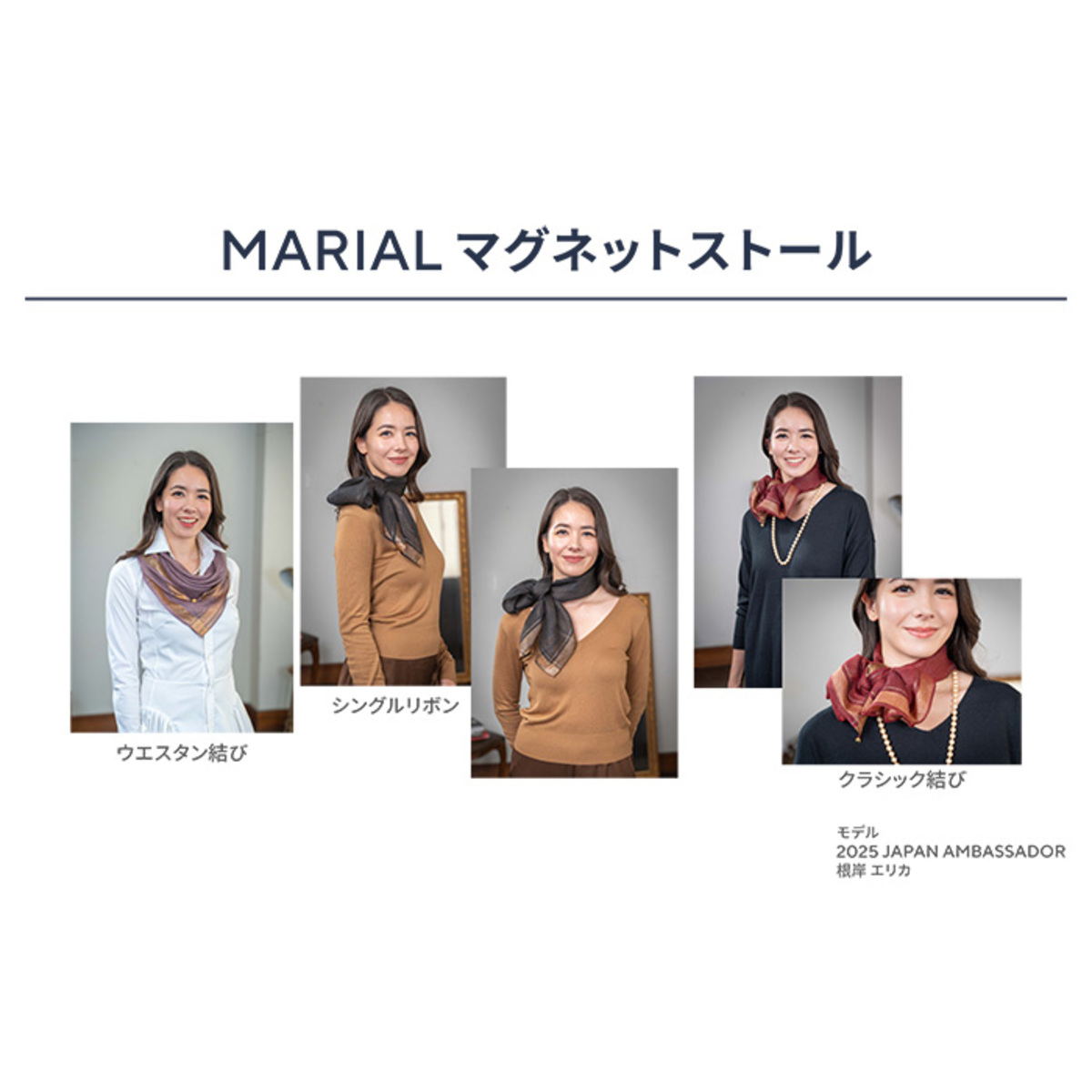 両端のマグネットパーツで、三角折、アフガン巻きや2重巻き、リボン結びなど簡単にスカーフアレンジができます。また、マグネット部分を内側に入れてバイアス折にしたり、長方形折にすると普通のスカーフのようにお使いいただけます。さらに、スカーフリングを使ったアレンジもでき、お洒落の幅も広がります