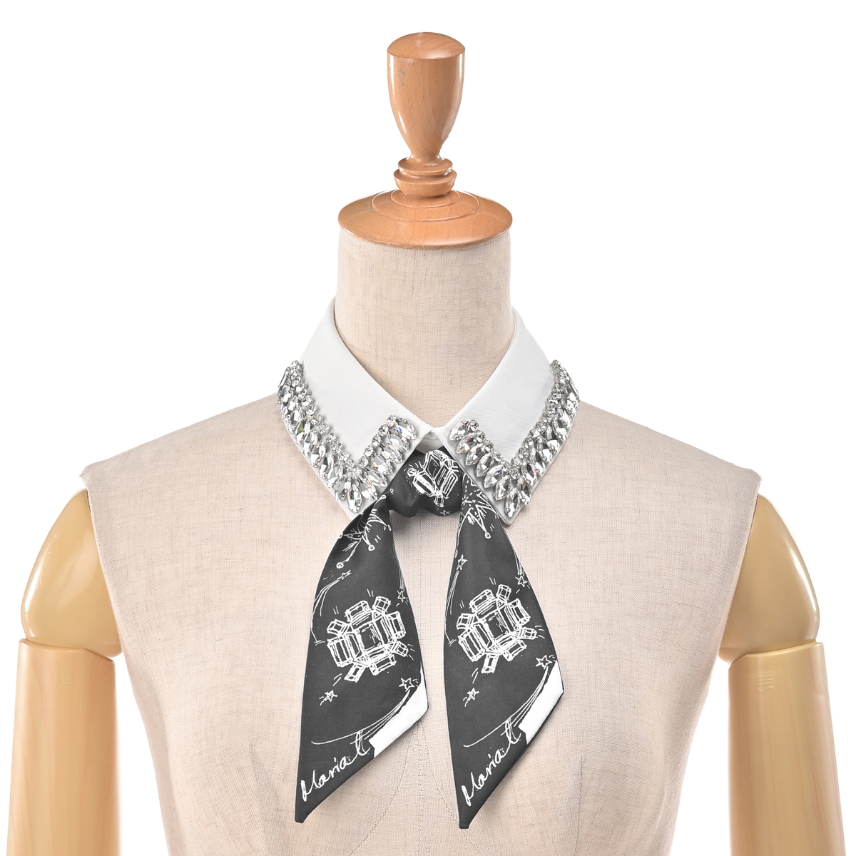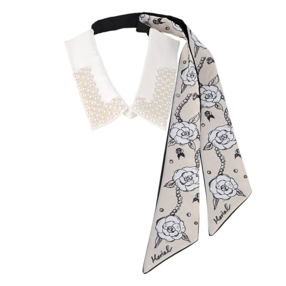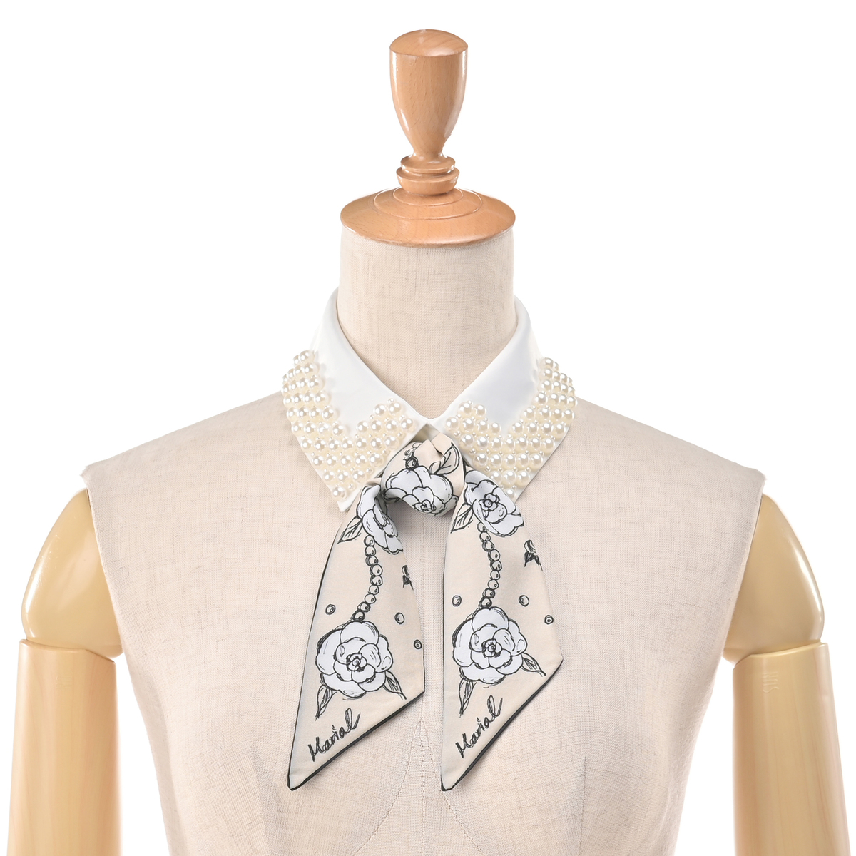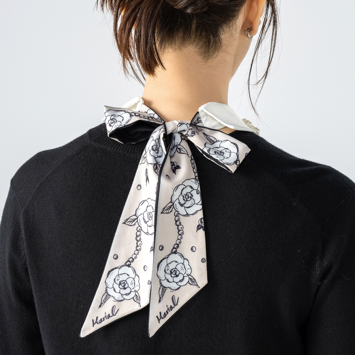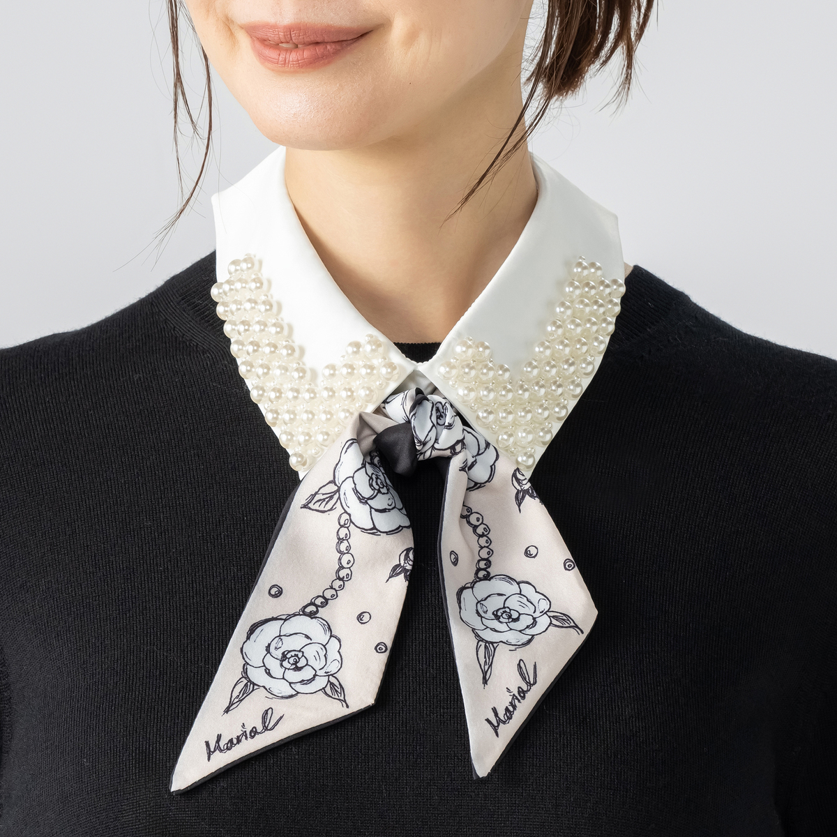 リボンスカーフを首の後ろで結んで付け襟に、前で結ぶとボウタイ付きのブラウス風に、長さを活かしたネクタイ風もオシャレです。襟を前にしてスカーフを2重巻きにして前で結んでも素敵です