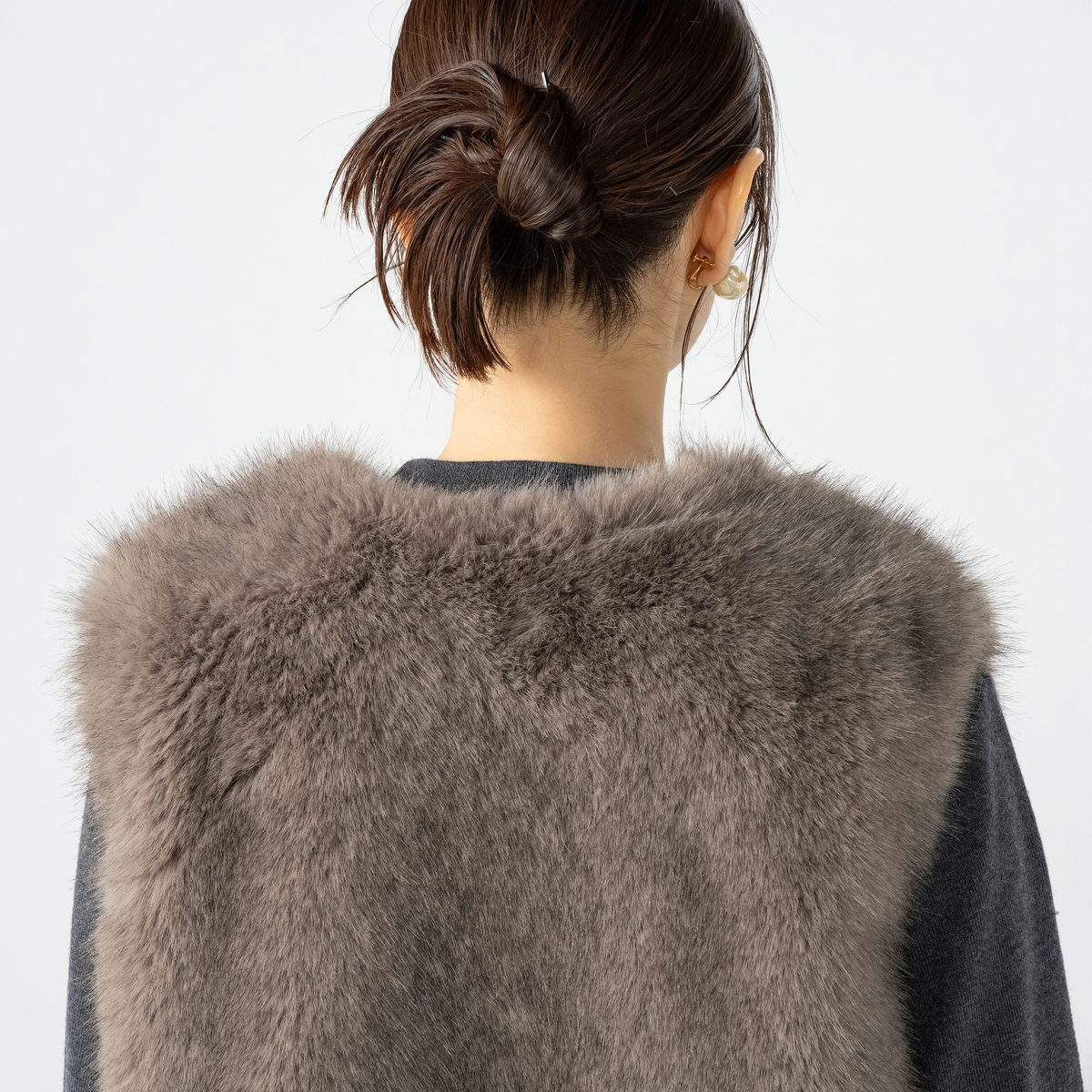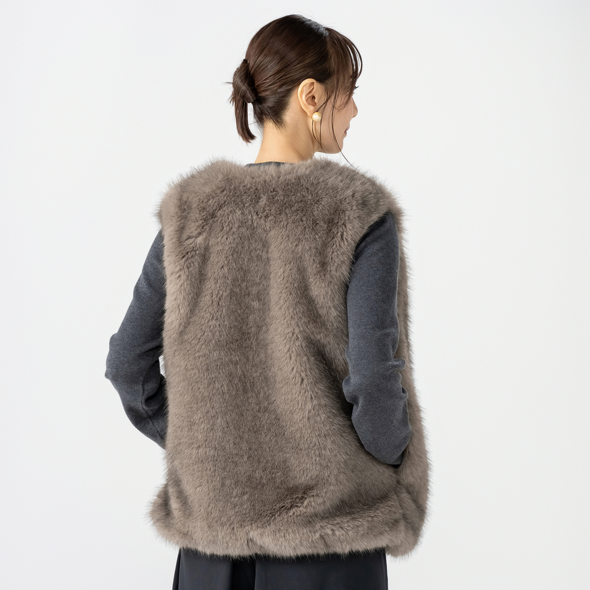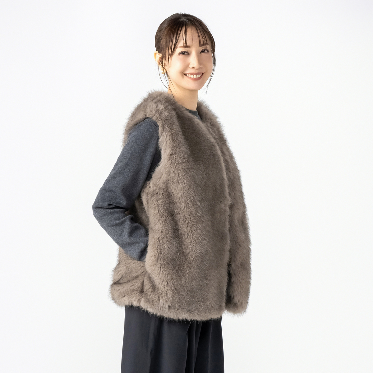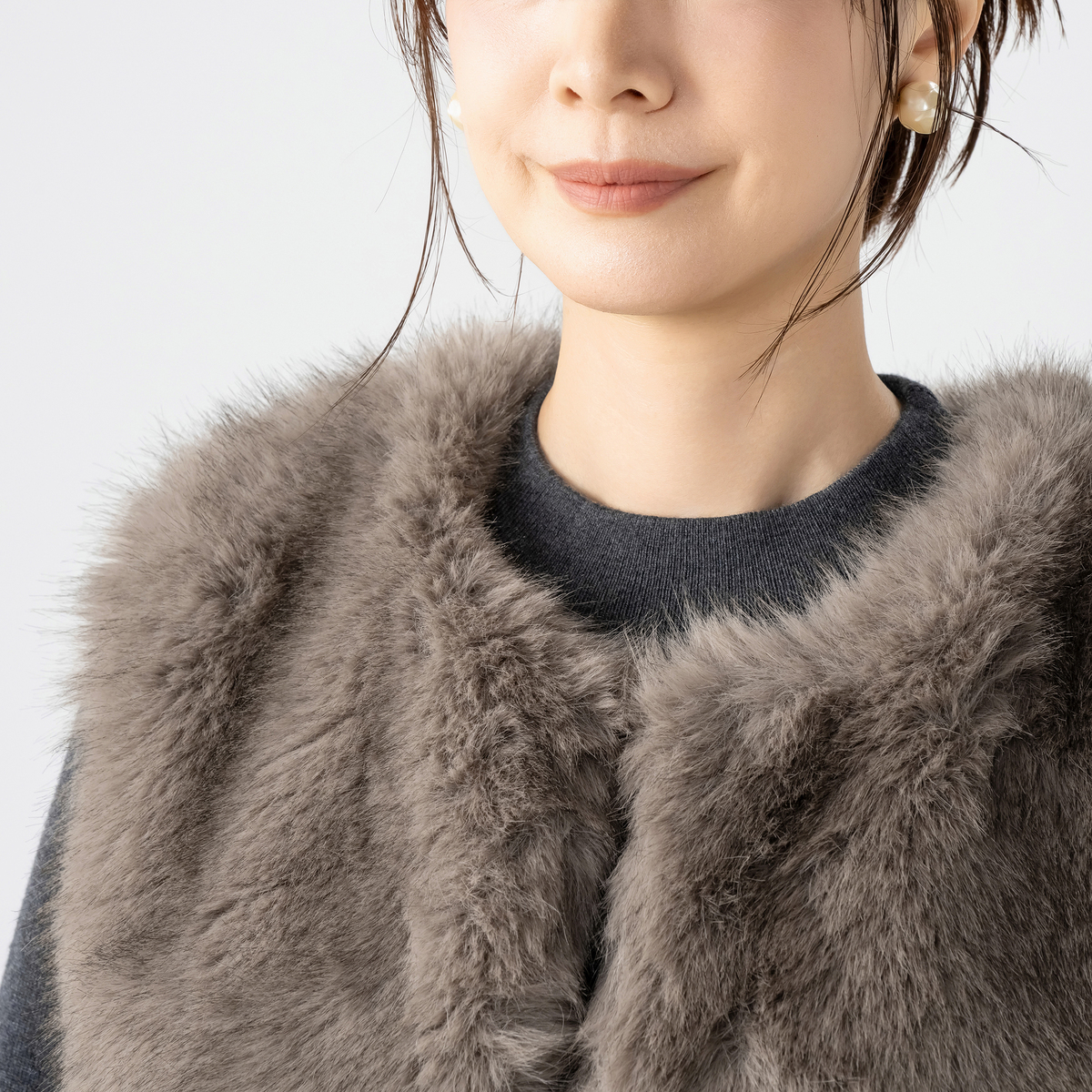 なめらかな毛並みのエコファーノーカラージレです。染色後のシルケット加工と、毛を丁寧にカットして整えることで、天然素材のような風合いに。毛並みの美しさがコーディネートに品を添えます