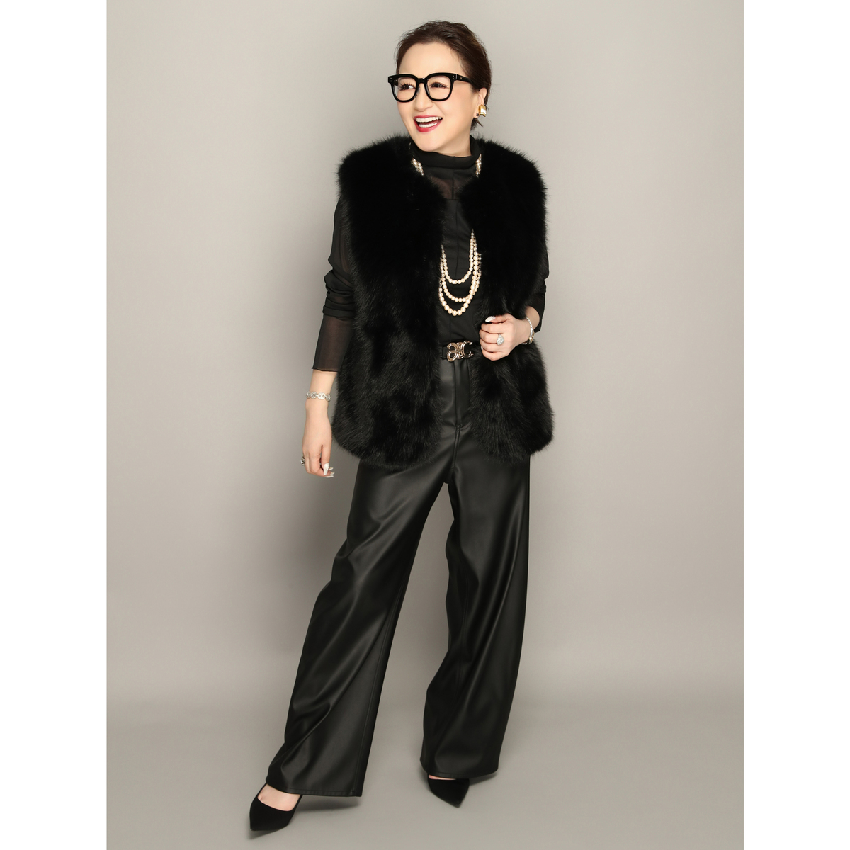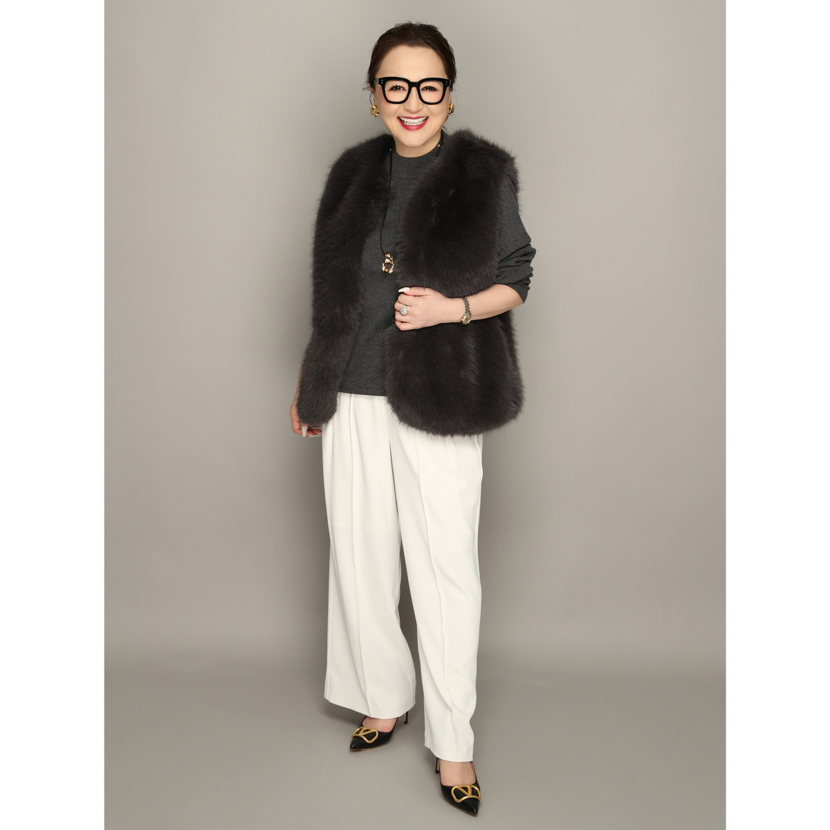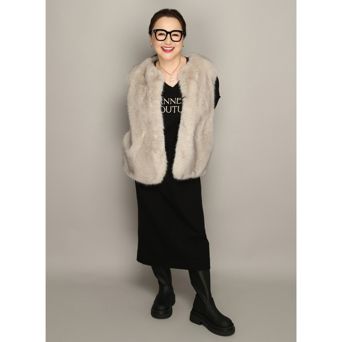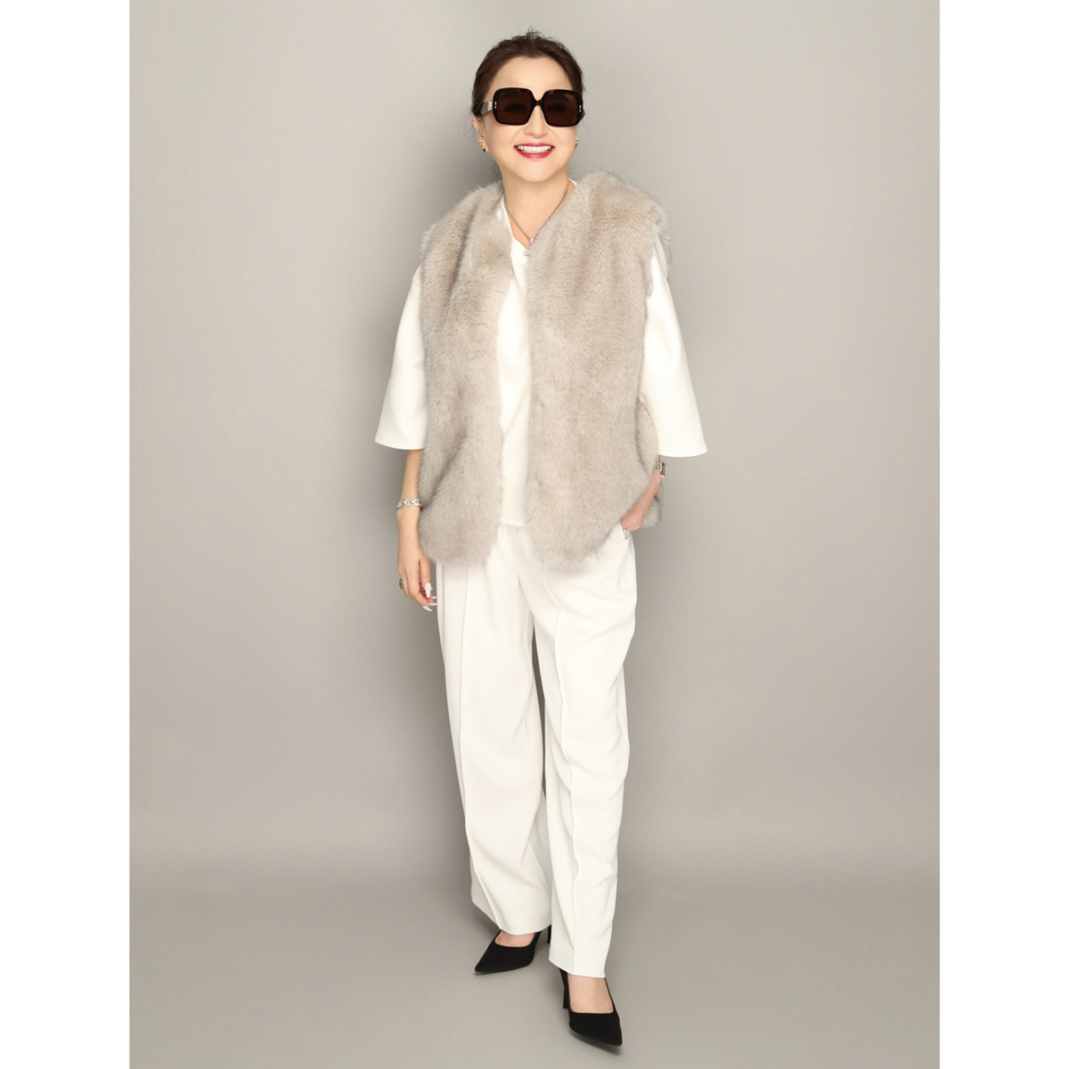 なめらかな毛並みのエコファーノーカラージレです。染色後のシルケット加工と、毛を丁寧にカットして整えることで、天然素材のような風合いに。毛並みの美しさがコーディネートに品を添えます