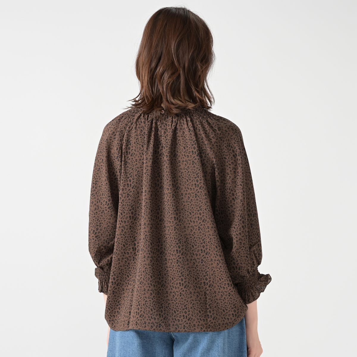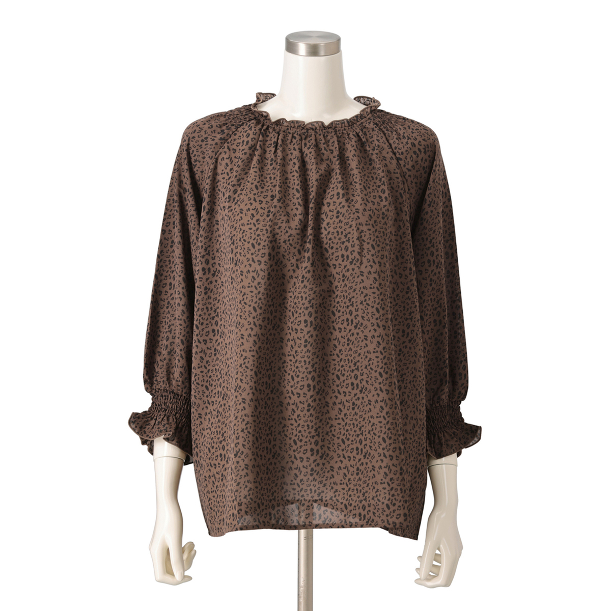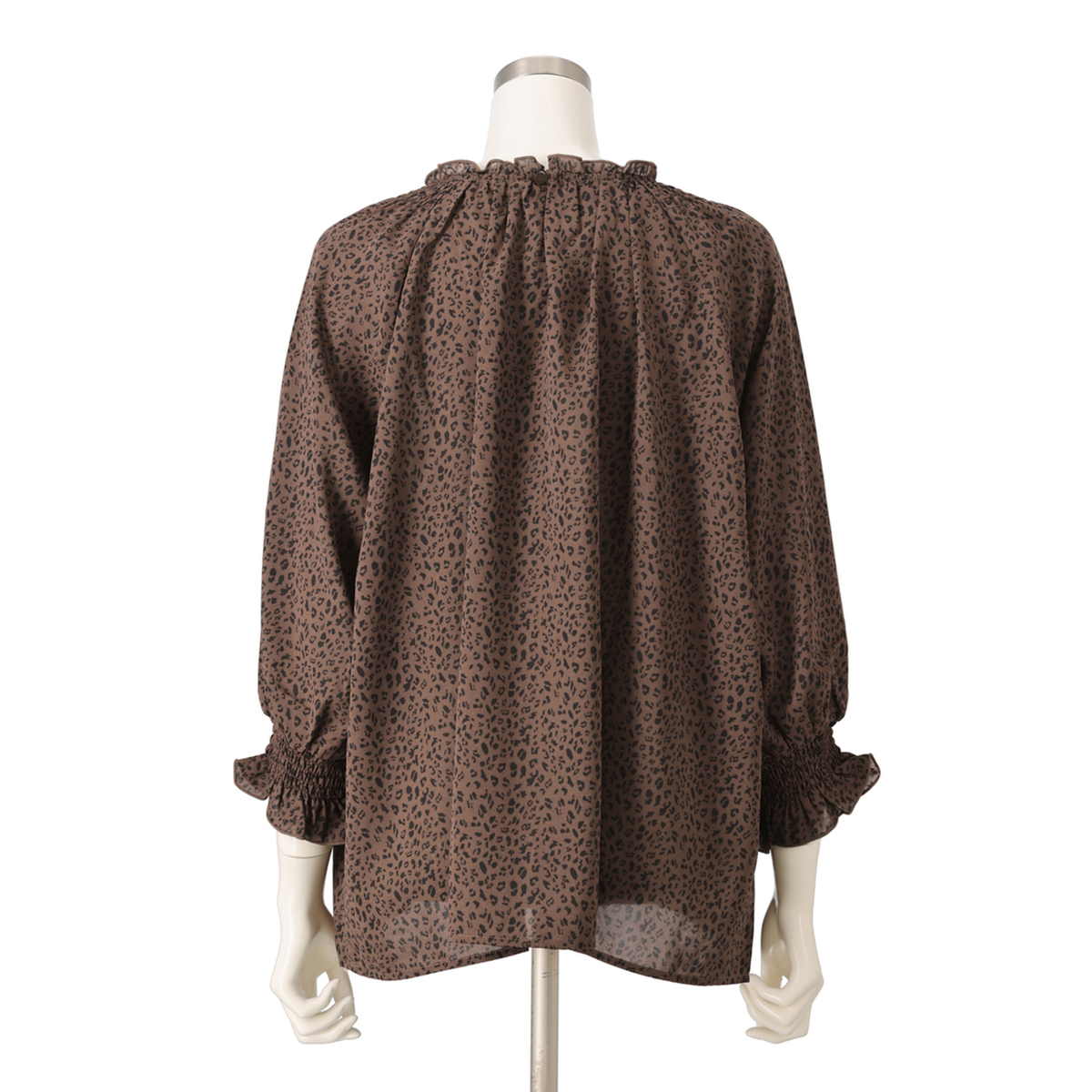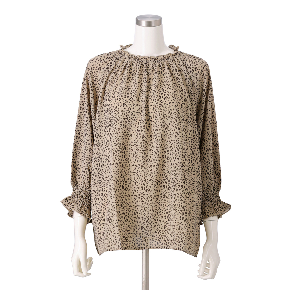 繊細なアニマル柄プリントのシャーリングフリルブラウス。衿と袖口に控えめにフリルを施し、甘辛MIXデザインに仕上げました