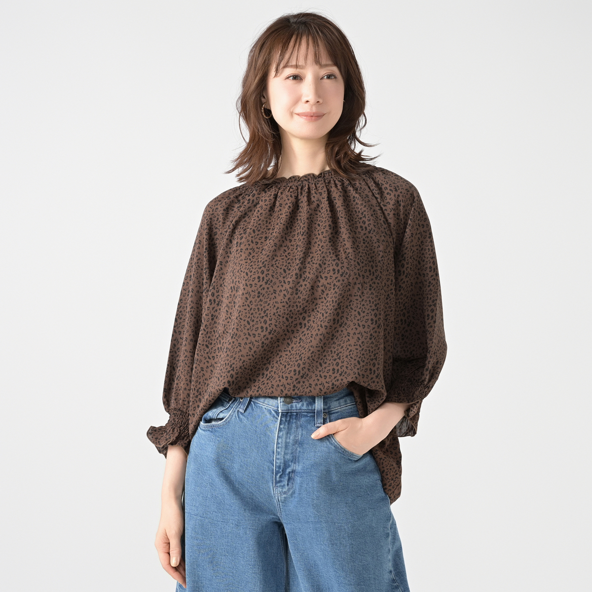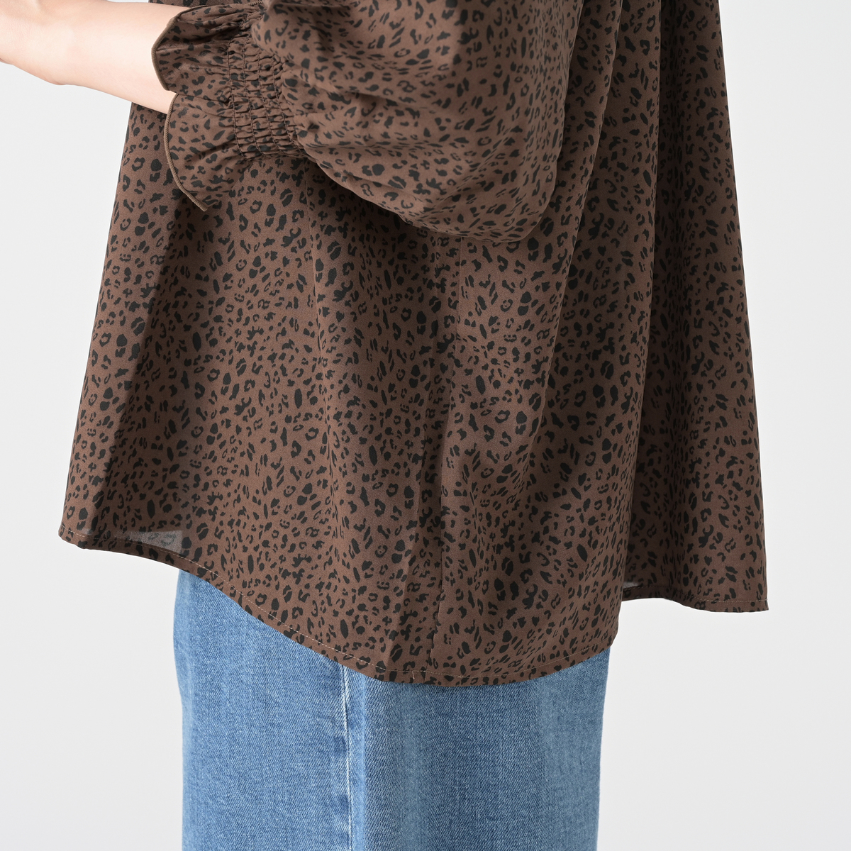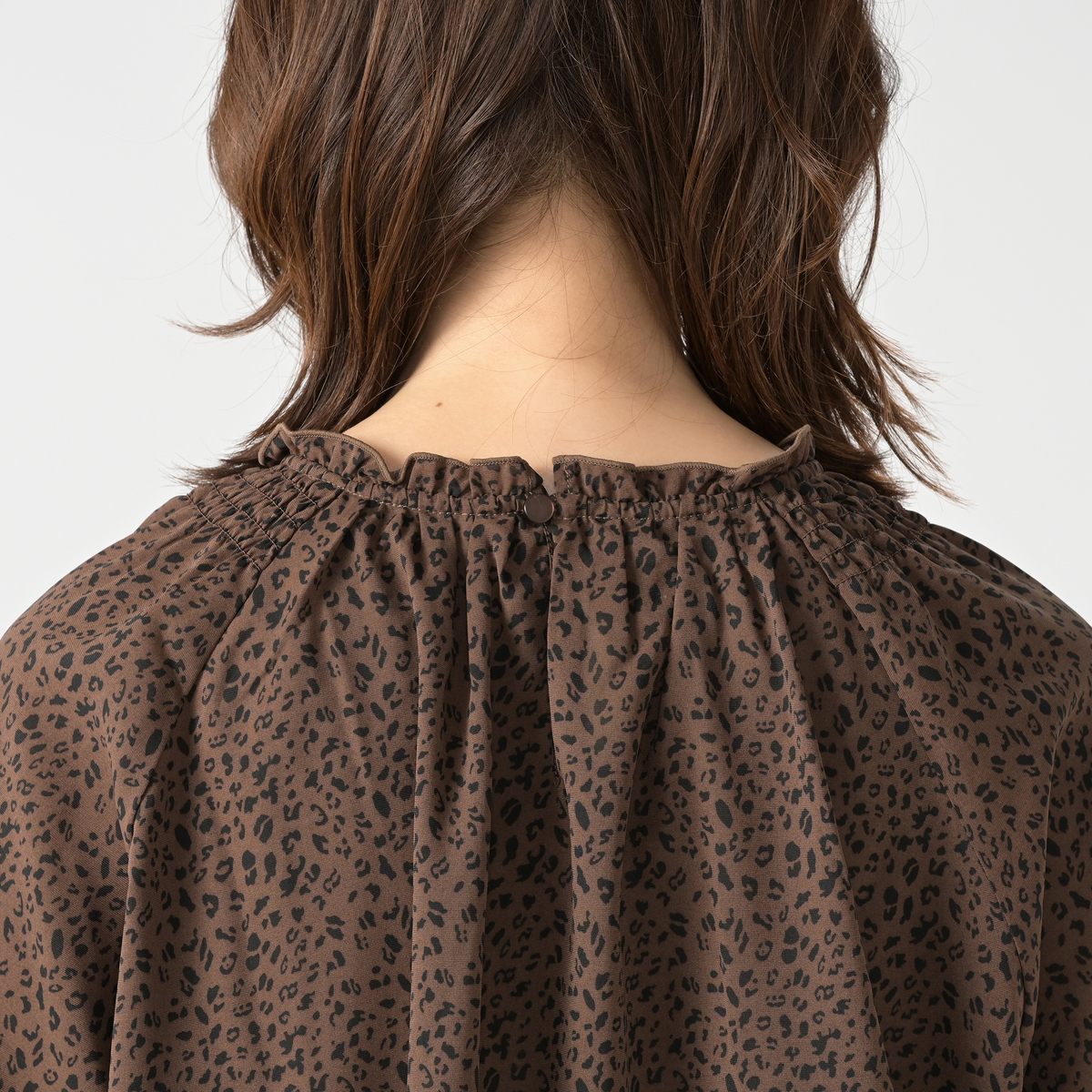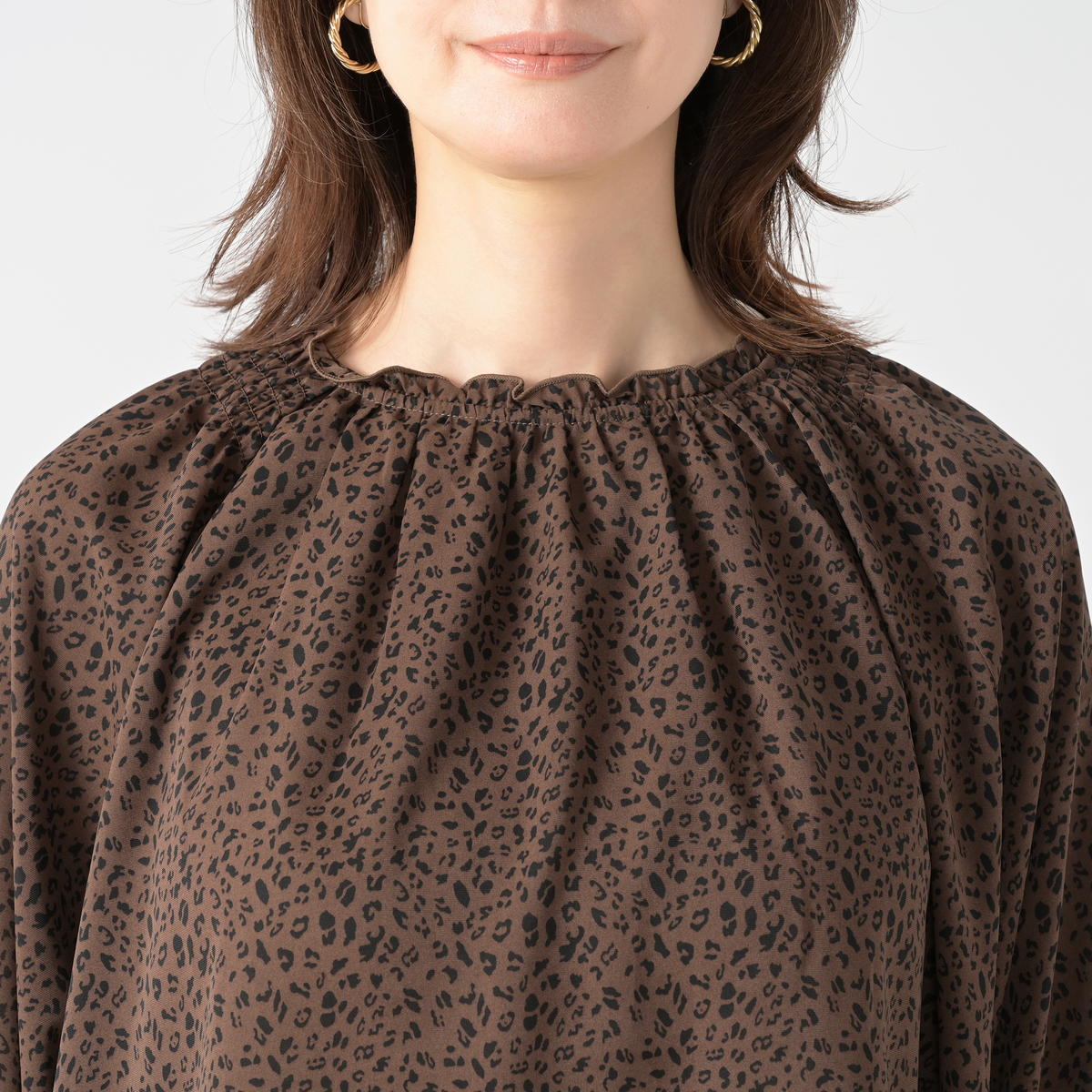 繊細なアニマル柄プリントのシャーリングフリルブラウス。衿と袖口に控えめにフリルを施し、甘辛MIXデザインに仕上げました