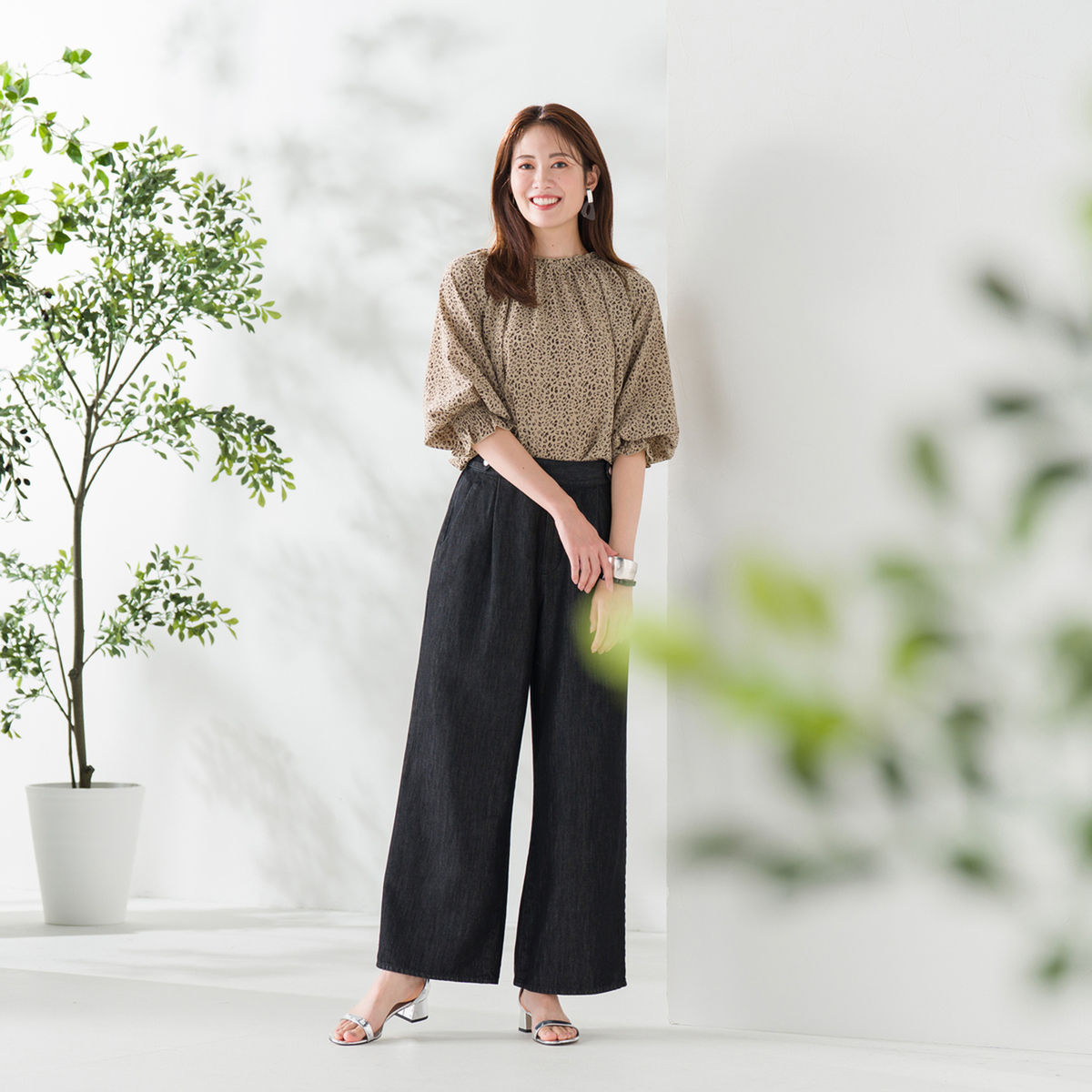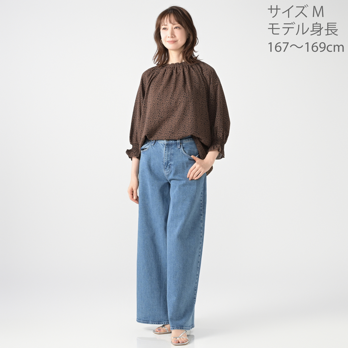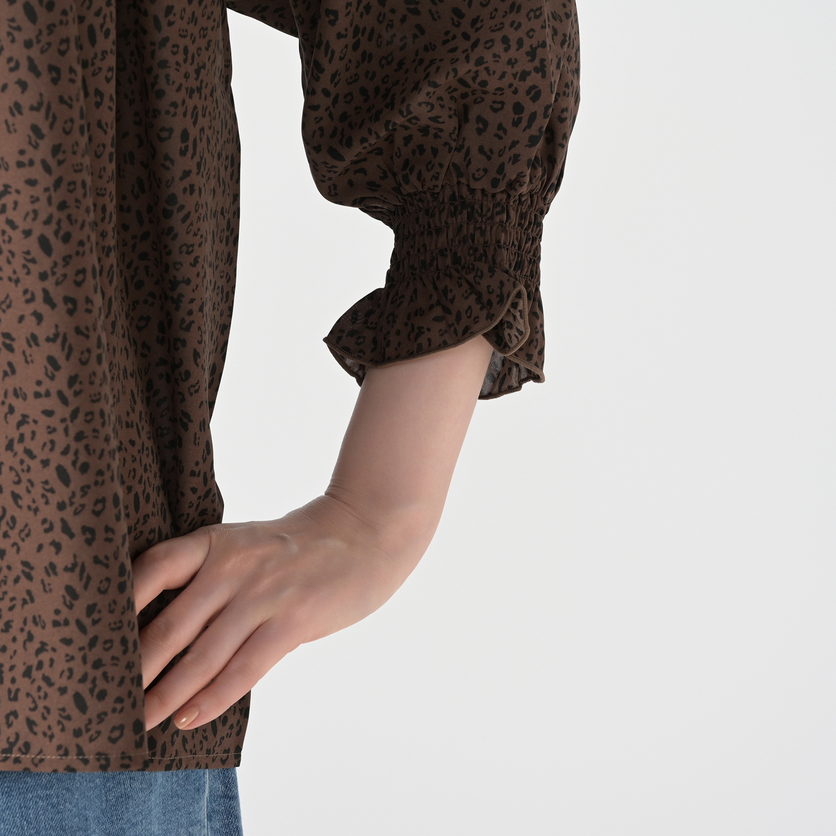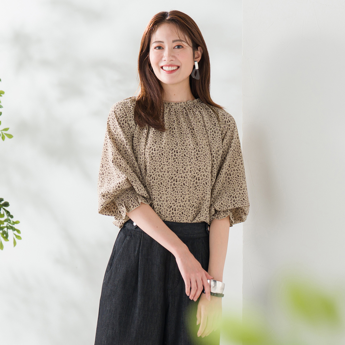 繊細なアニマル柄プリントのシャーリングフリルブラウス。衿と袖口に控えめにフリルを施し、甘辛MIXデザインに仕上げました