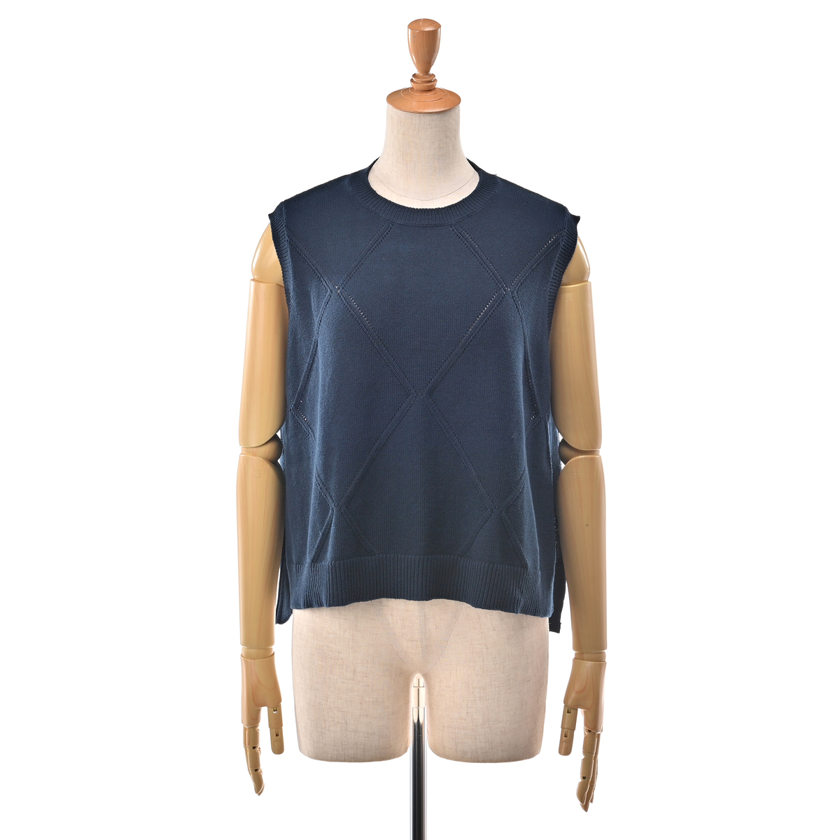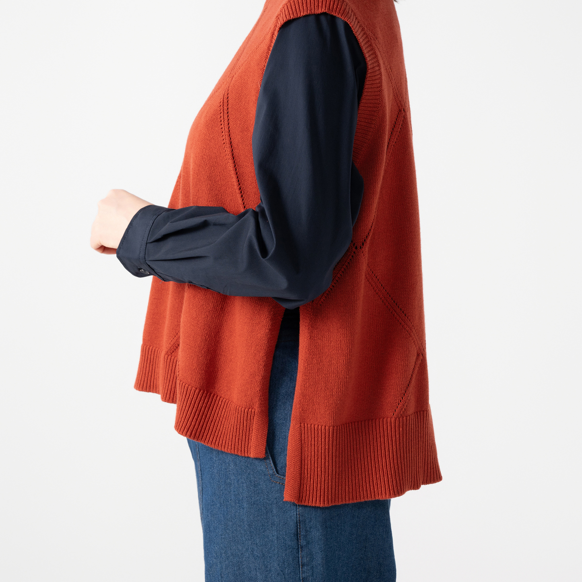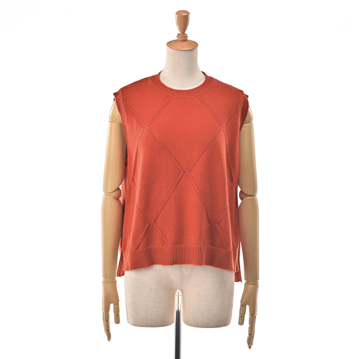 大きめのダイヤ柄が目を惹くニットベスト。シンプルな仕立てでさまざまなインナーと合わせやすく、裾のスリットが軽快な印象を与えます