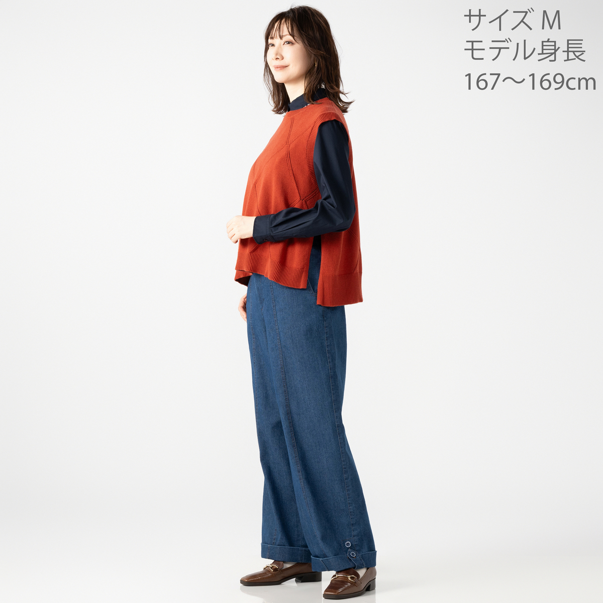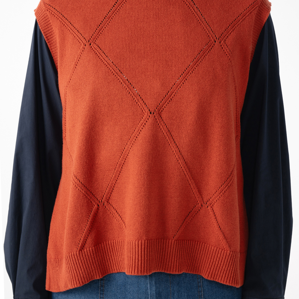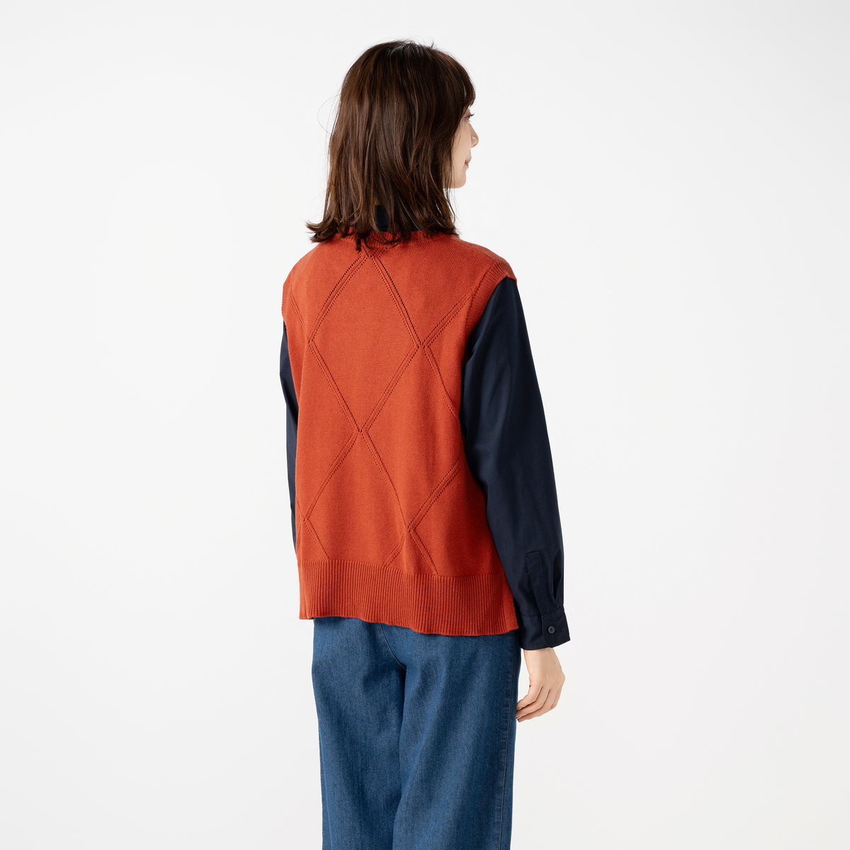 大きめのダイヤ柄が目を惹くニットベスト。シンプルな仕立てでさまざまなインナーと合わせやすく、裾のスリットが軽快な印象を与えます