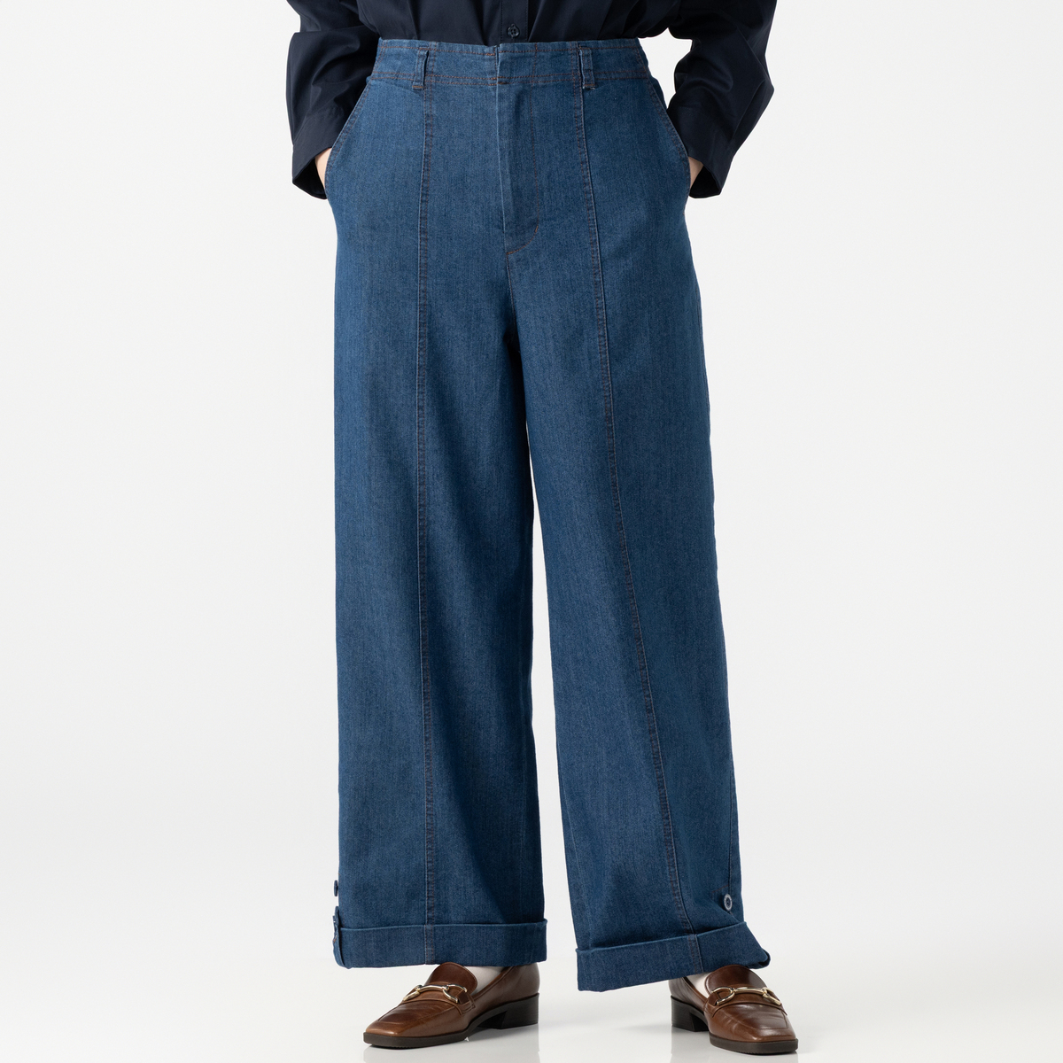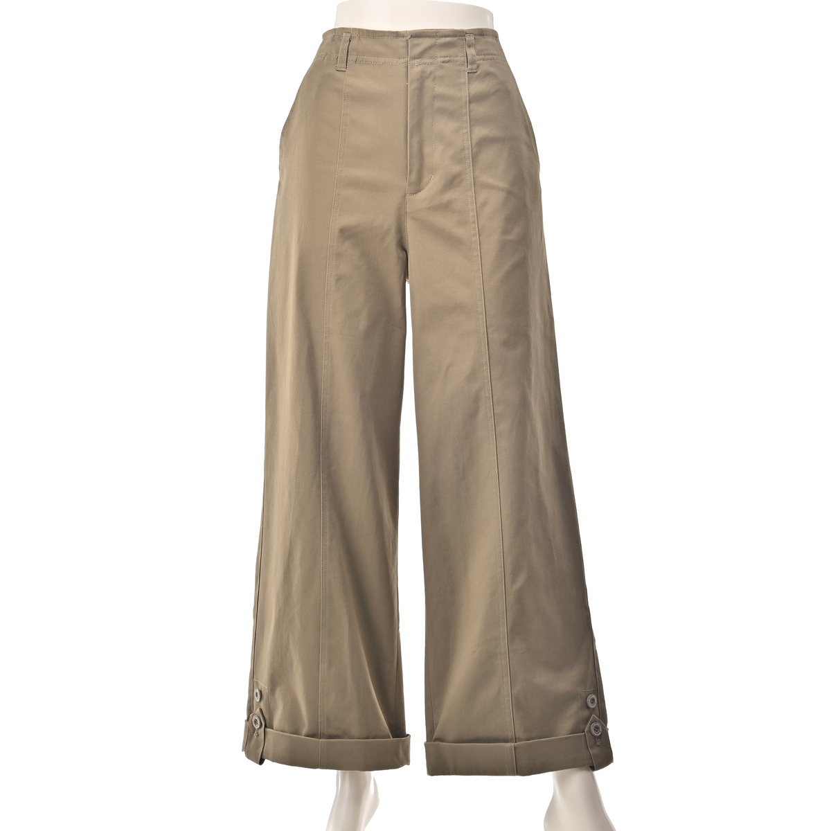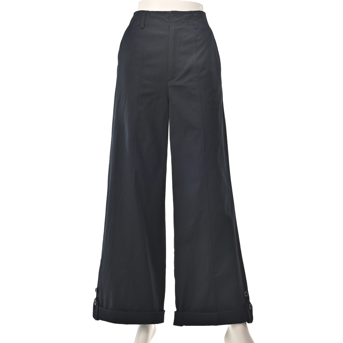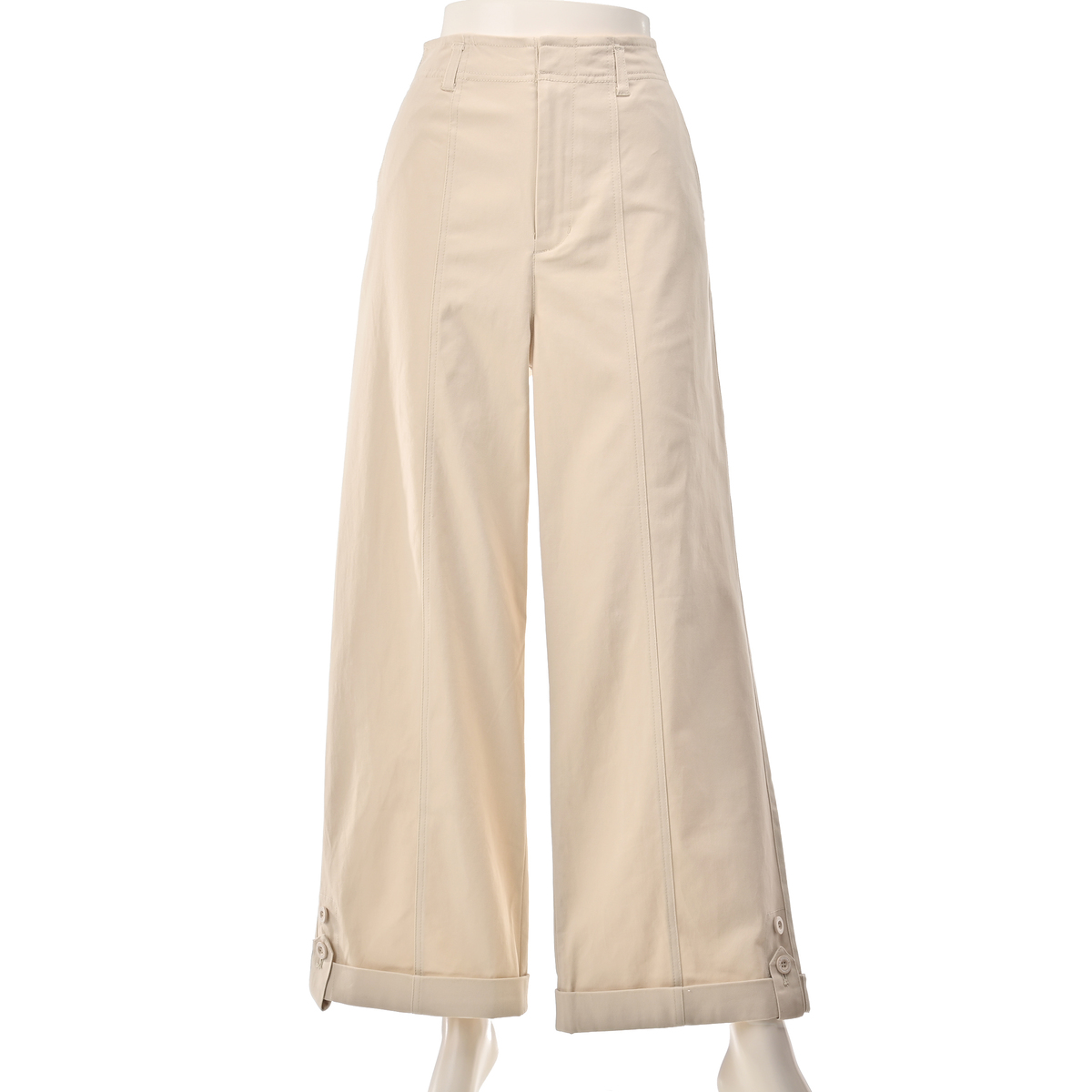 前身頃中心に切り替えを施したワイドシルエットパンツ。ターンバックデザインに仕上げた裾がポイント。折り返さずに穿くこともでき、丈感を調整できます
