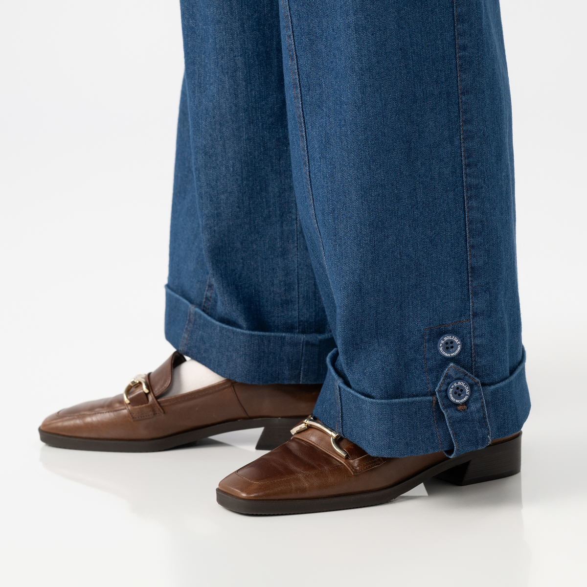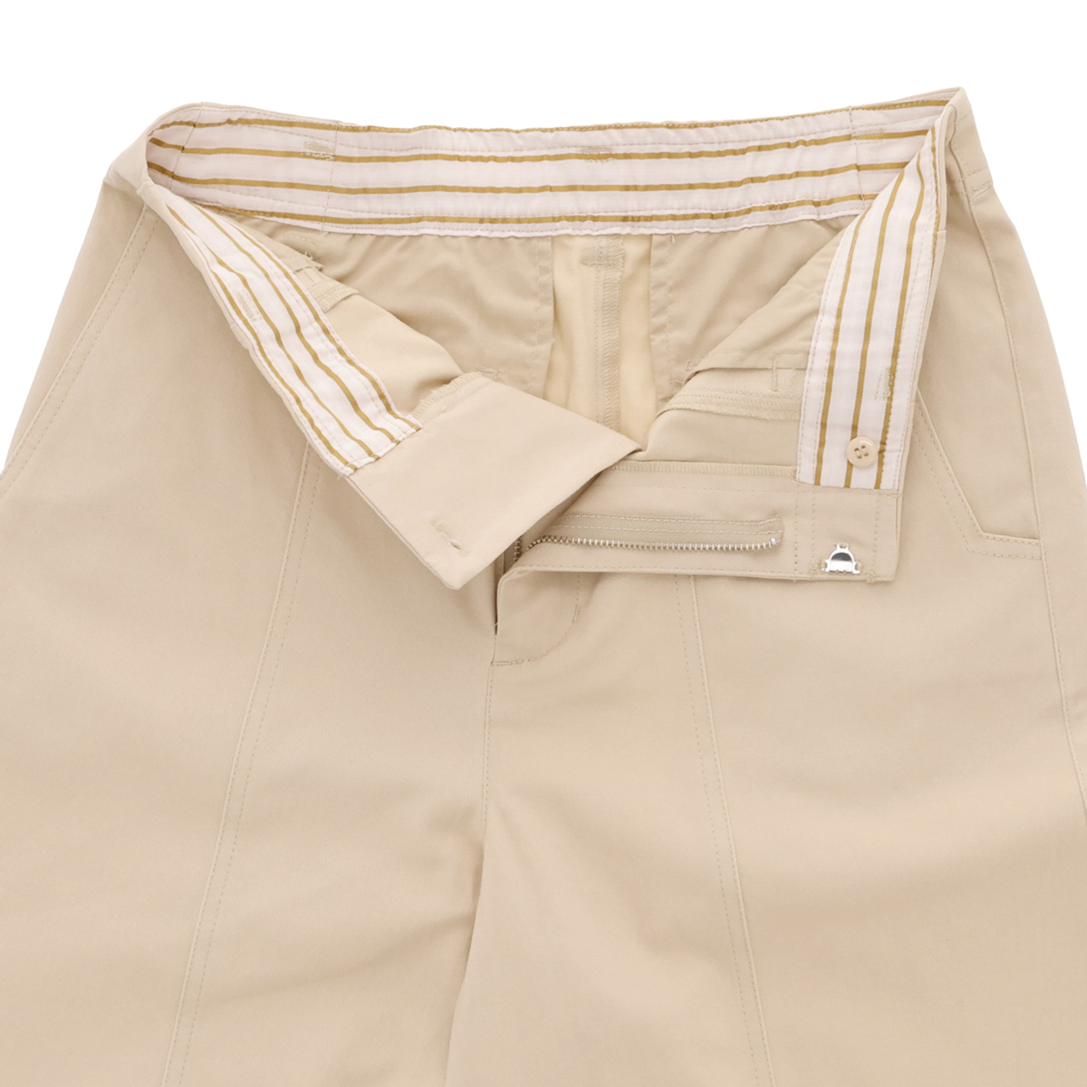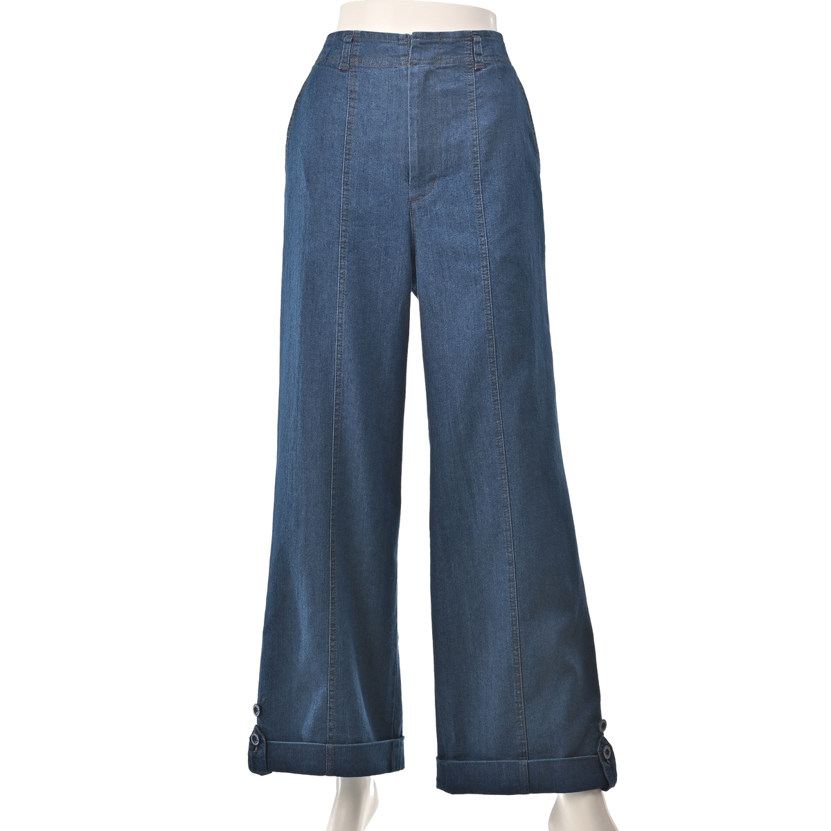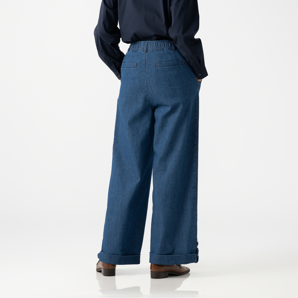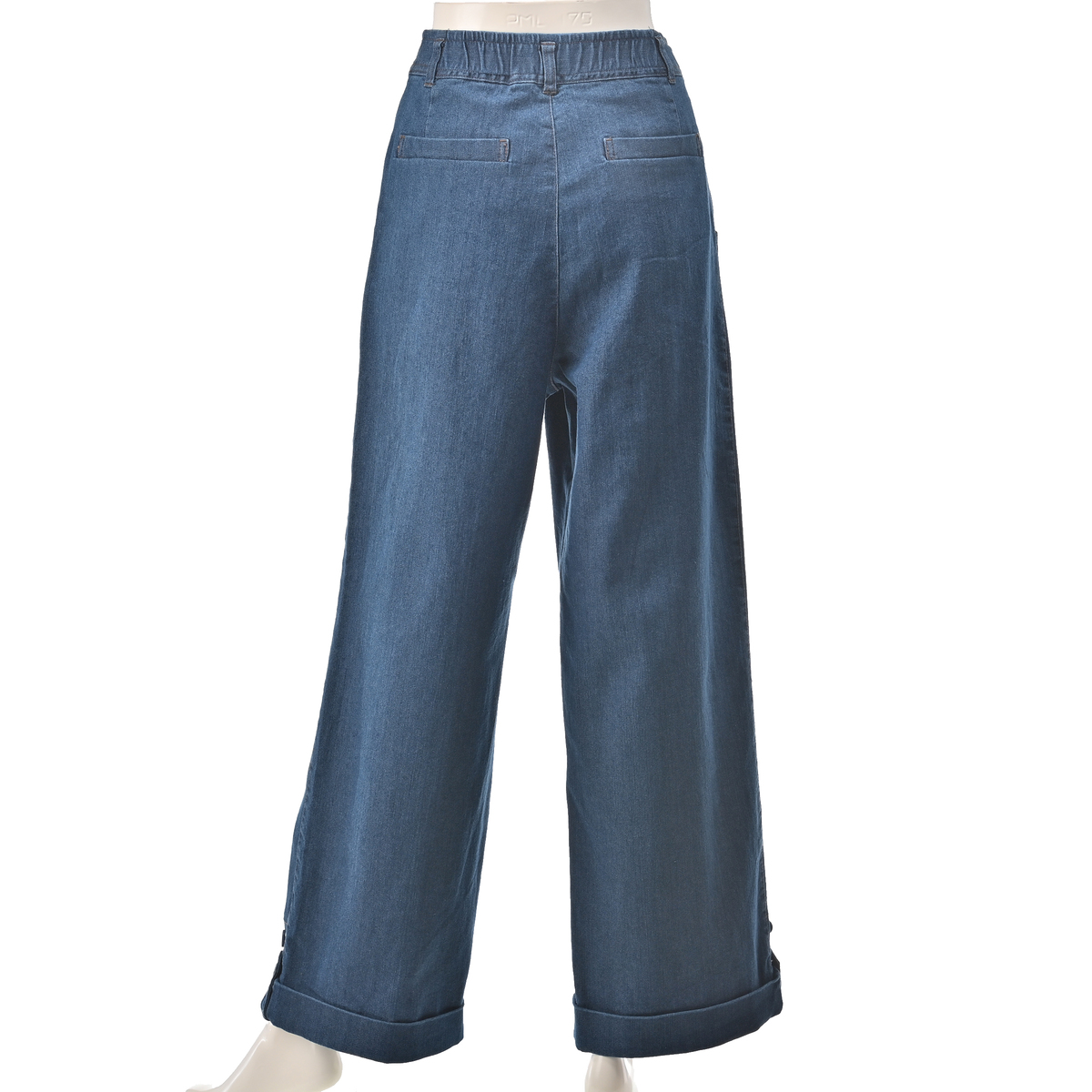 前身頃中心に切り替えを施したワイドシルエットパンツ。ターンバックデザインに仕上げた裾がポイント。折り返さずに穿くこともでき、丈感を調整できます