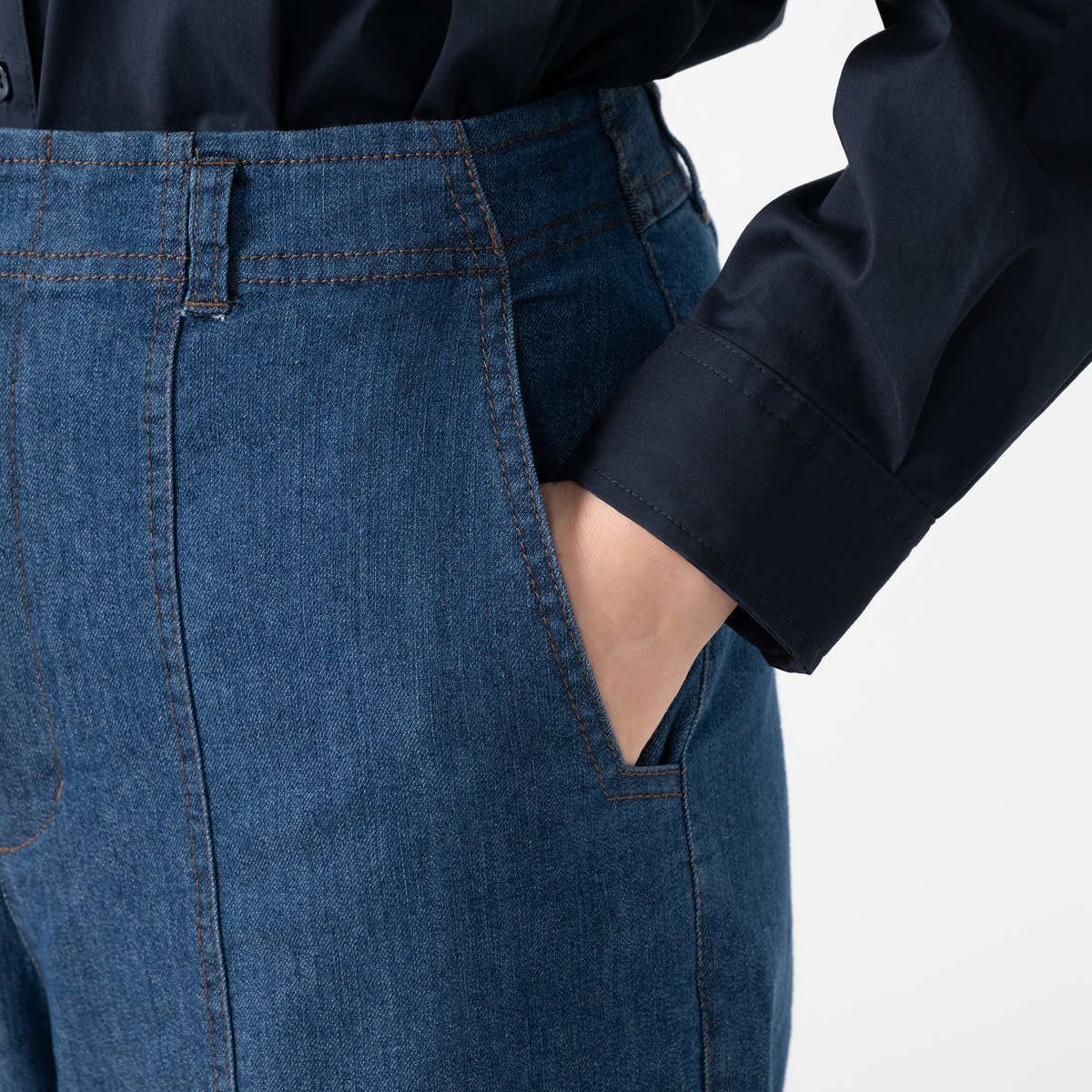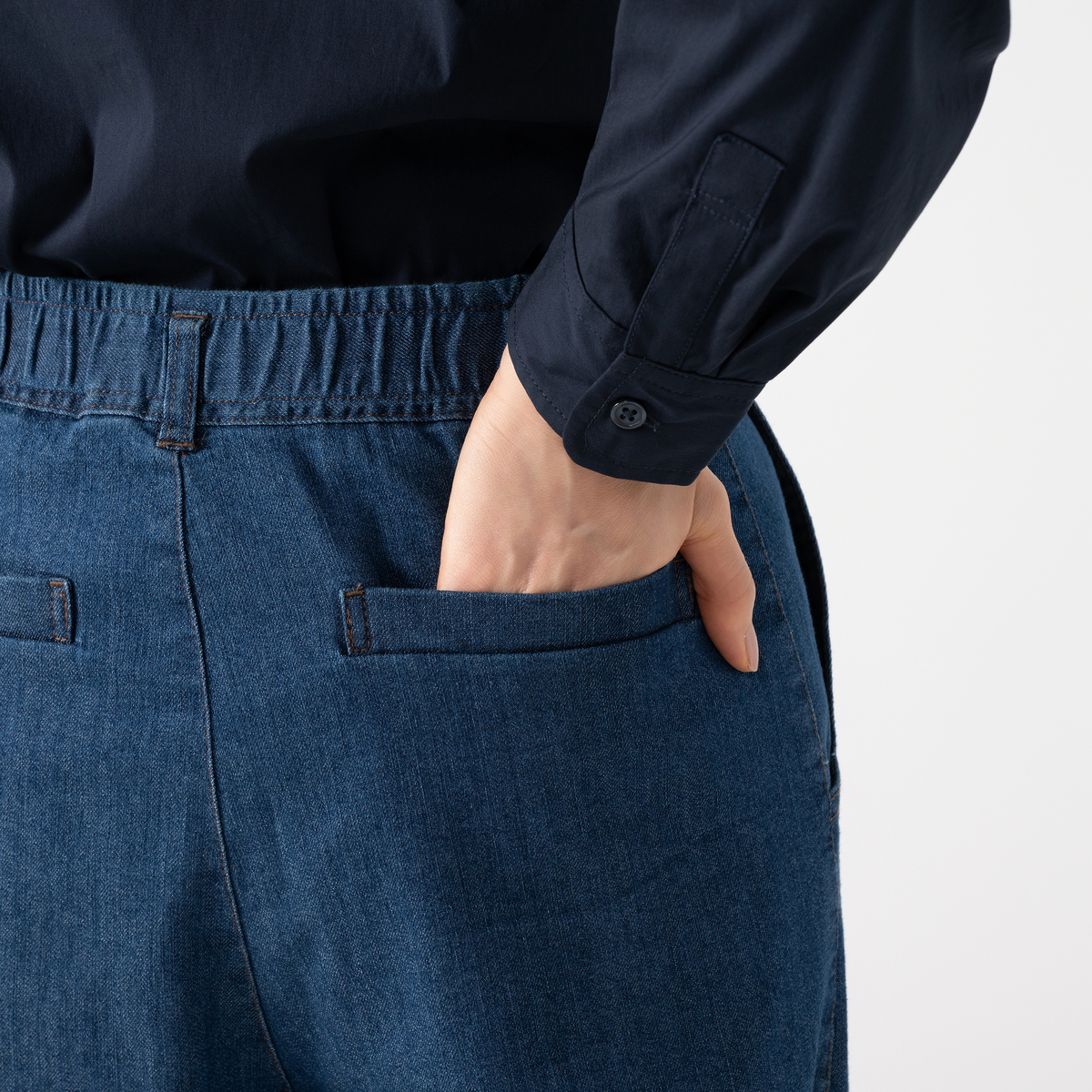 [商品寸法(ヌード)cm] サイズ ウエスト ヒップ 股下 S : 66(58〜64) 91.5(82〜90) 68 M : 71(64〜70) 96.5(87〜95) 68 L : 76(69〜77) 101.5(92〜100) 68 LL : 82(77〜85) 107.5(97〜105) 68 3L : 88(85〜93) 113.5(102〜110) 68 サイズ 前股ぐり わたり幅 S : 29.5 31 M : 30 33 L : 30.5 35 LL : 31 36 3L : 31.5 38 [ウエストゴム]後ろ一部に有 [素材] <インディゴブルー> 本体:綿75%、ポリエステル20%、ポリウレタン5% 別布:ポリエステル50%、レーヨン30%、綿20% <ベージュ、モカ、ネイビー> 本体:綿90%、レーヨン5%、ポリウレタン5% 別布:ポリエステル50%、レーヨン30%、綿20% [お手入れ]洗濯機洗い可 [注意事項] ※商品寸法の誤差は多少発生します。ご了承下さい ※洗濯の際には必ずネットを使用して下さい ※淡色製品には蛍光増白剤入り洗剤を使用しないで下さい ※洗濯後はすぐに脱水し、形を整えて干して下さい。長時間水につけたままにしないで下さい ※濃色製品は着用中の摩擦により色移りすることがあります。また、雨や汗等で濡れた状態で着用すると色移りすることがあります。その際はお早めに洗濯をして下さい ※素材の特性上、着用や洗濯・クリーニング時の摩擦により毛羽立ち、毛玉が発生します。その際はお早めに毛玉取り器等で手入れをして下さい ※洗濯・クリーニングの際、色落ちすることがありますので他の物と分けて洗って下さい ※直射日光や蛍光灯の影響で変色することがありますのでご了承下さい ※デリケートな素材を使用していますので、爪やアクセサリーなどの引っ掛かりによりキズがつきやすくなっております。縫目や生地を強く引っ張らないよう注意して下さい ※付属部分にアイロンを当てないで下さい ※アイロンは、あて布をご使用ください 【中国製】