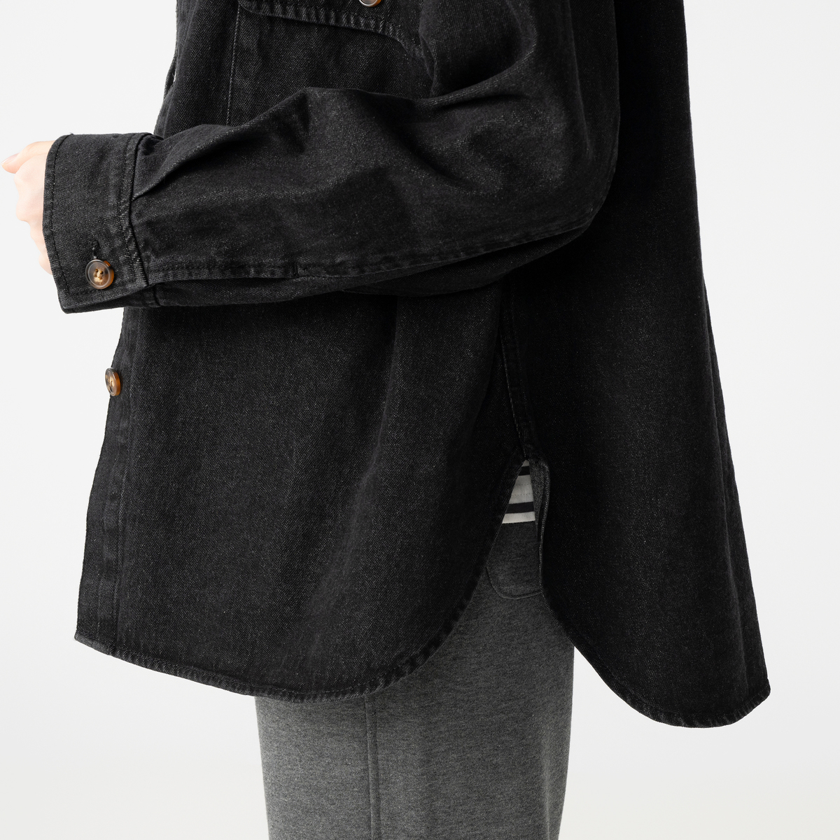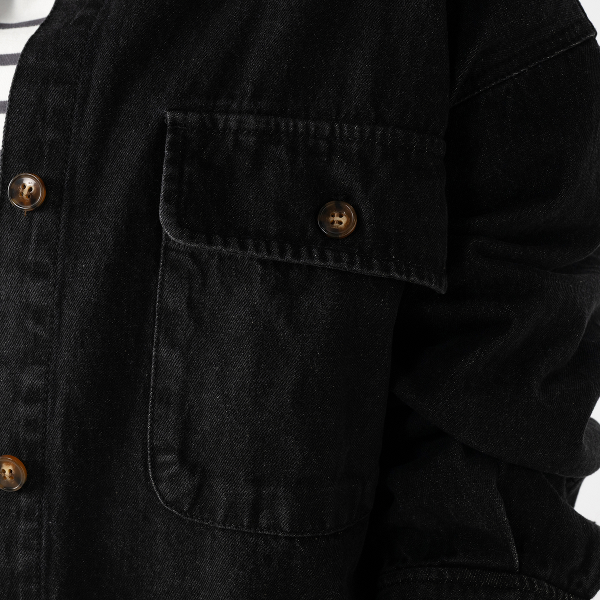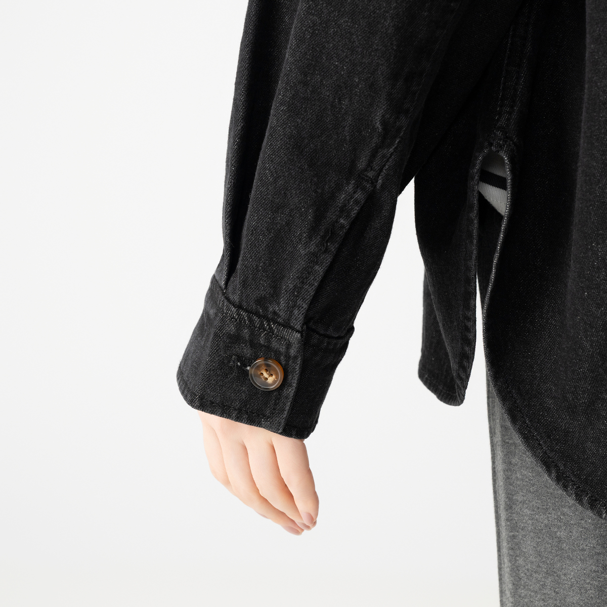 大きめに羽織るイメージのシャツジャケット。デニムなので様々なアイテムと合わせやすく、羽織るだけでトレンド感のある着こなしに。胸ポケットがアクセントになるデザインです