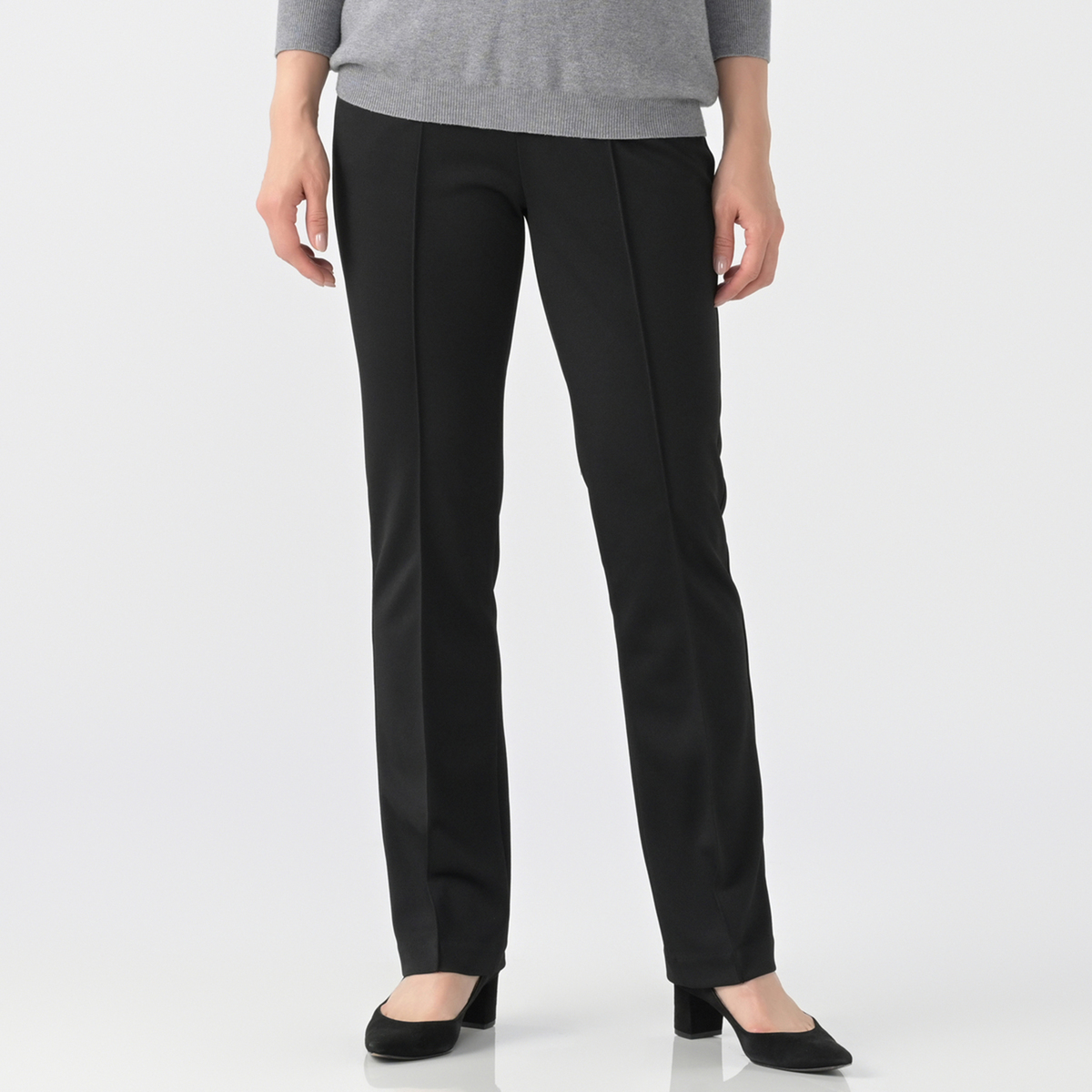 極細ピンタックを施したストレートシルエットのパンツ。縦のラインを強調し、細見えと脚長効果が期待できます。後ろダーツで立体的なヒップを設計し、飾り片玉縁ポケットはヒップを高く見せる位置に配置。ウエストは全体にゴムが入っているので着脱もスムーズです