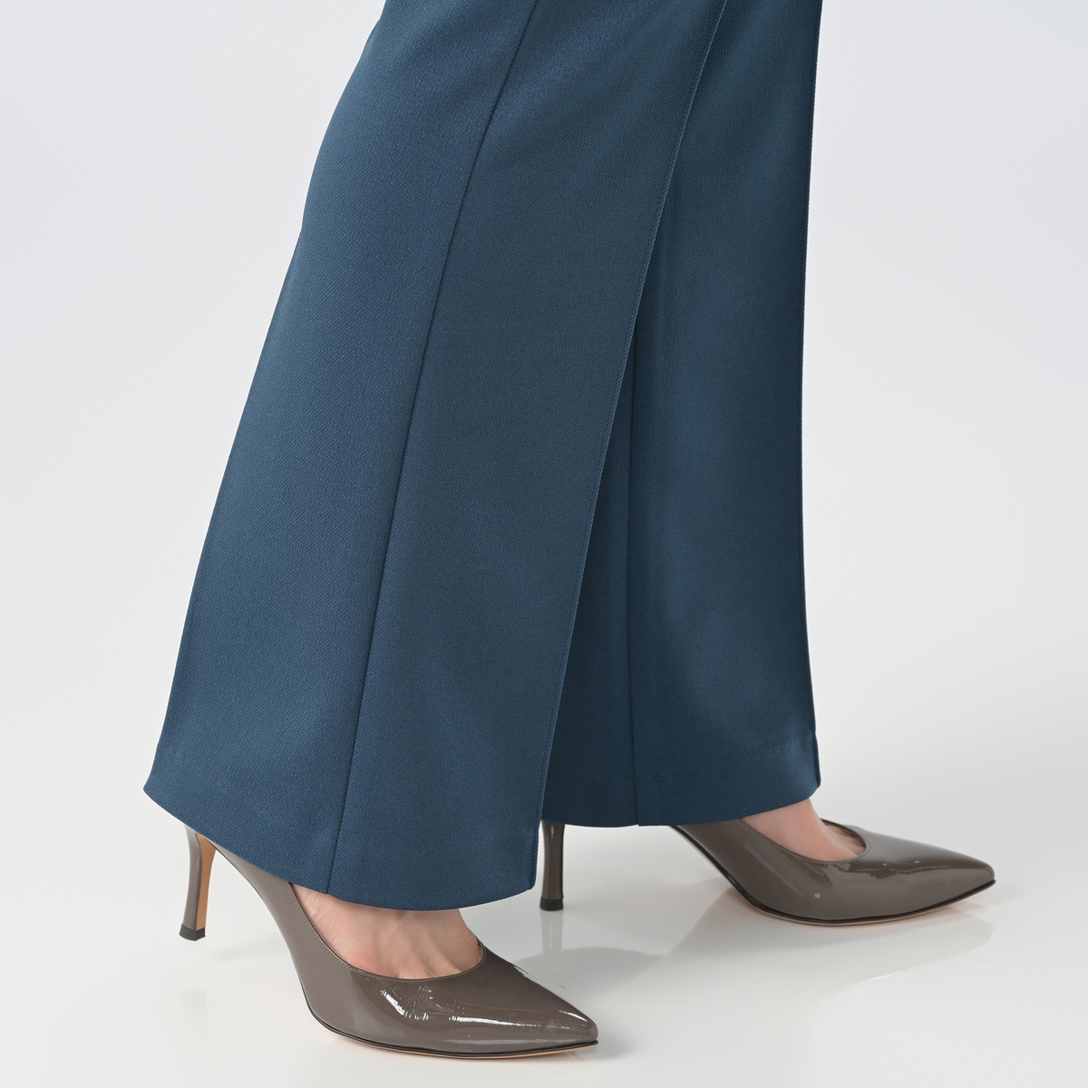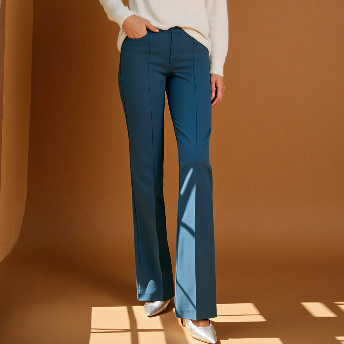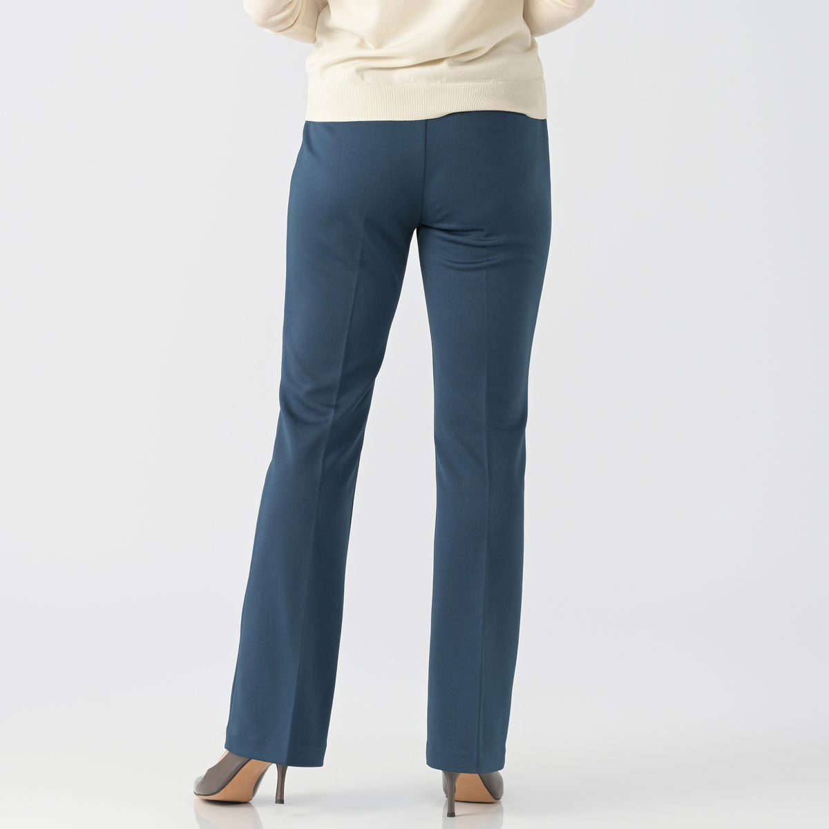 パンツ専門工場で完成度にこだわっておつくりした、大人のブーツカットパンツです。極細ピンタックが縦のラインを強調し、細見えと脚長効果が期待できます。フェイク前開きのステッチ入りできちんとした印象も。後ろダーツで立体的なヒップを設計し、ヒップを高く見せる飾り片玉縁ポケットも配置しました