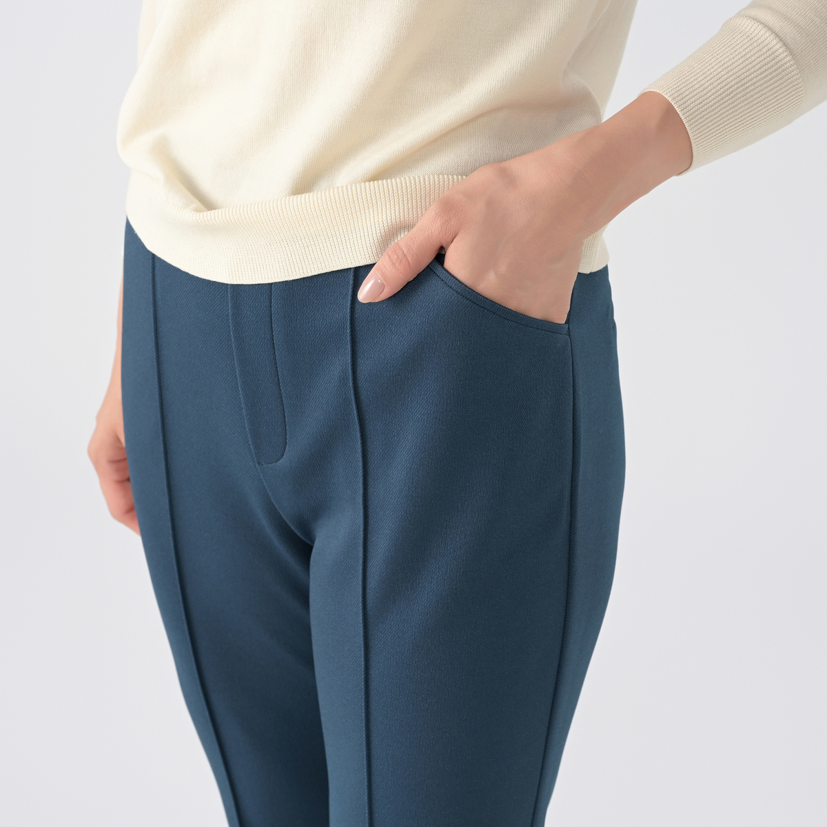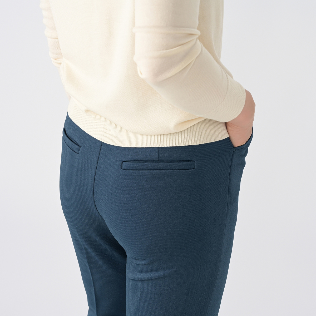 ウエストは全体にゴムが入り、脱ぎ穿きも簡単。ギャザーがよらないのですっきりとした印象です。素材には独特の膨らみ感のある帝人フロンティア株式会社のキルチナ(R)NBを使用。ポリウレタンにはしなやかな伸びを持つ旭化成株式会社のロイカ(R)を使用し、快適な穿き心地です