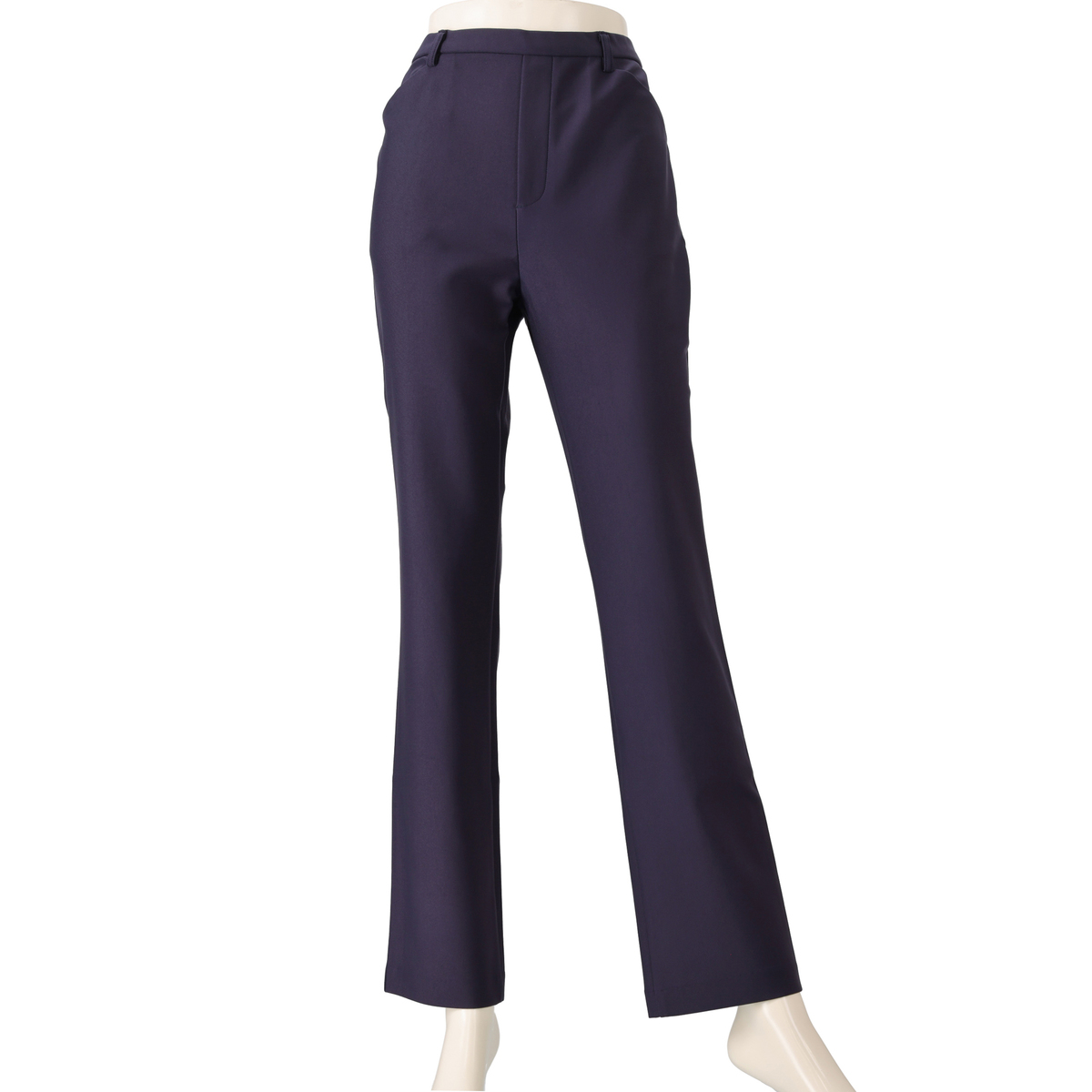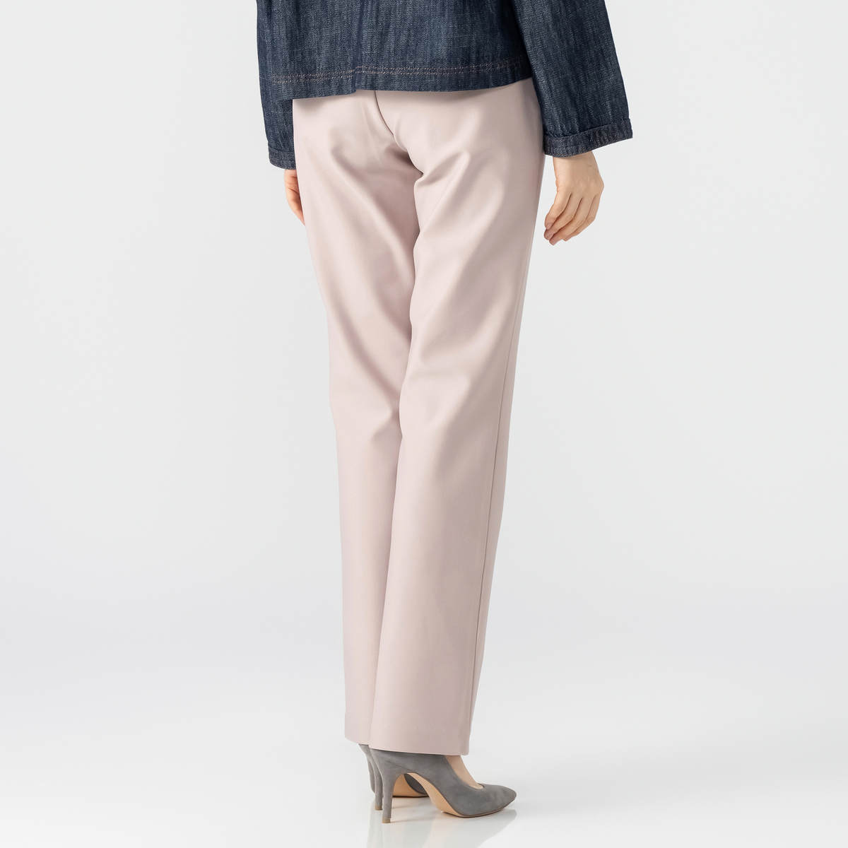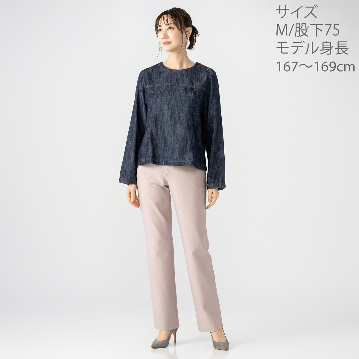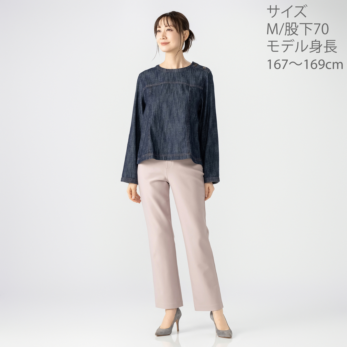 フェイク前開きのステッチを入れた、きちんとした印象のストレートパンツ。後ろダーツでヒップを立体的に見せ、飾り片玉縁ポケットの配置がヒップを高く演出します。ギャザーのないウエストはすっきりと見え、膝から裾までバランスの取れた美しいラインが魅力です