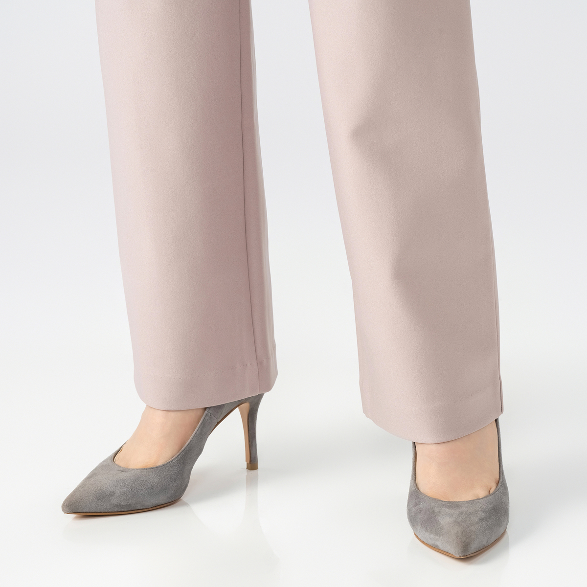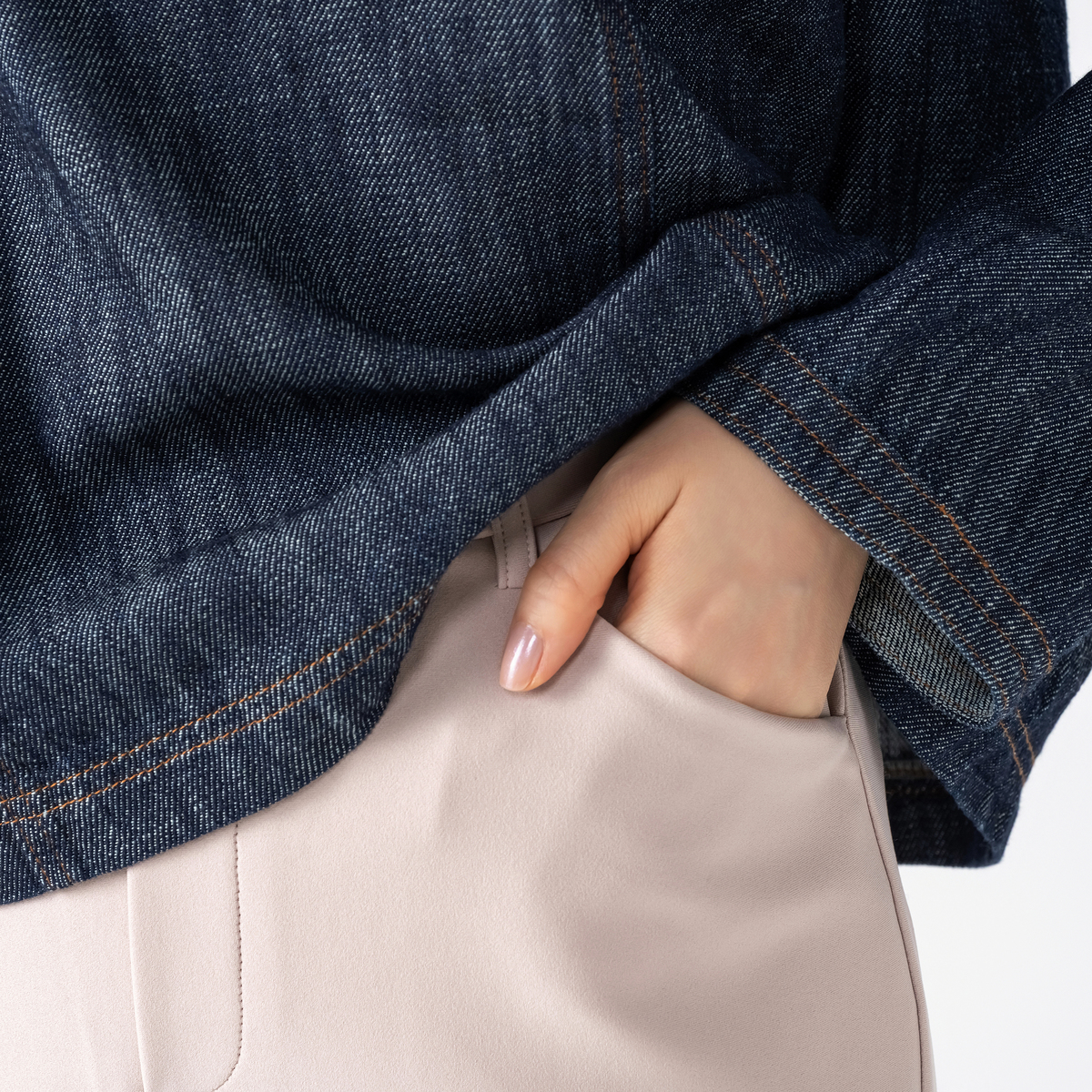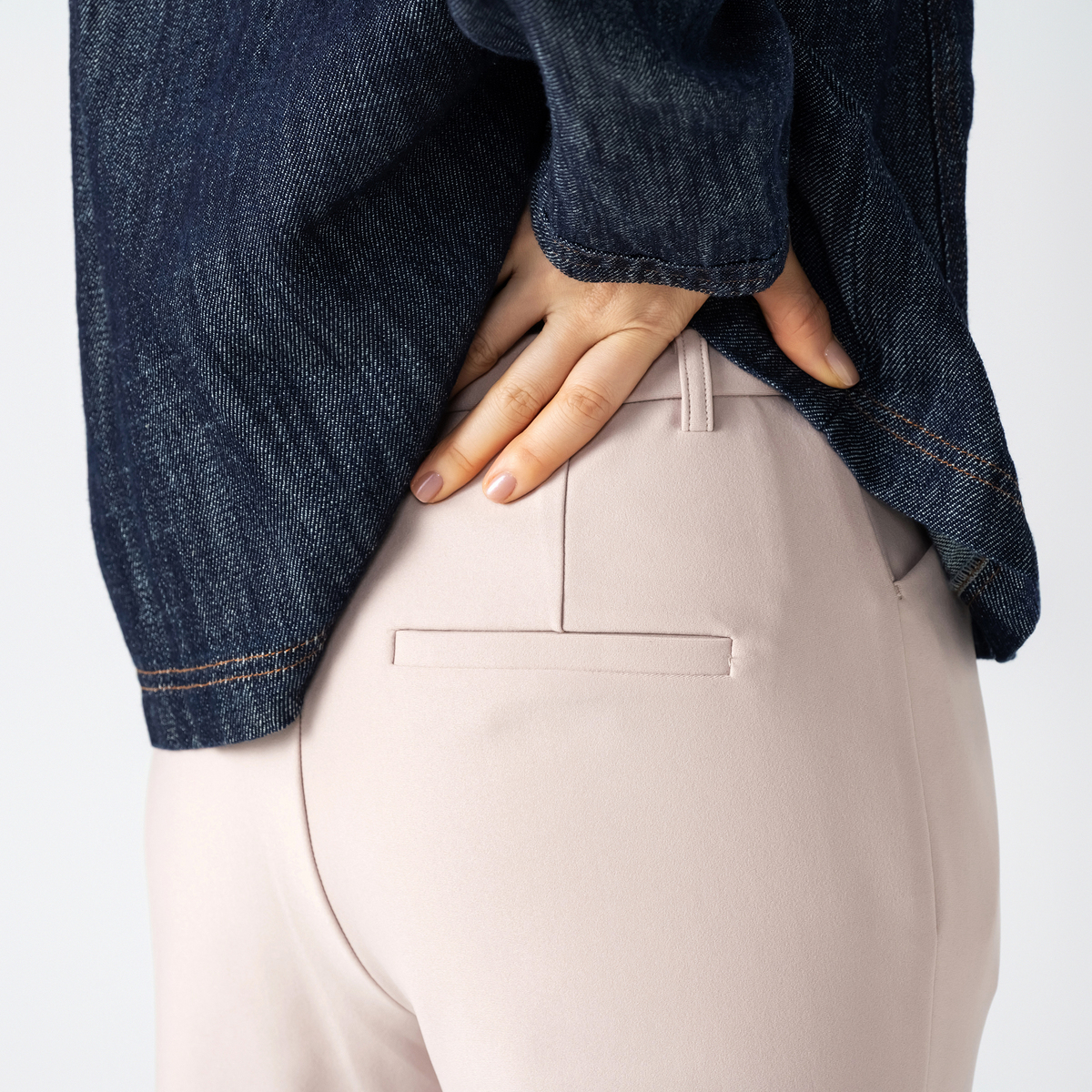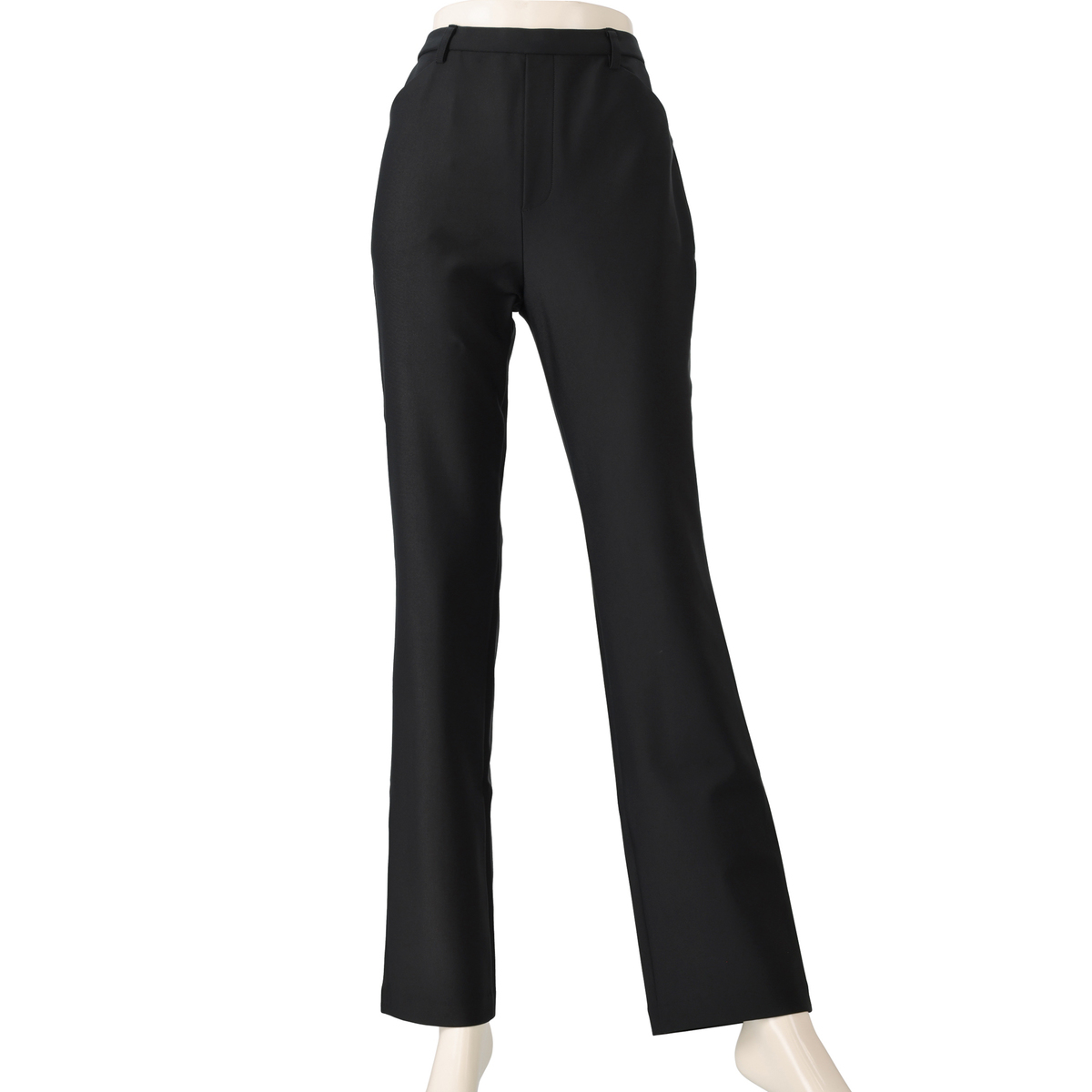 フェイク前開きのステッチを入れた、きちんとした印象のストレートパンツ。後ろダーツでヒップを立体的に見せ、飾り片玉縁ポケットの配置がヒップを高く演出します。ギャザーのないウエストはすっきりと見え、膝から裾までバランスの取れた美しいラインが魅力です