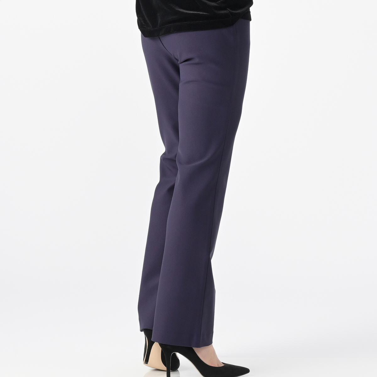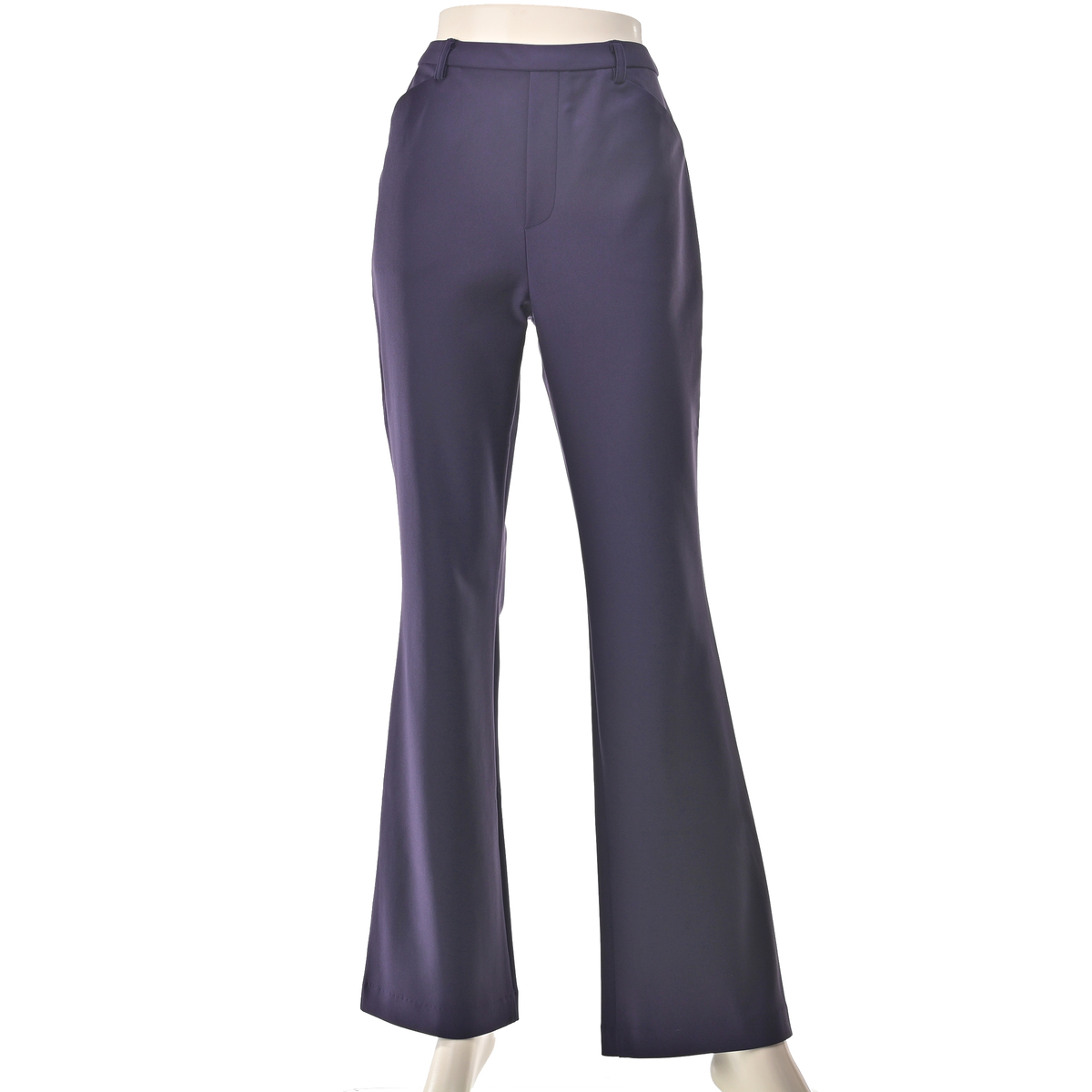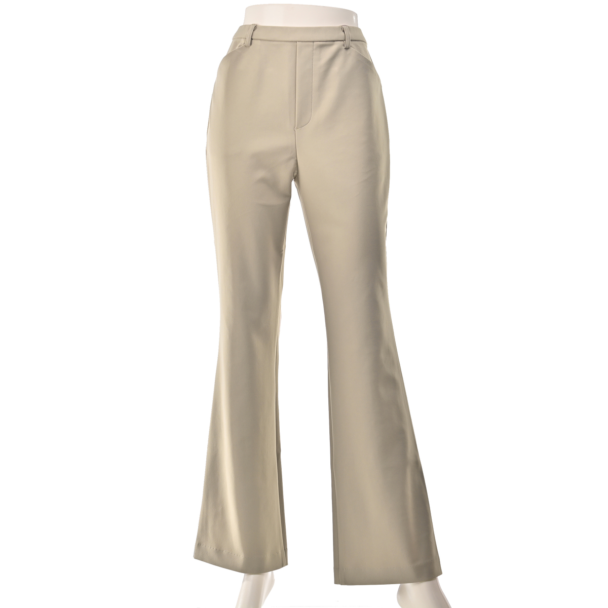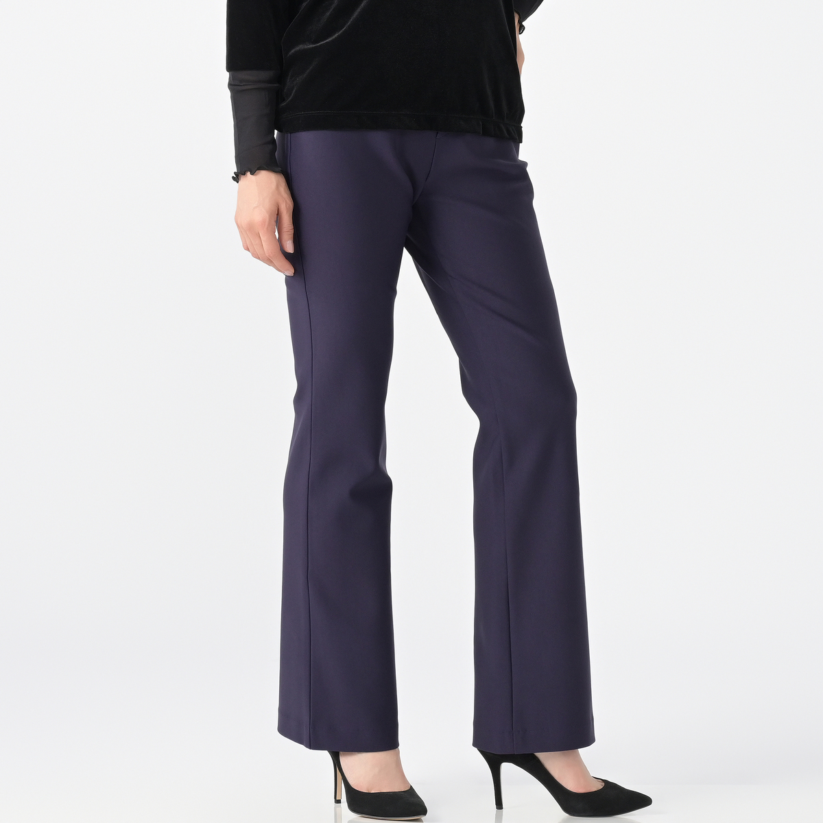 膝と裾バランスの美しいブーツカットシルエットのパンツ。前はフェイク開きのステッチ入りできちんと感も。後ろはダーツで立体的なヒップを設計し、飾り片玉縁ポケットはヒップを高く見せる位置に配置。ゴム入りのウエストはギャザーがよらず、すっきりとした印象です