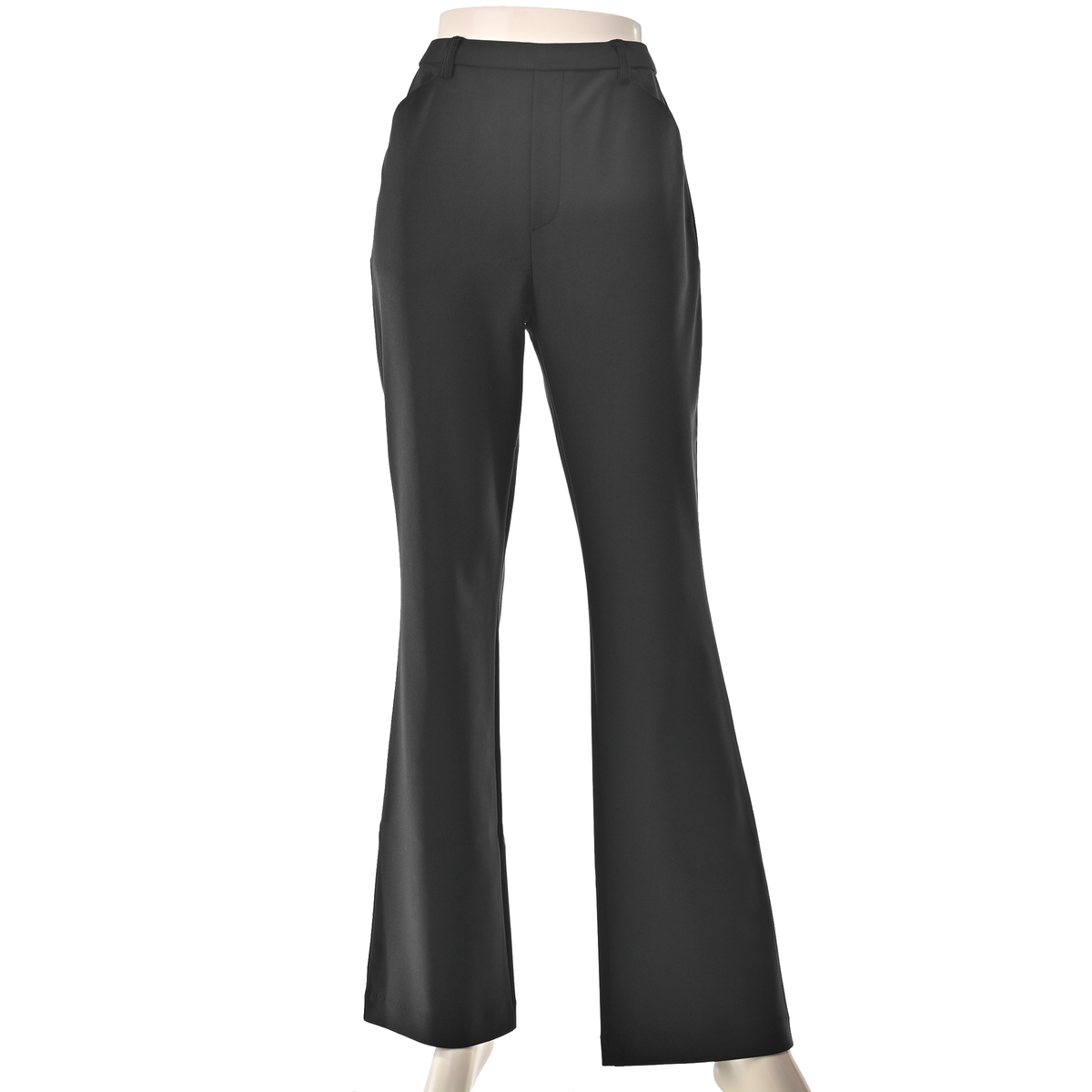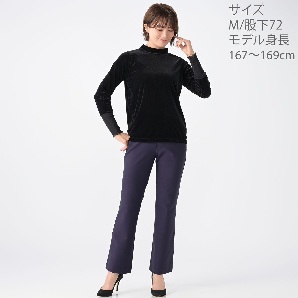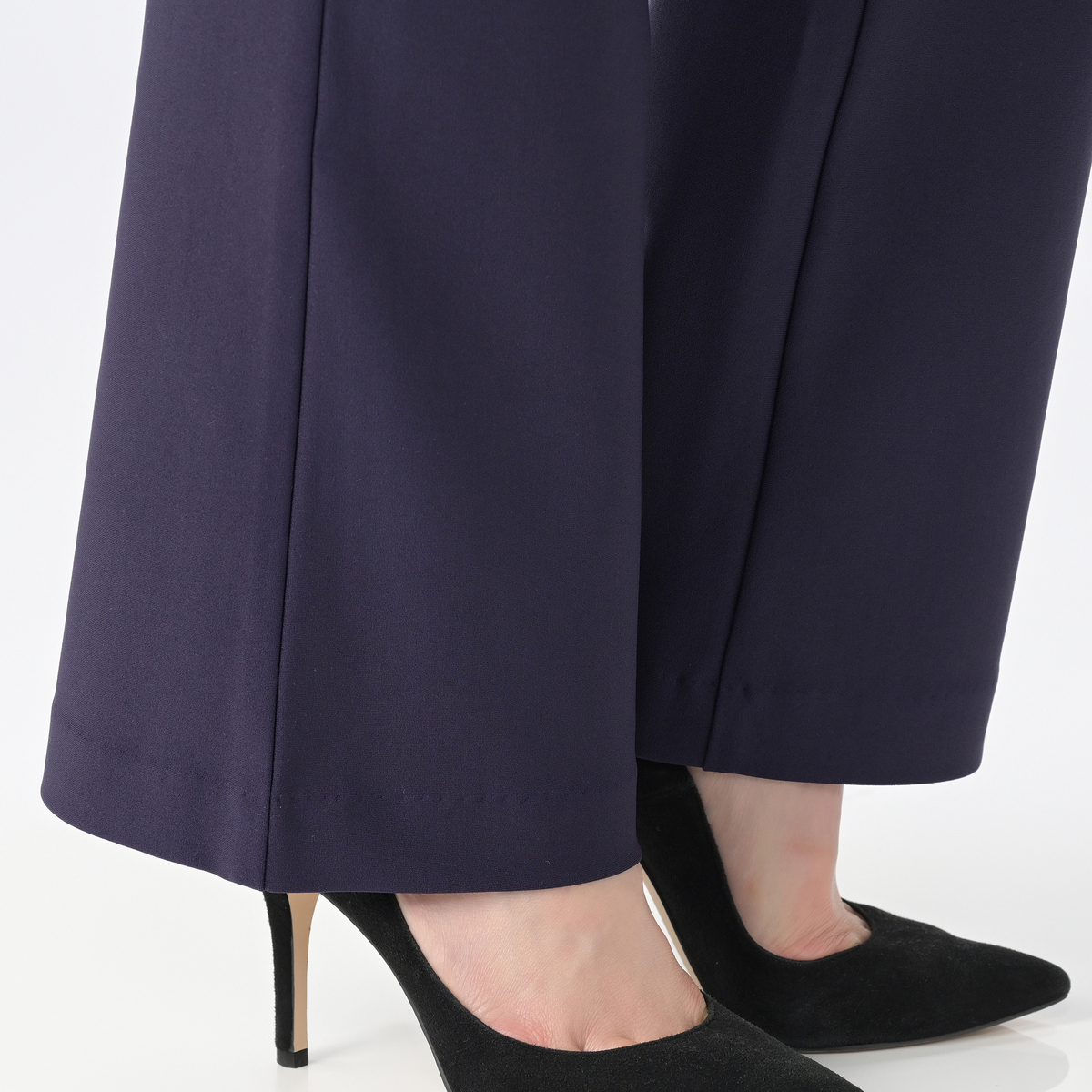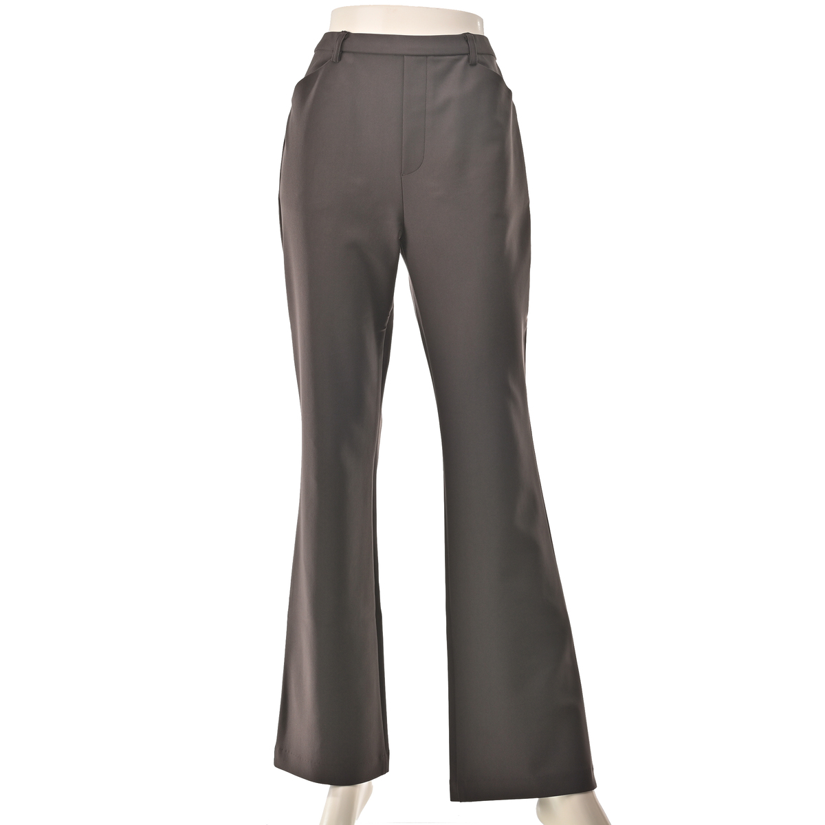膝と裾バランスの美しいブーツカットシルエットのパンツ。前はフェイク開きのステッチ入りできちんと感も。後ろはダーツで立体的なヒップを設計し、飾り片玉縁ポケットはヒップを高く見せる位置に配置。ゴム入りのウエストはギャザーがよらず、すっきりとした印象です