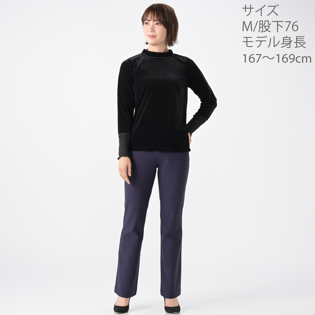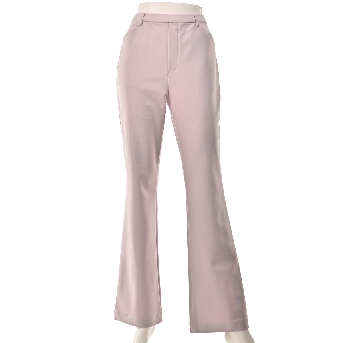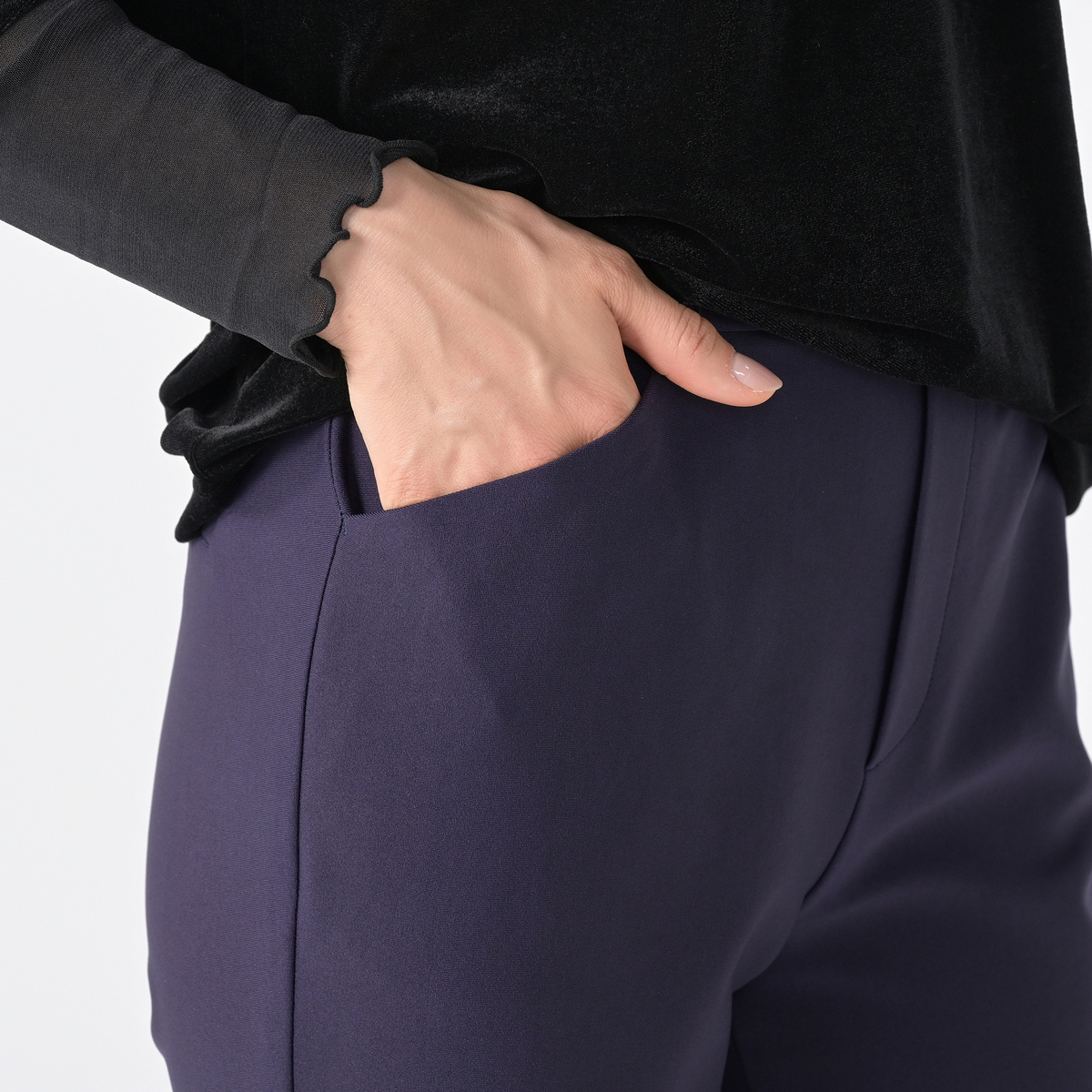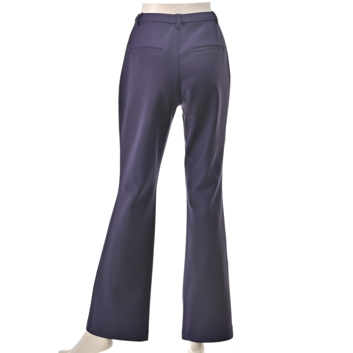 膝と裾バランスの美しいブーツカットシルエットのパンツ。前はフェイク開きのステッチ入りできちんと感も。後ろはダーツで立体的なヒップを設計し、飾り片玉縁ポケットはヒップを高く見せる位置に配置。ゴム入りのウエストはギャザーがよらず、すっきりとした印象です